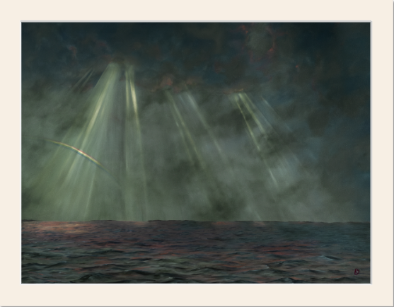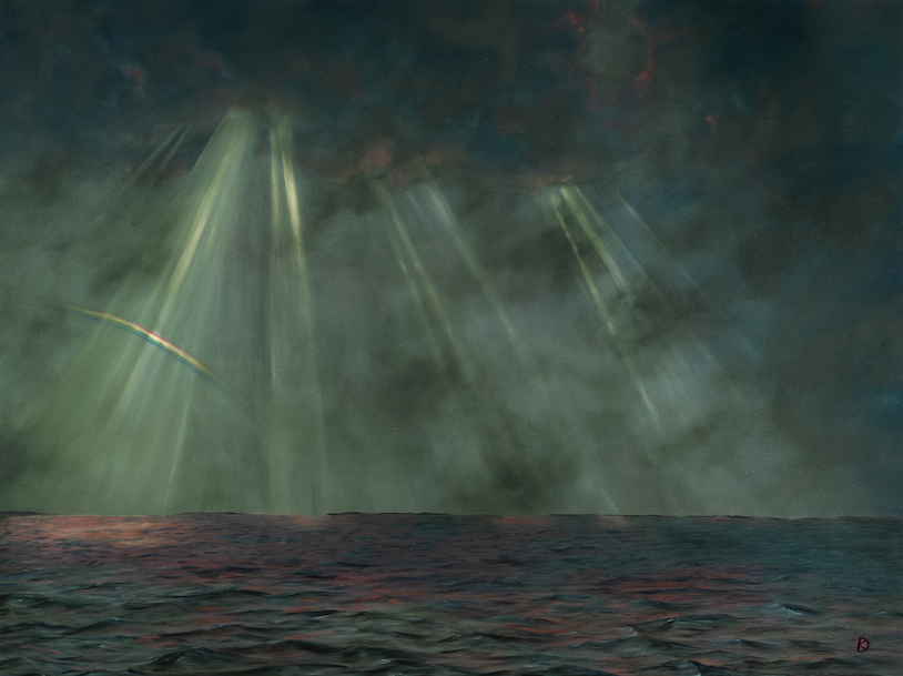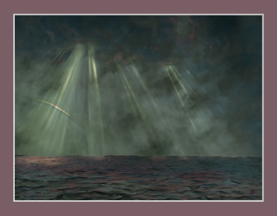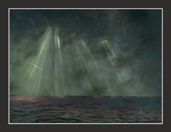 I wanted an ethereal scene that showed a rainbow illuminated by sunlight breaking through a storm. While rainbows generally begin to disappear when the sun hits them, I wanted the rainbow to be constant and solid, a reminder to the viewer that love doesn't disappear just because it may not be physically tangible anymore.