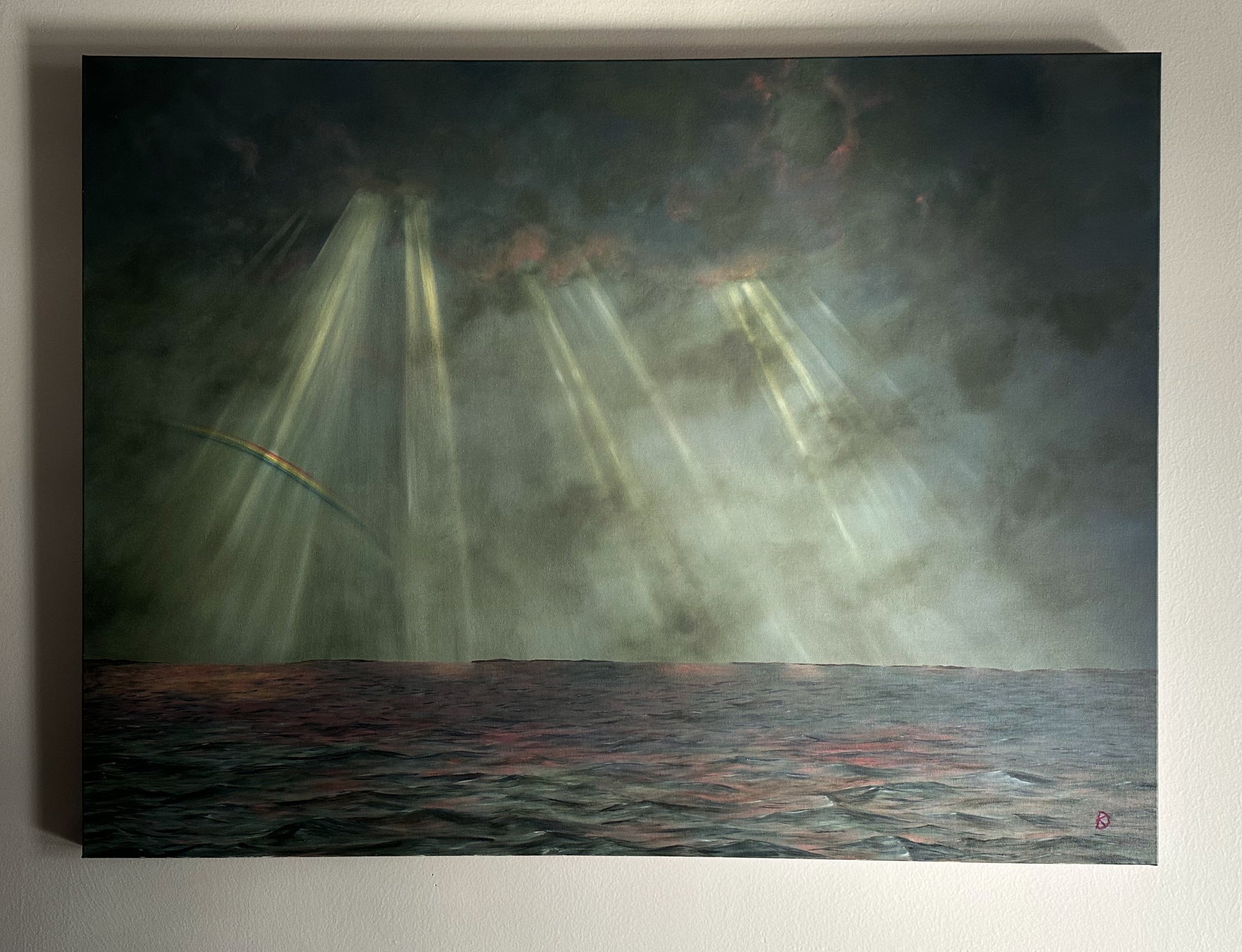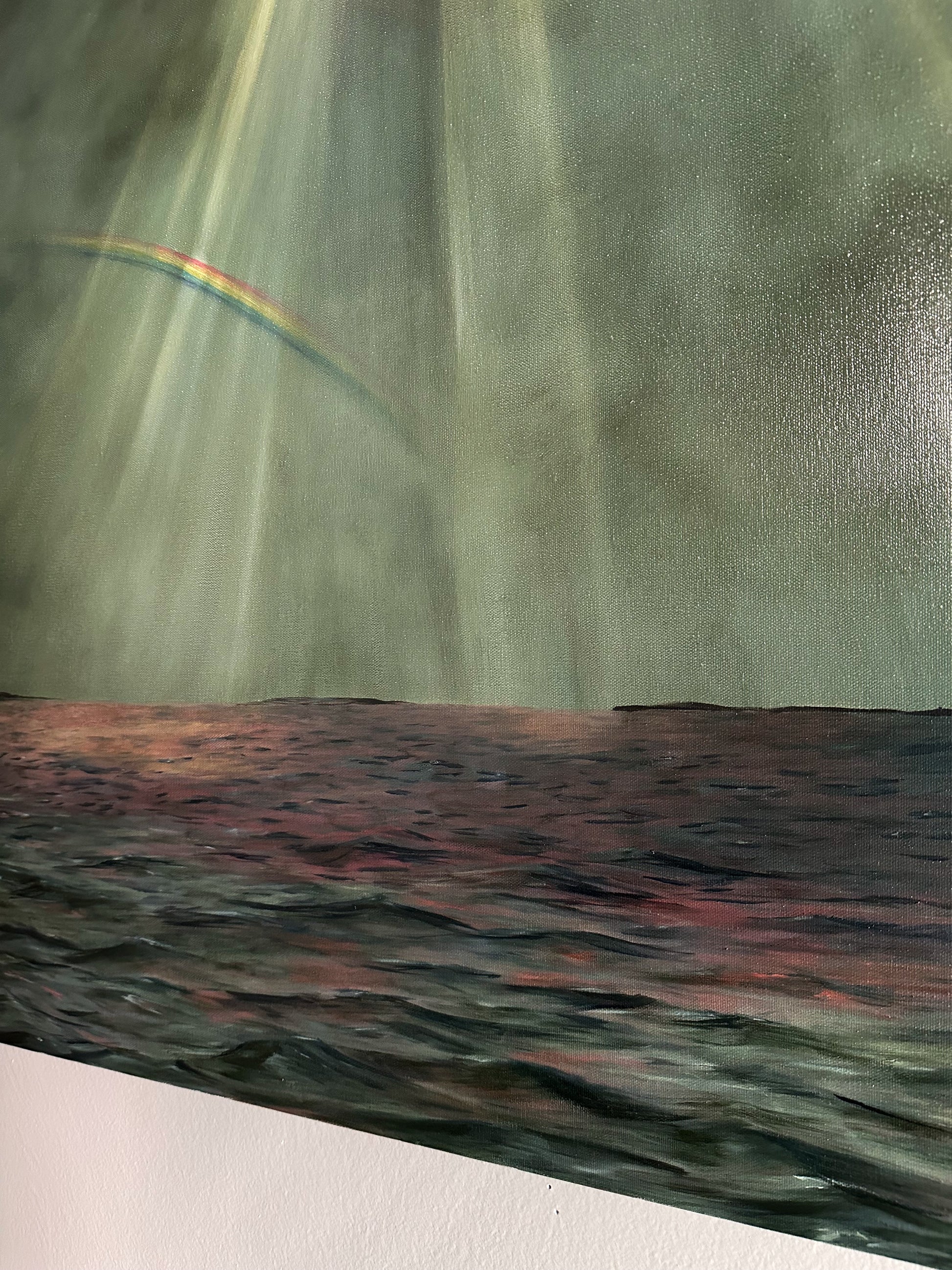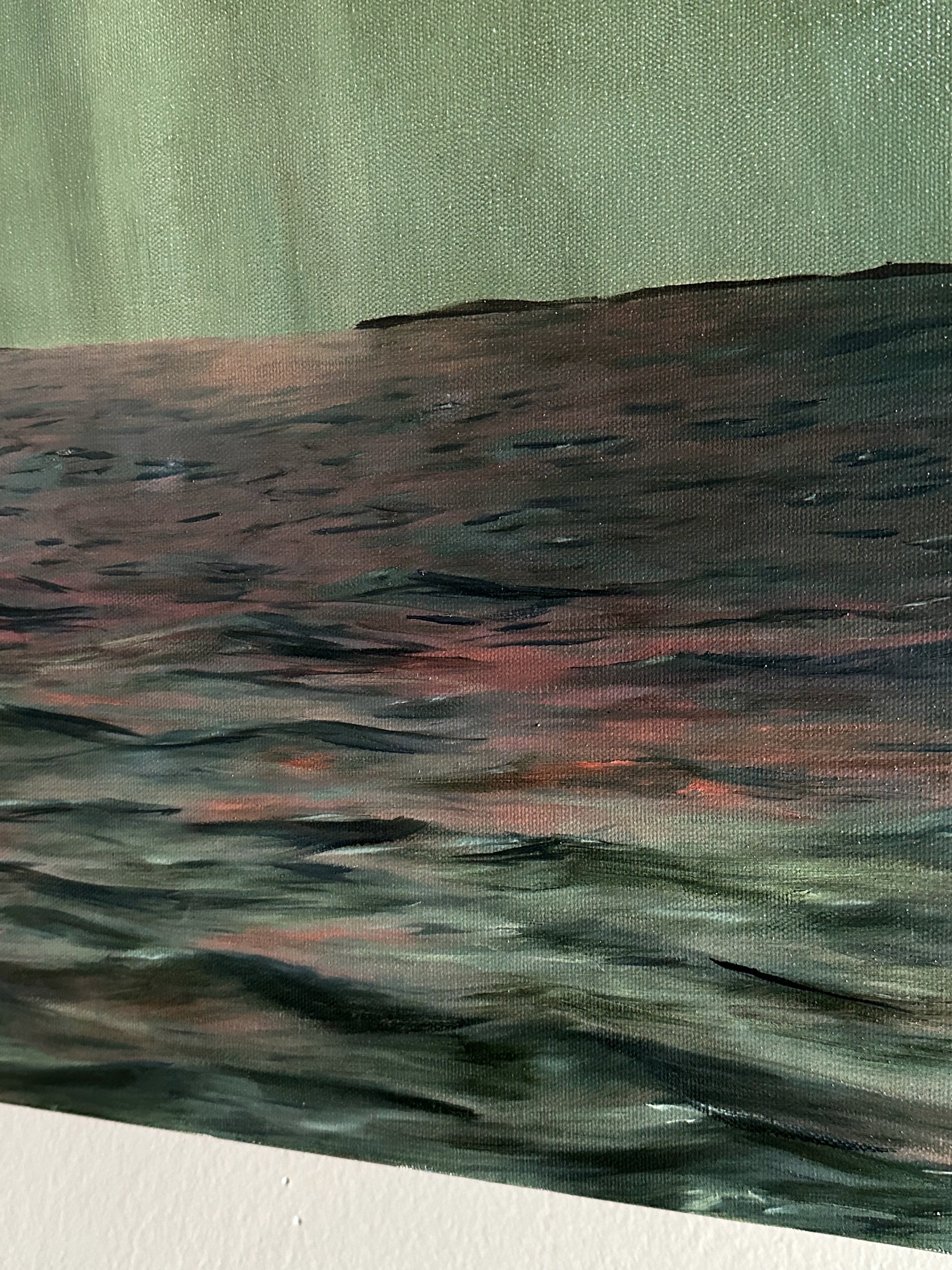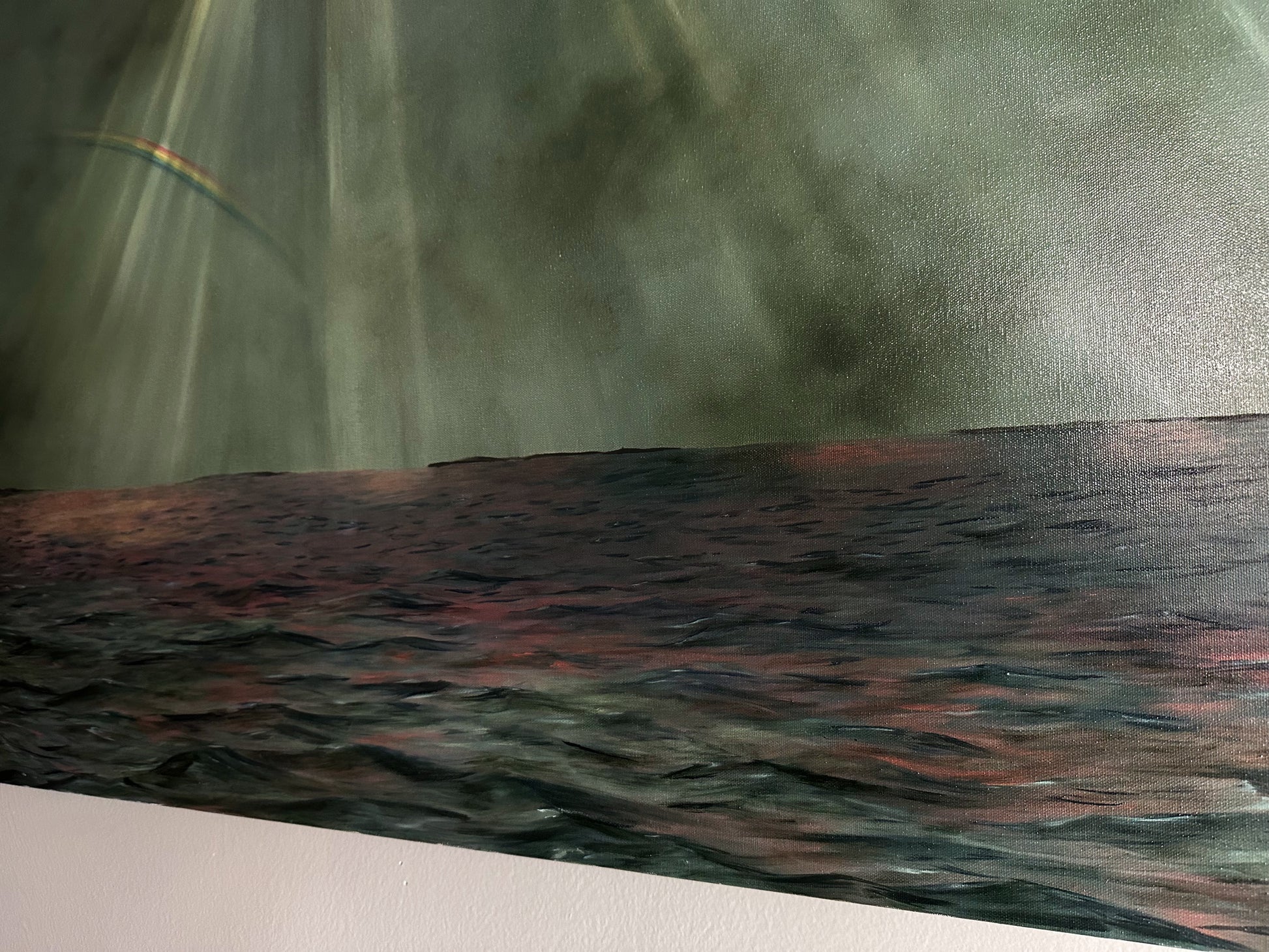 This painting features a phenomenon that I'm not quite sure how it happened... it appears to color shift at different angles, especially the choppy sea. The pinks are subtle from straight-on, but become more intense or more desaturated as you move around the room.
