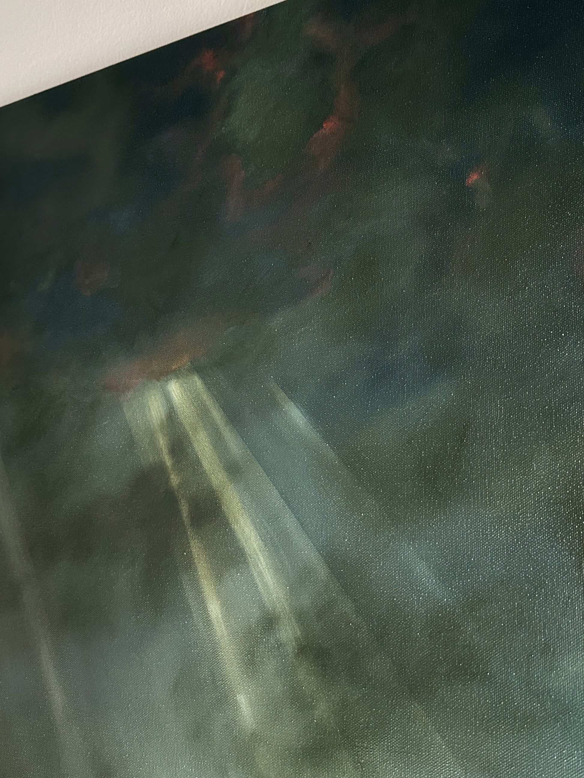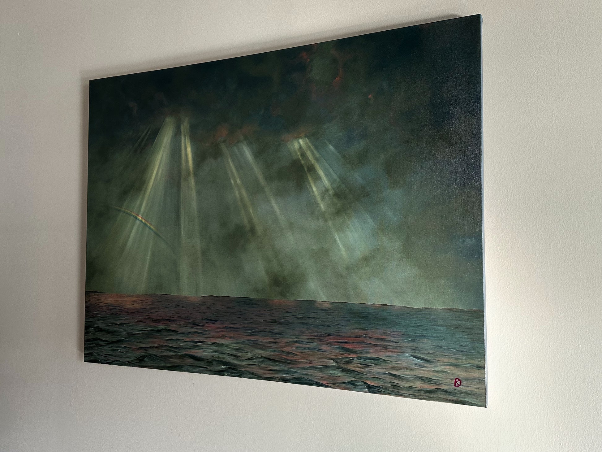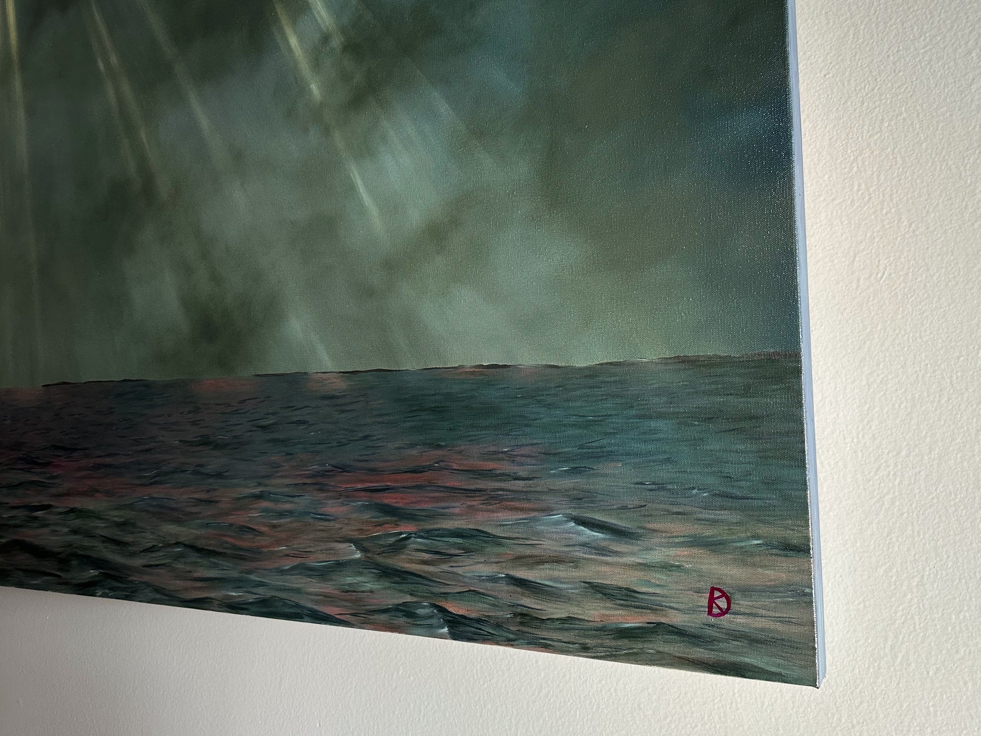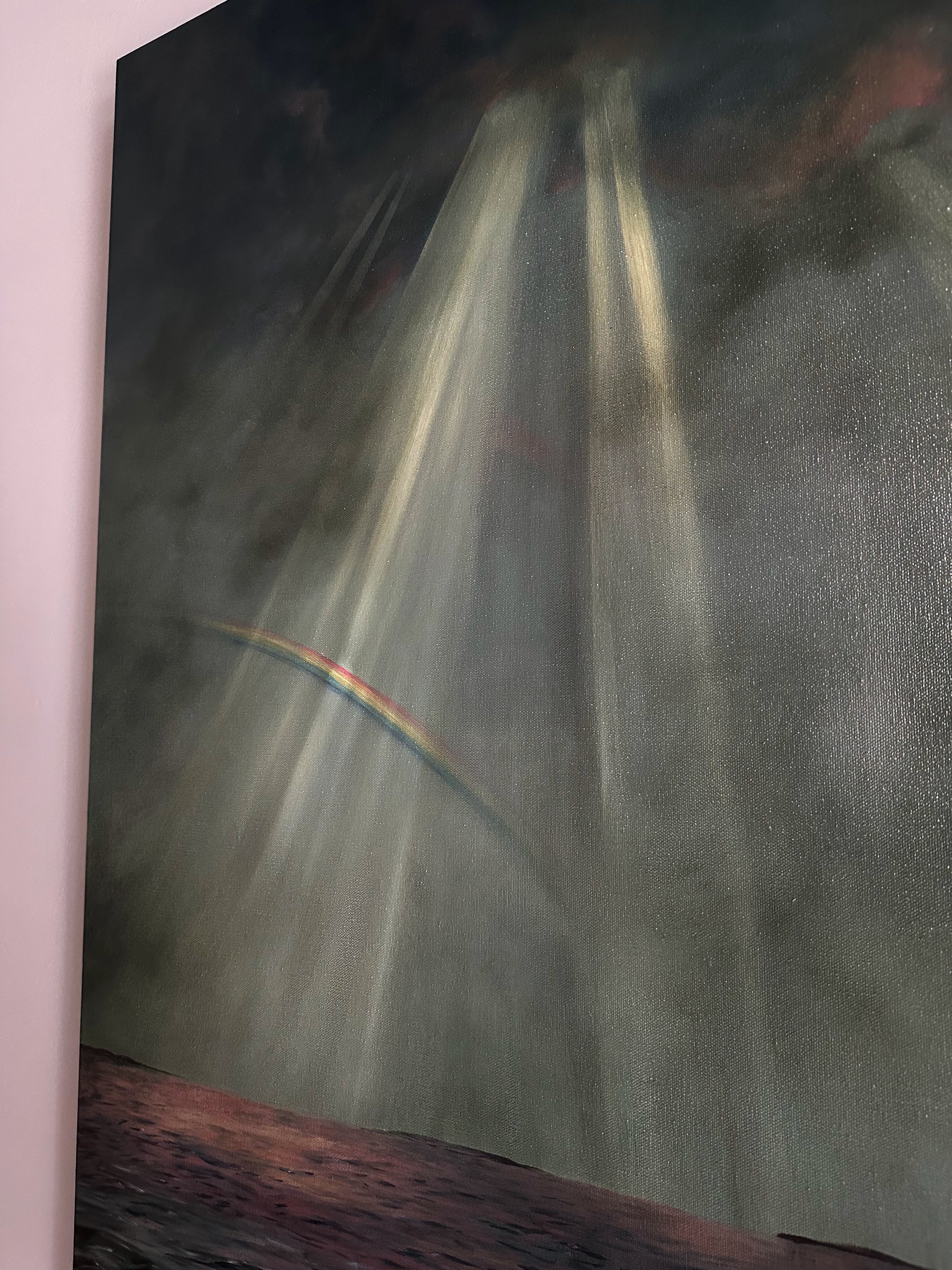 This painting features a phenomenon that I'm not quite sure how it happened... it appears to color shift at different angles, especially the choppy sea. The pinks are subtle from straight-on, but become more intense or more desaturated as you move around the room.