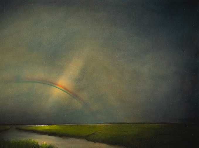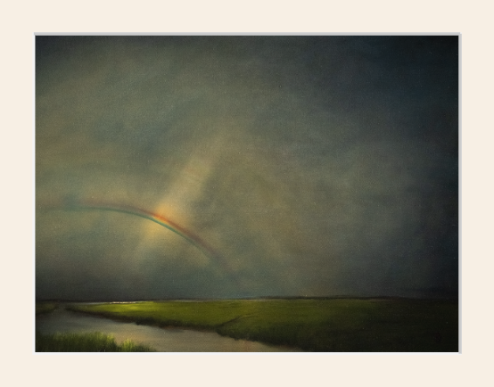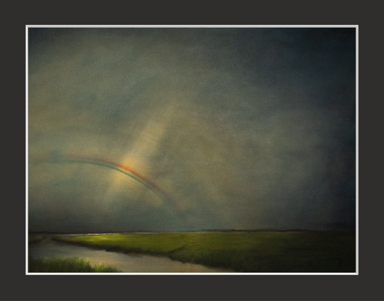 I wanted an ethereal scene that showed a rainbow illuminated by a spot of bright light in an otherwise dark scene. I love that the light appears as if a bit of sunlight from a nearby window is making the bright spot but it's actually the paint. I've attempted for years to achieve this, and had a breakthrough with this painting. This one took me many months, and many layers of corrections and over-painting to get it 'right.'