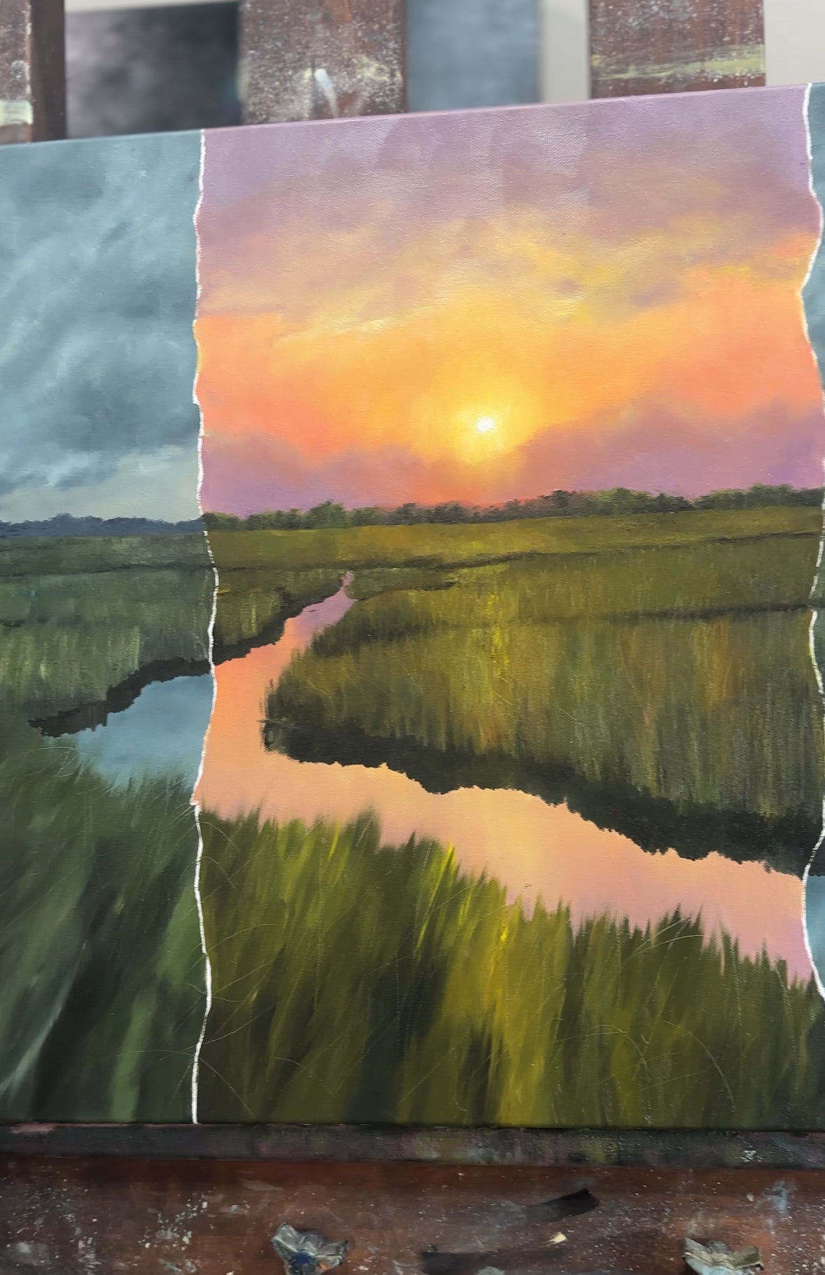 Oil on deep canvas. 18" x 24" unframed with painted sides. Can be hung as-is.
