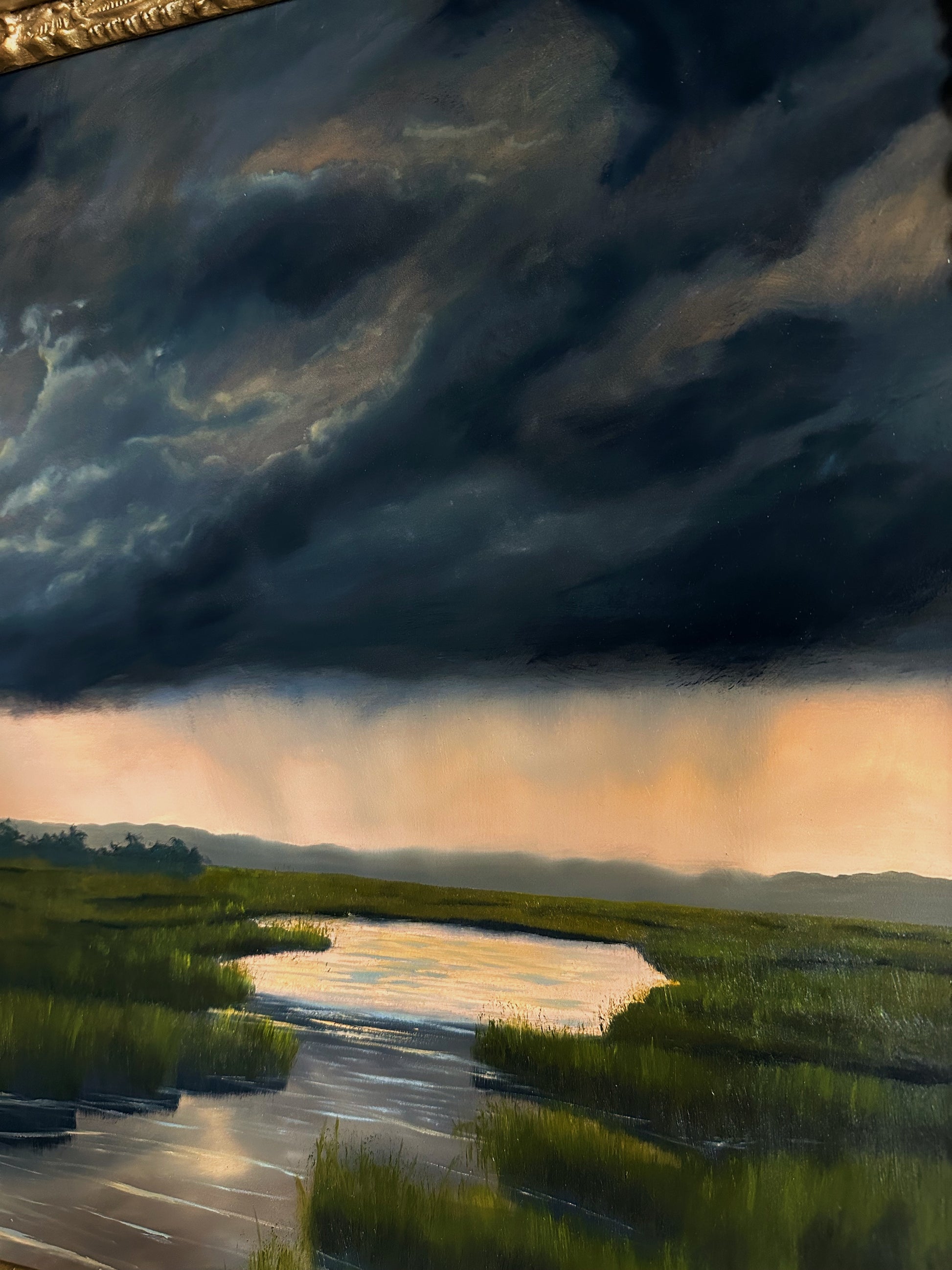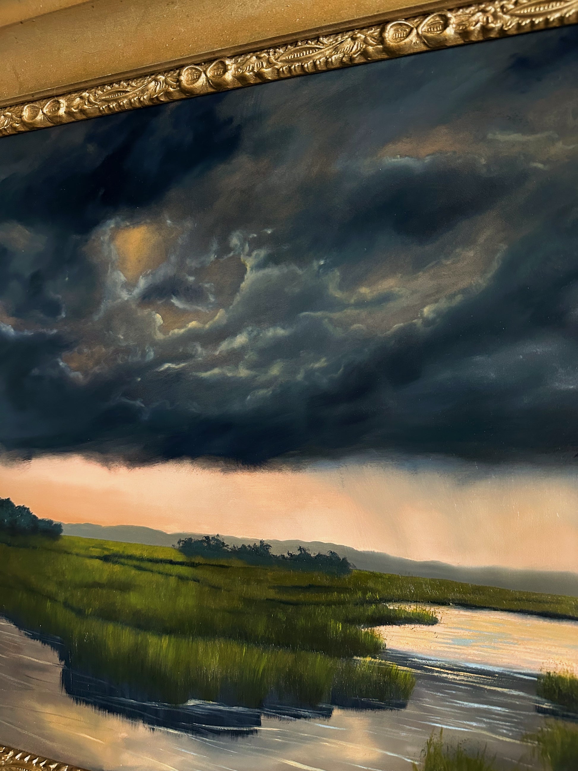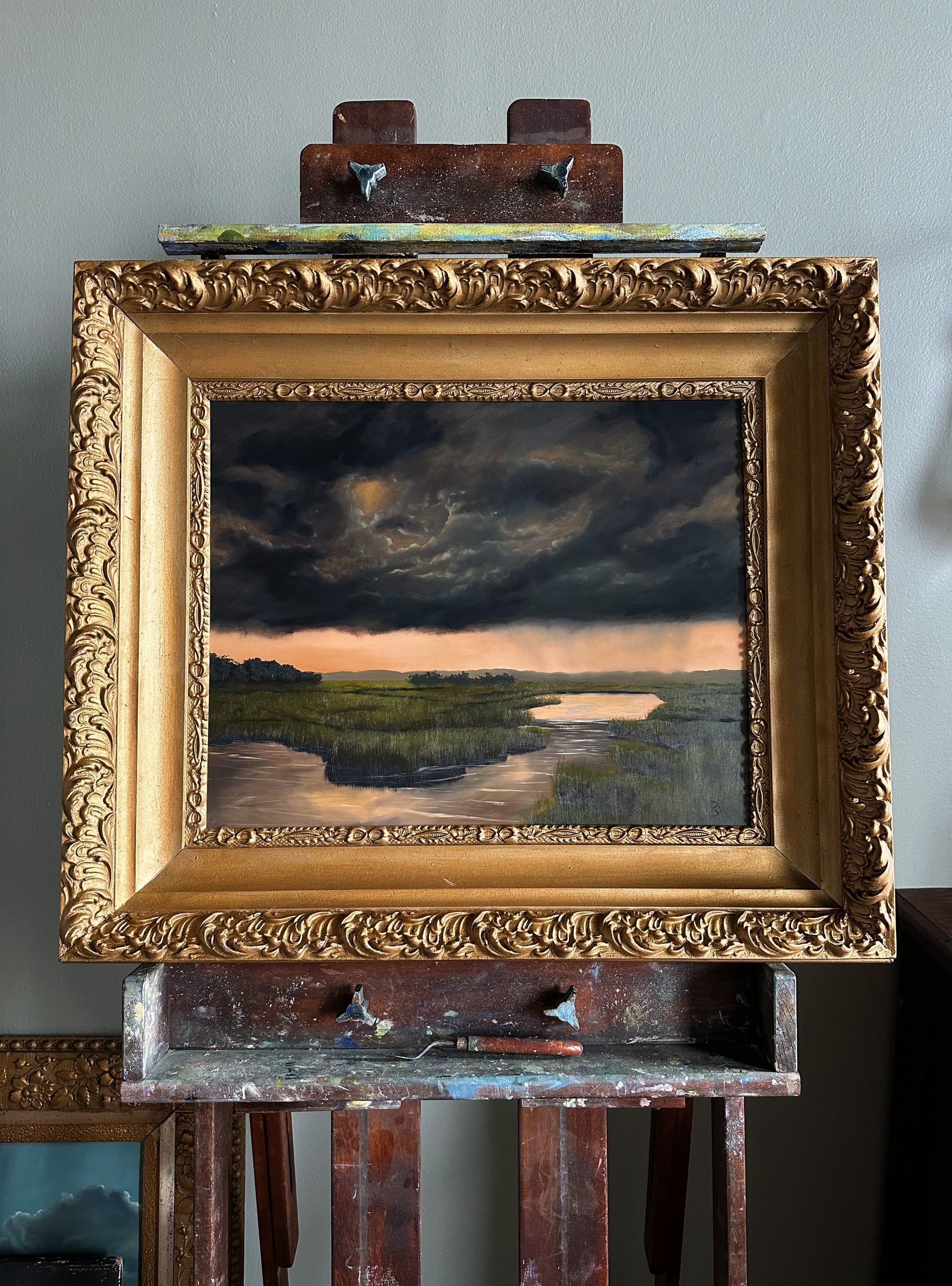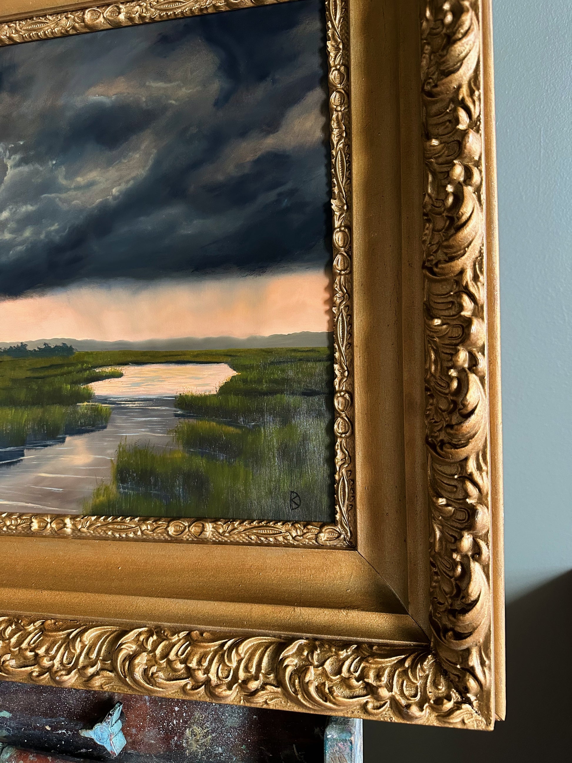 Oil on canvas panel, framed in a late 1800s frame. The frame features original, time-won character, adding to the overall charm of this piece. This scene was created specifically for this frame.