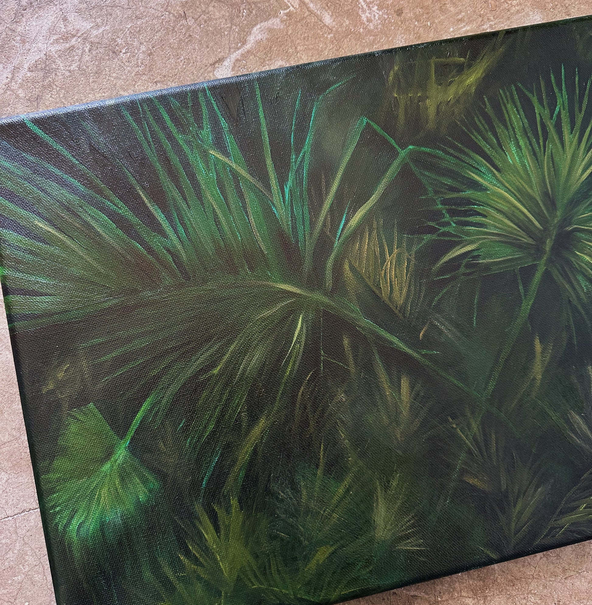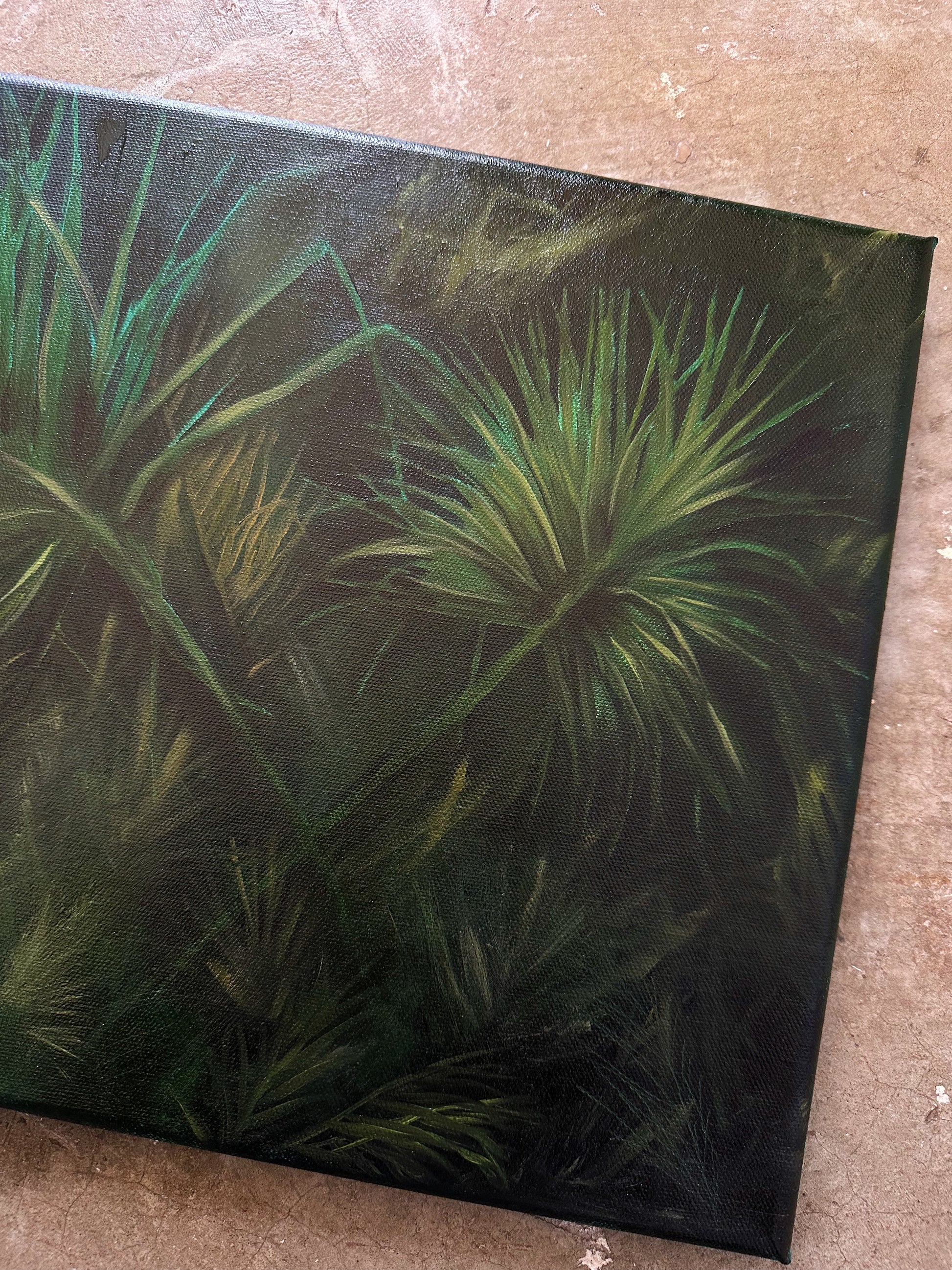 You can see the turquoise peeking out through the final layer, adding to the overall meaning. I recently visited a known Native American site here in my town and took reference photos of so many beautiful palm fronds. While it was cold out, and the sky was heavily overcast, the bright green palms seemed to sing and pop against the dreary background.