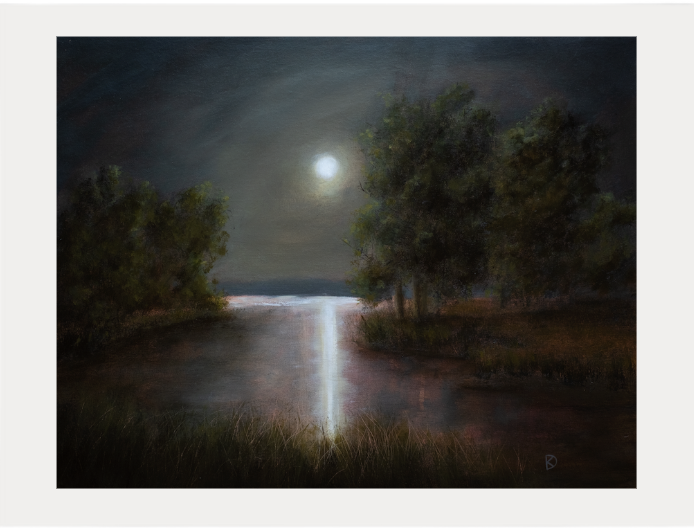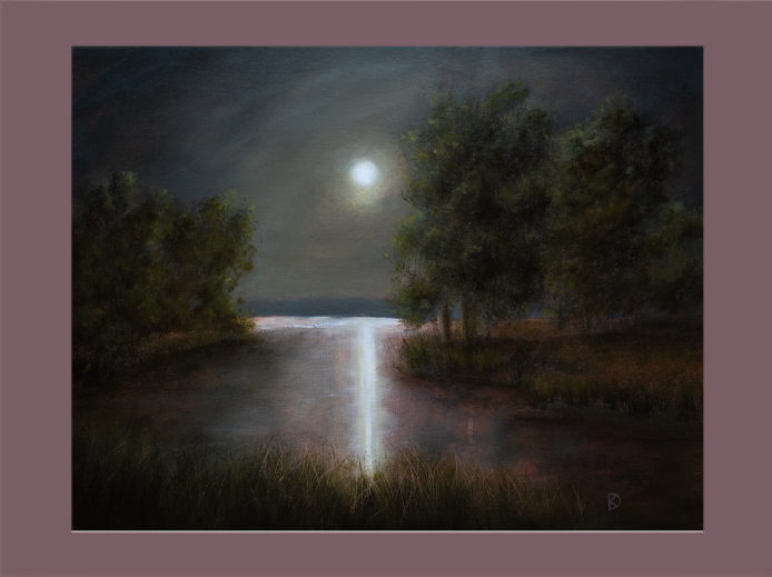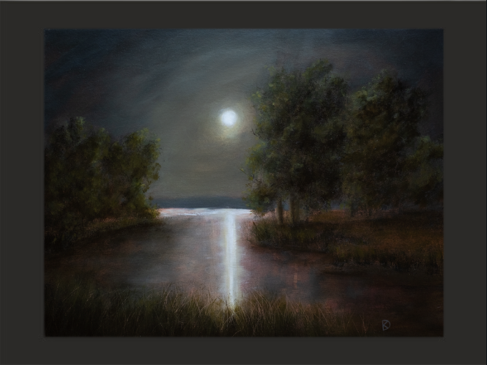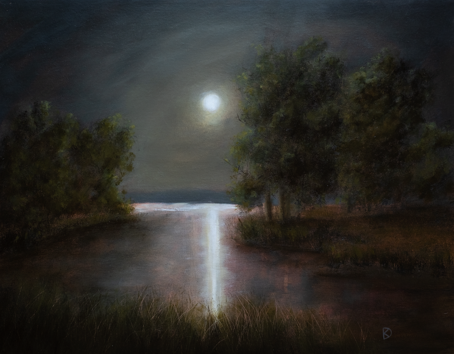 A bright moon reflects strongly on the water of a calm marsh. Original oil painting on canvas panel by Kayla DeVito. Named from the poem "Courage" by Olivia Ann Rose.