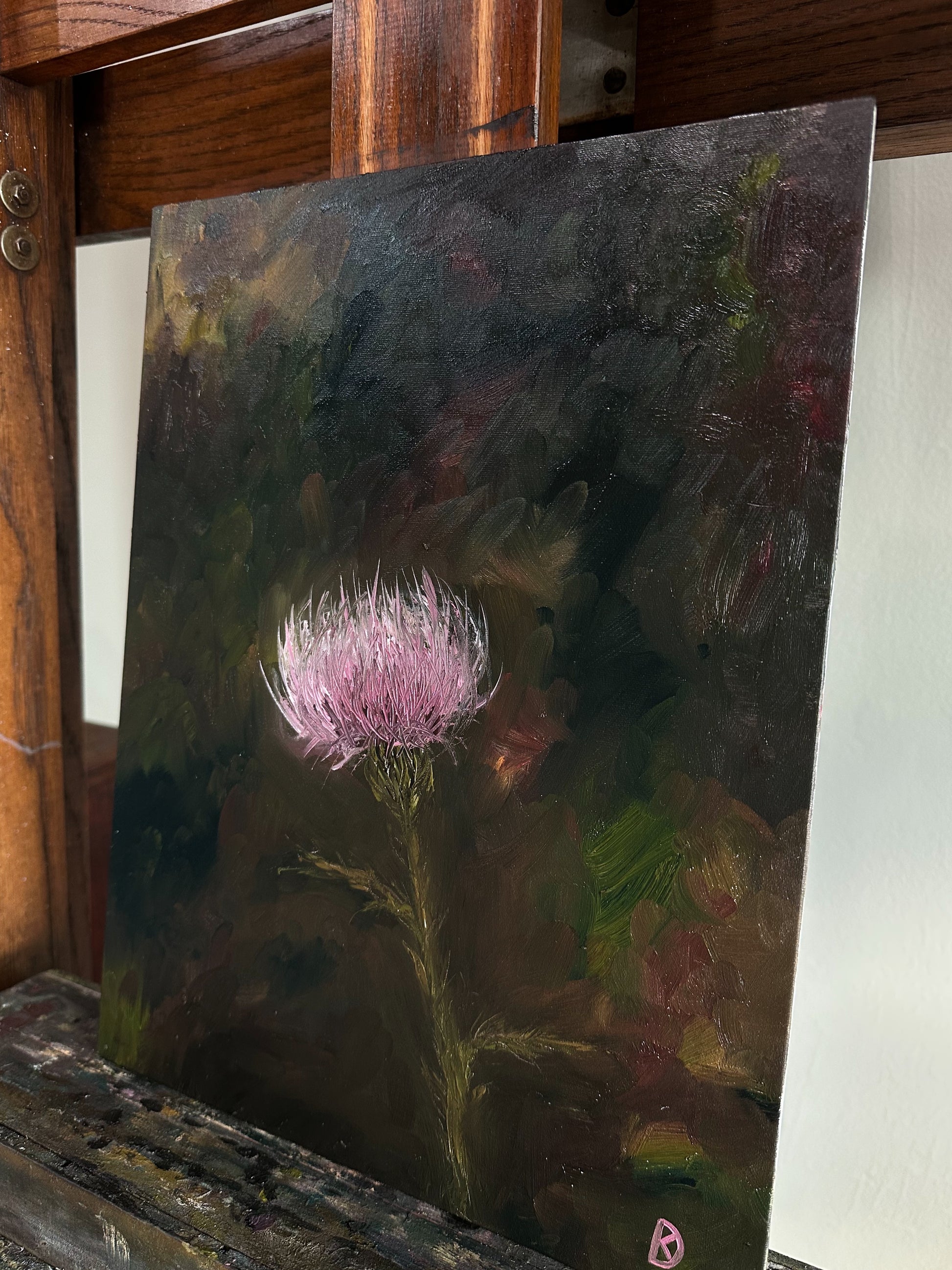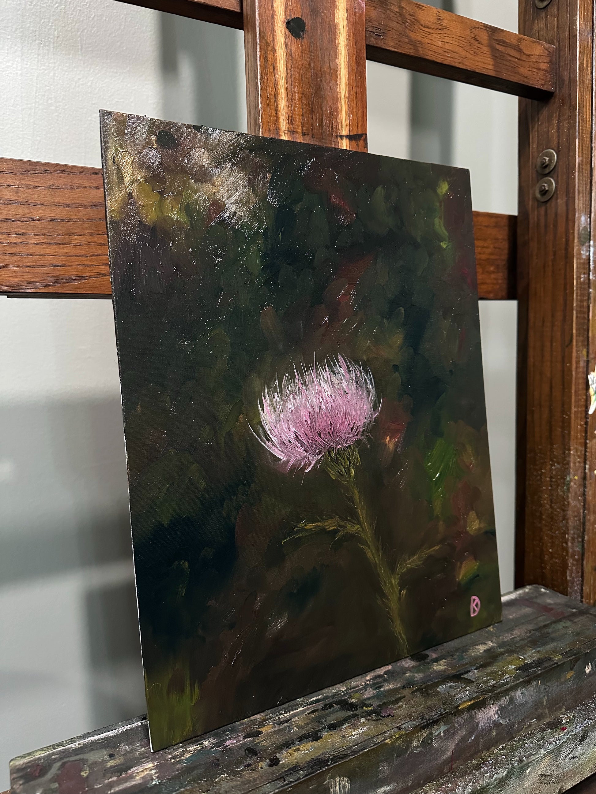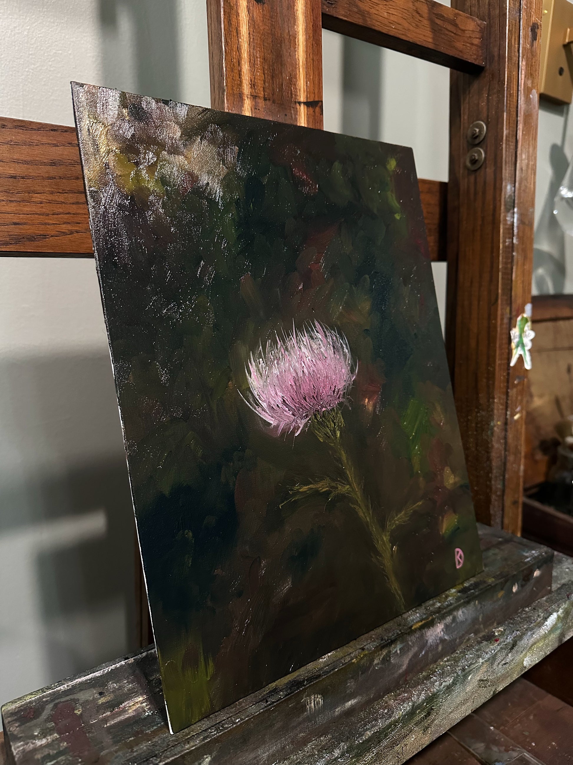 This is a study of my larger Defied the Storm painting. It's a palette knife painting, and a "love letter" of sorts to a place that will always feel like home to me- Scotland. I chose to create this thistle because it is the universal symbol of their nation, symbolizing strength and perseverance. How lovely!