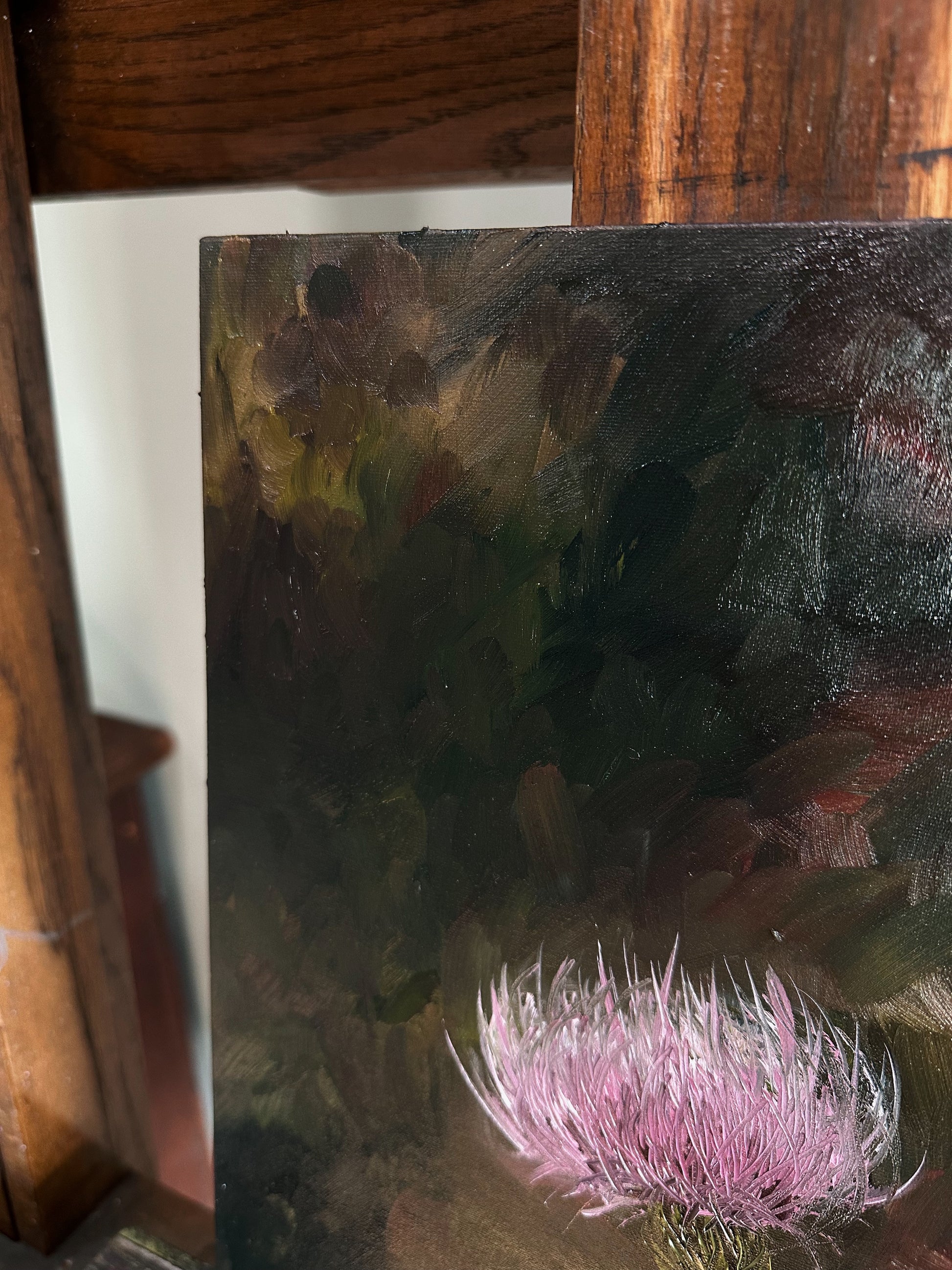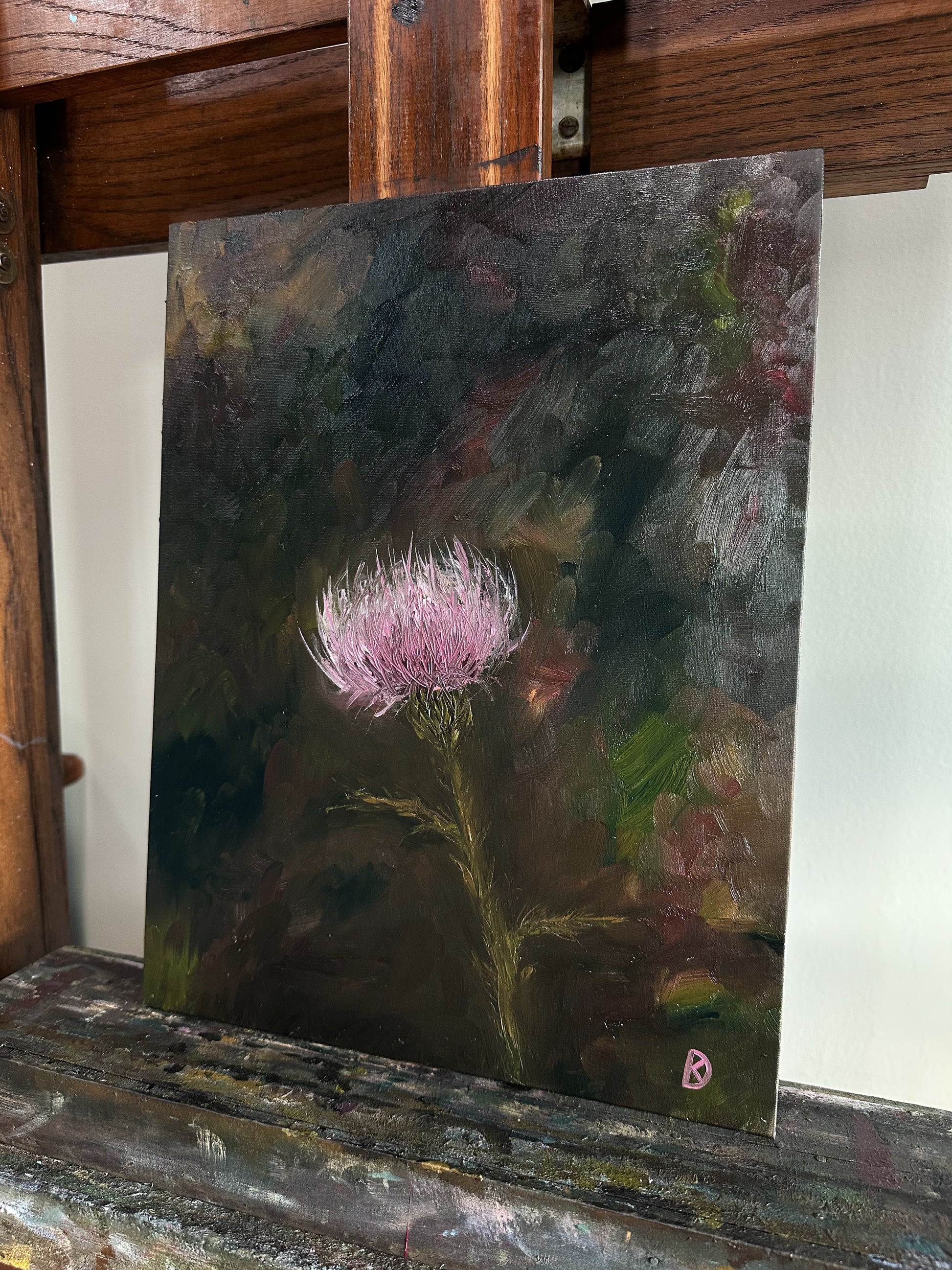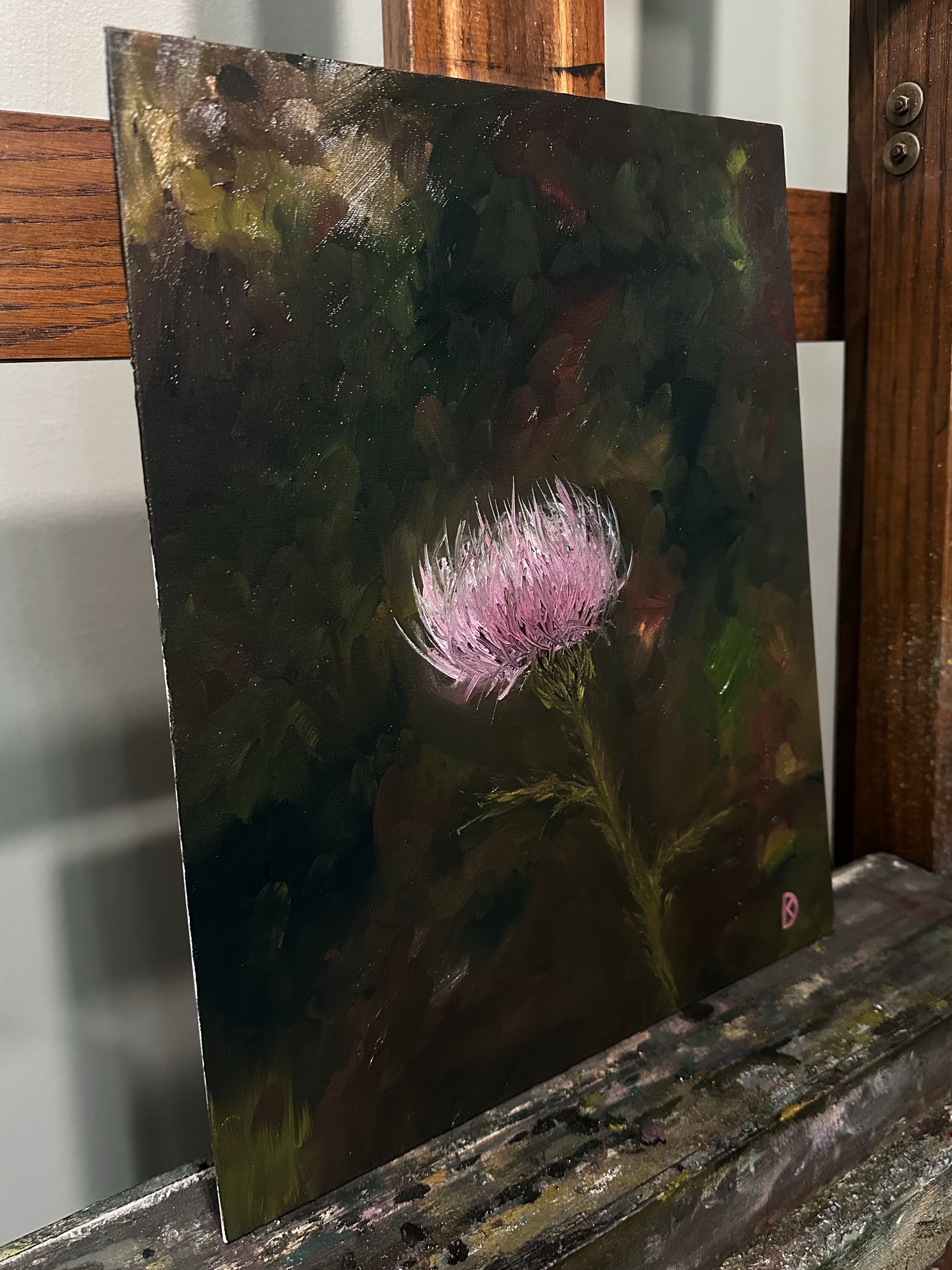 This is a study of my larger Defied the Storm painting. It's a palette knife painting, and a "love letter" of sorts to a place that will always feel like home to me- Scotland. I chose to create this thistle because it is the universal symbol of their nation, symbolizing strength and perseverance. How lovely!
