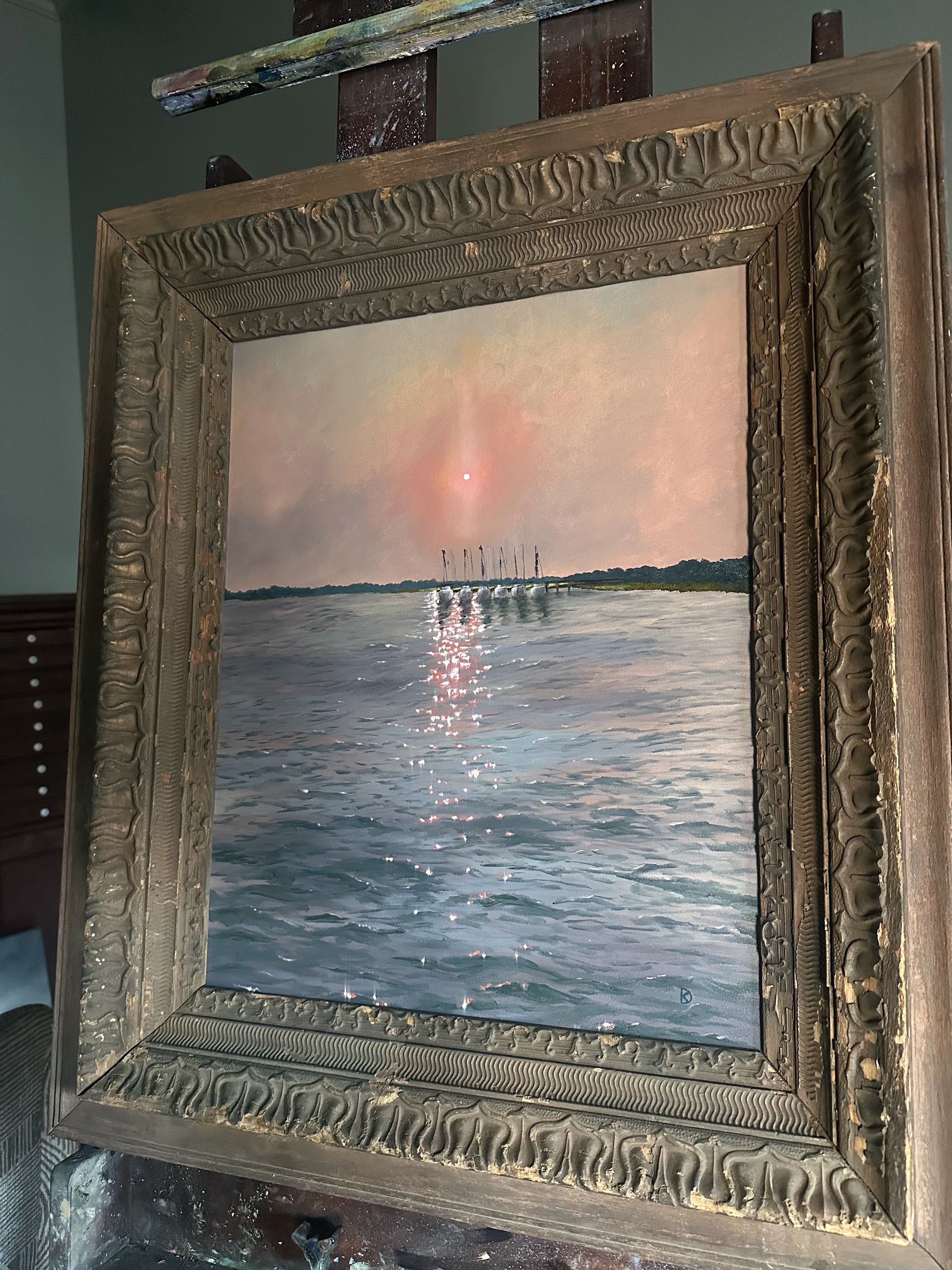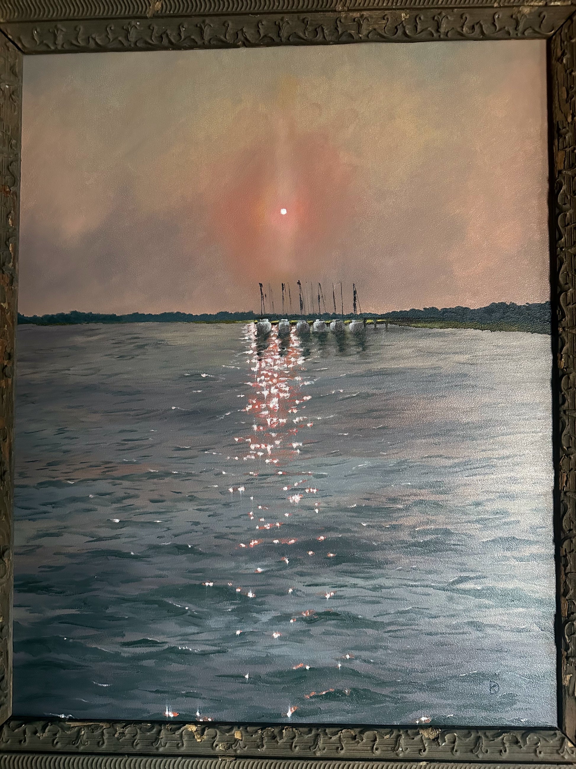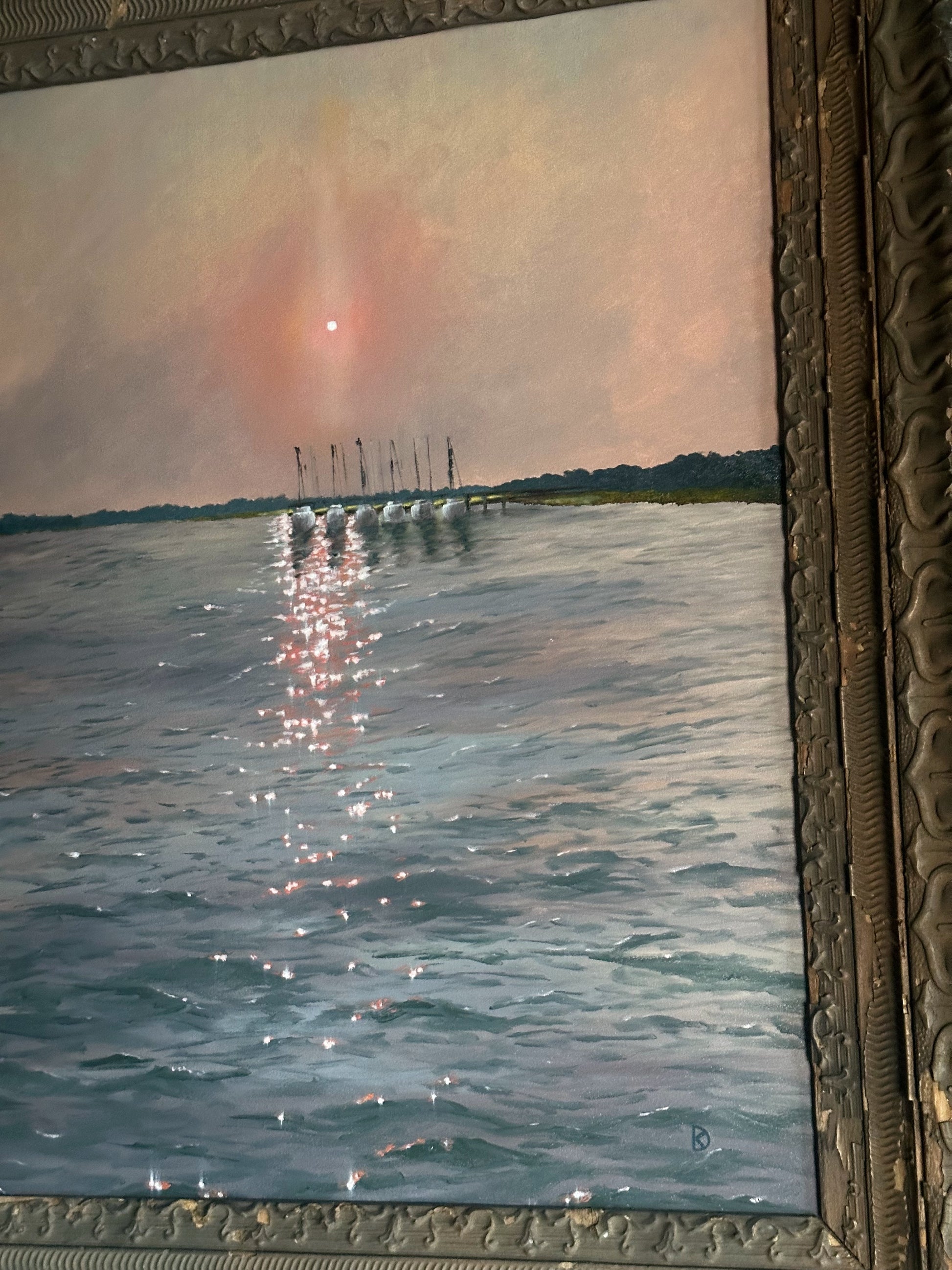 This hazy sun scene is one we recently witnessed here in Beaufort. I loved how different the soft, filtered light made the world, and how the pink sun seemed to tinge everything below it a bit pink unlike it ever has before. It made me think of how often we can see the same scene again and again, but it takes an perspective shift to tinge our ideas of what we think we know. I hope this painting is a reminder to stay open to new ideas, ideals and always remain empathetic to not only what you've experienced, but even situations you haven't. Empathy will save the world, if only we allow our perspectives to see beyond what's in front of us, and open ourselves up to the peripheral.