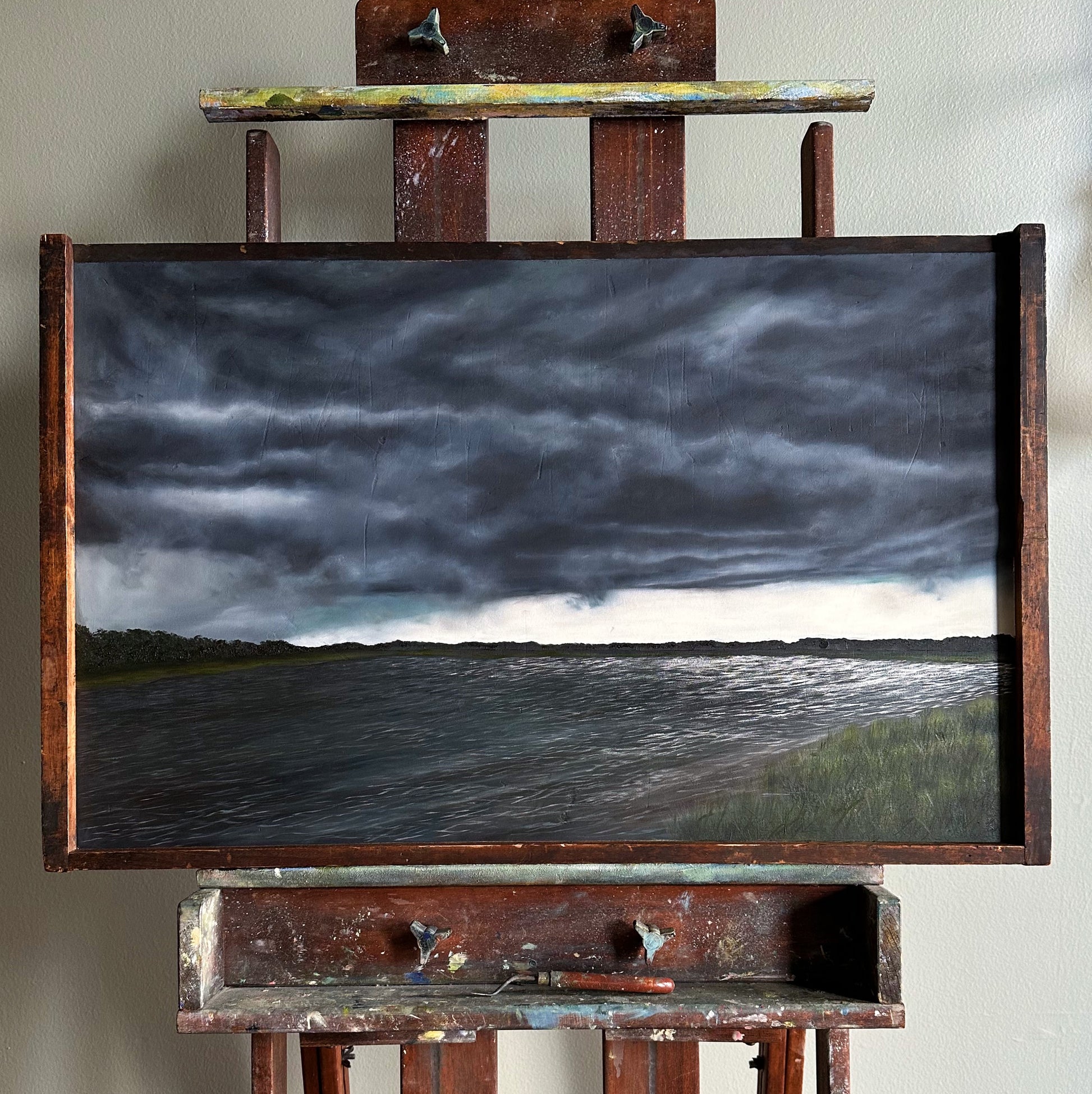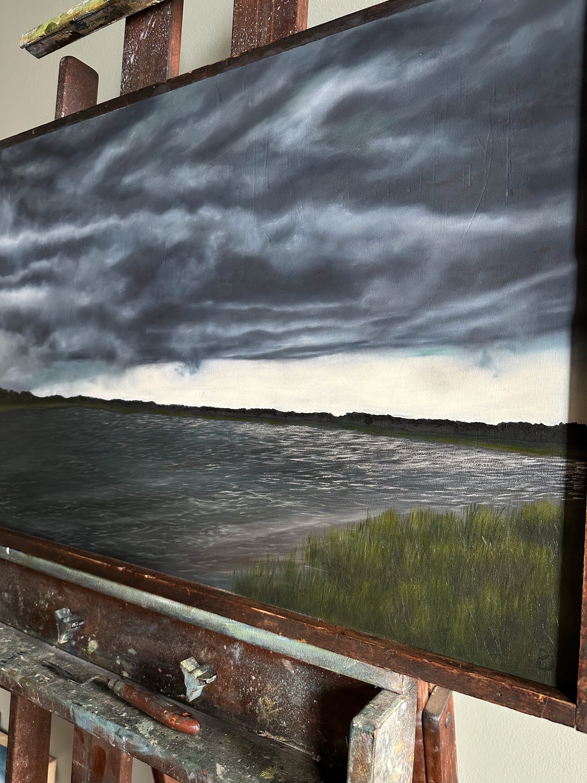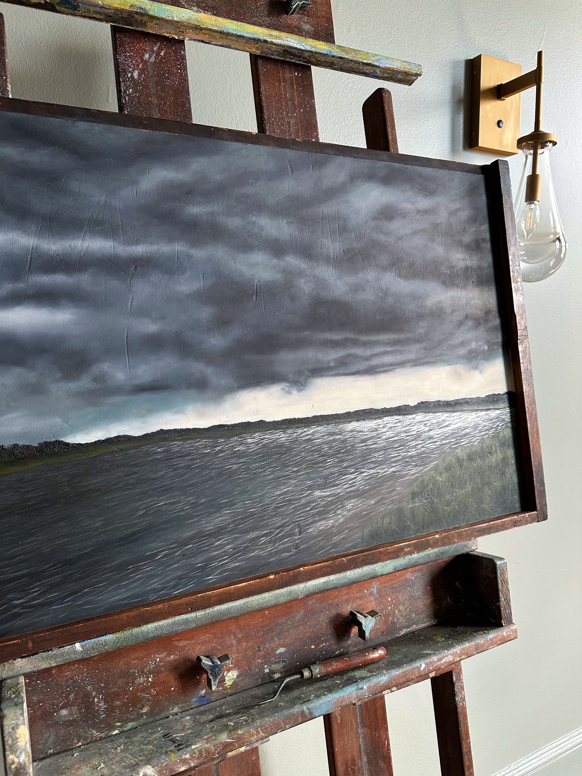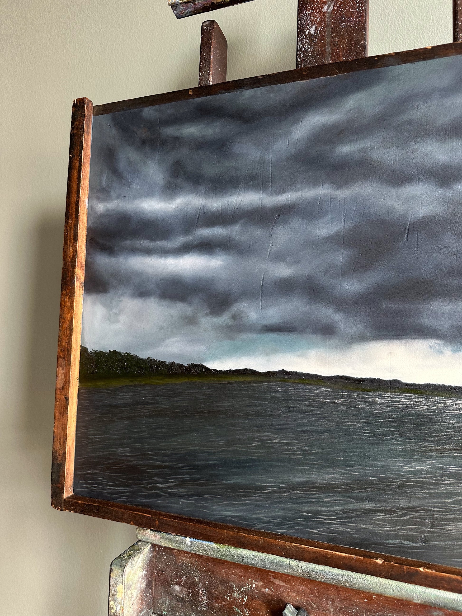 A pop-up storm scene of blues, greens and silver reflection on the water, reminding the viewer that life is fleeting and to live in the Now.