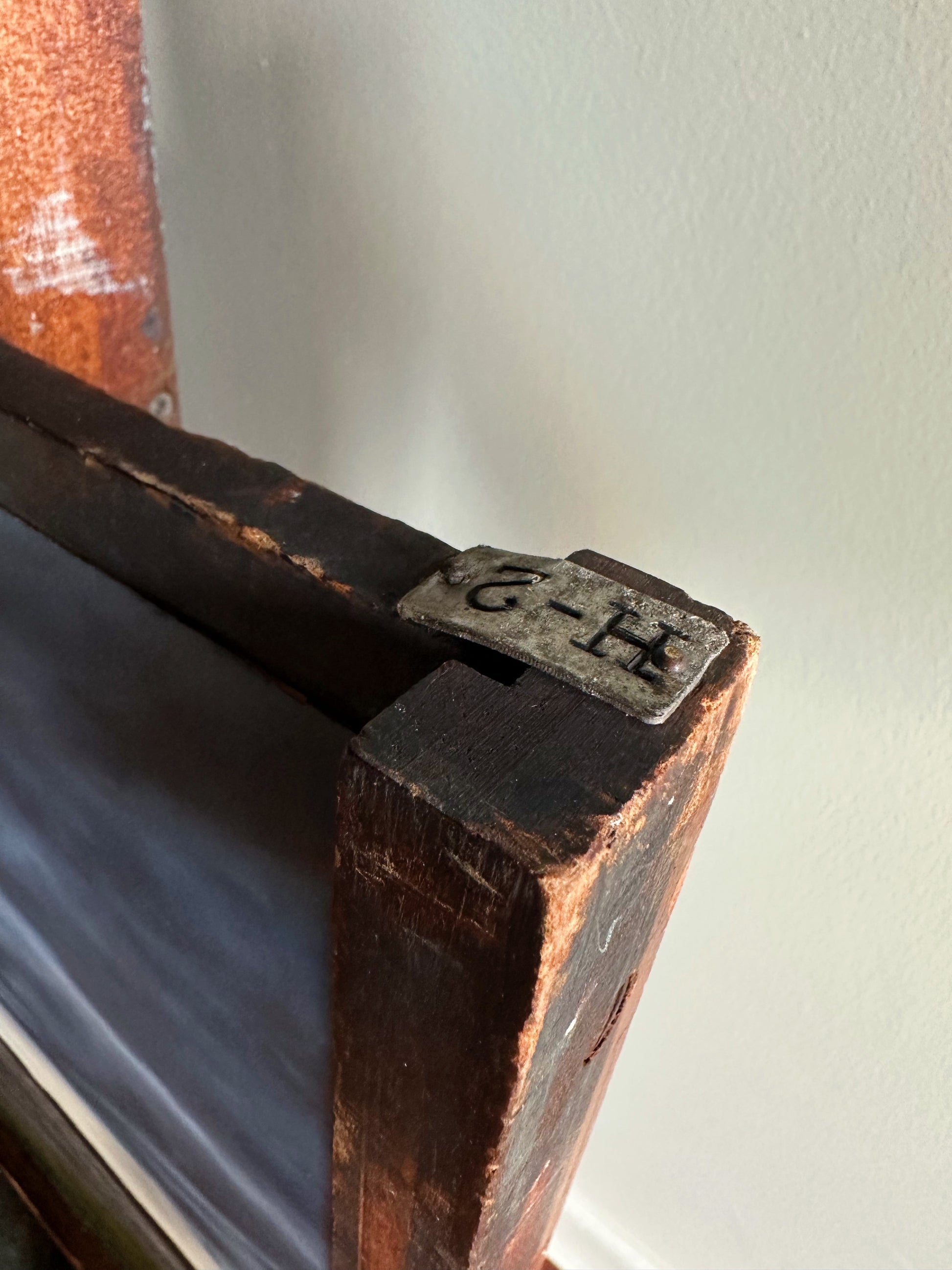 Oil on a solid heavy oak antique printers tray from France. The tray features the original small numbered tag on the top. Please note that this tray is a true antique, and as such, features marks and dings underneath the paint instead of a super smooth surface. I feel this adds character to the overall piece.