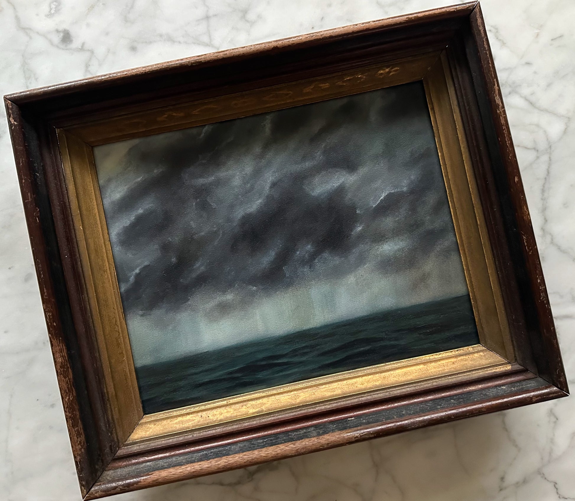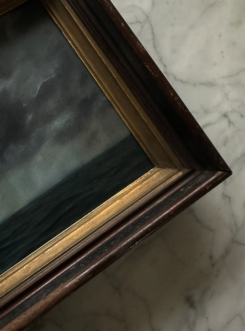 Oil on wood panel, framed in an antique frame. I love the frame on this because it is substantial in comparison to the painting, and has depth that stands away from the wall. Frame is 10.5" x 12.5" and stands away from the wall 2.5" with the painting.