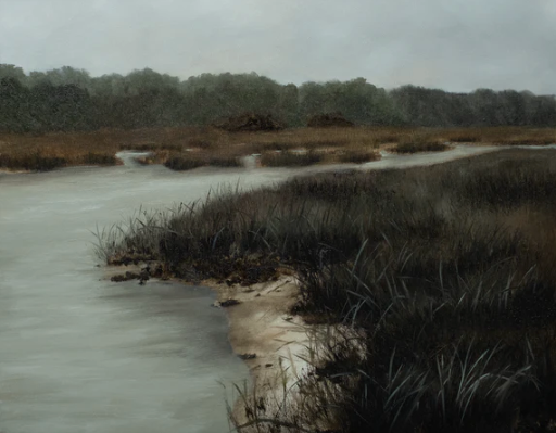 Monochrome foggy marsh scene with an oyster bed on a small island. Named from a poem by Arthur Hugh Clough.