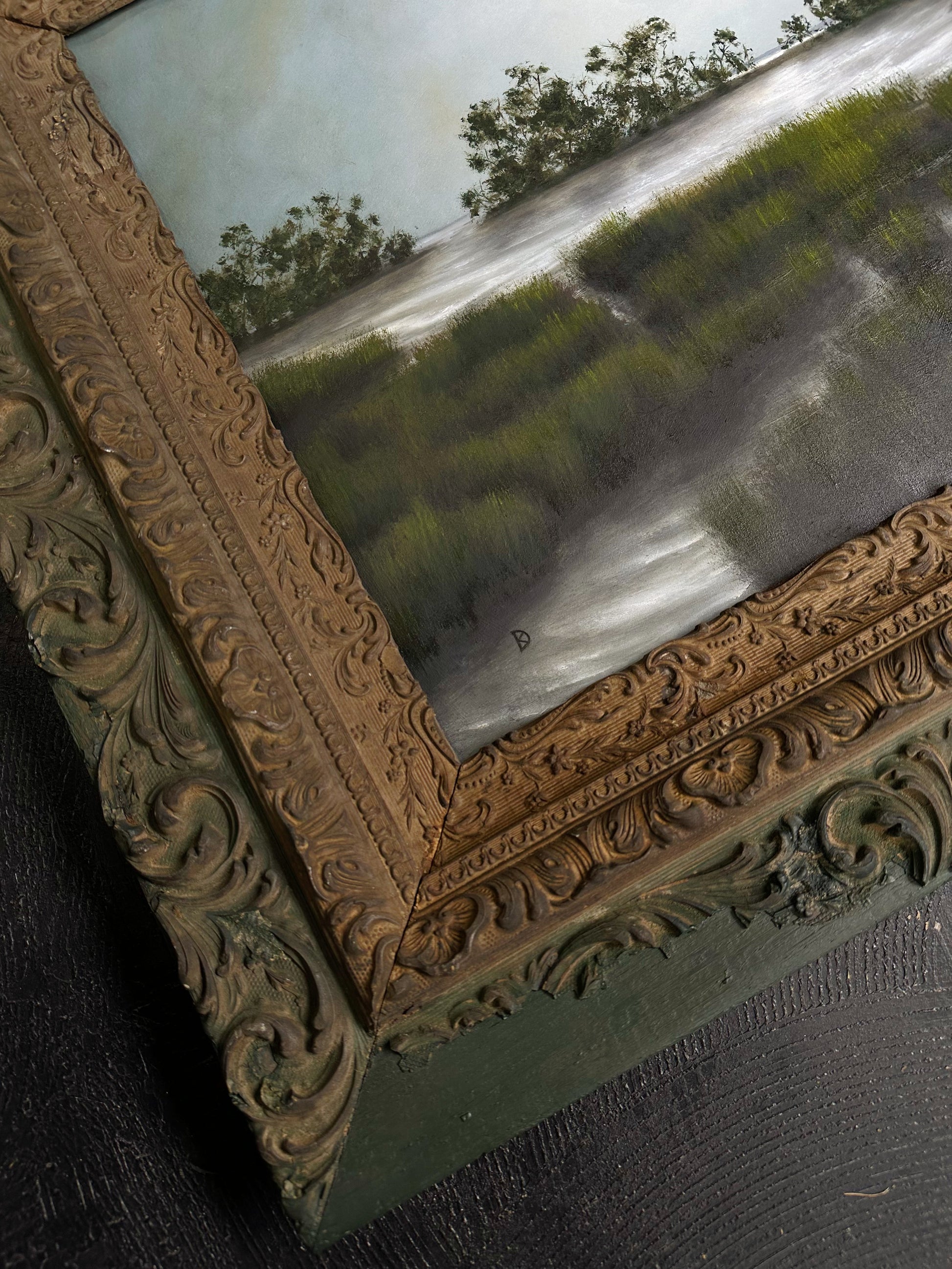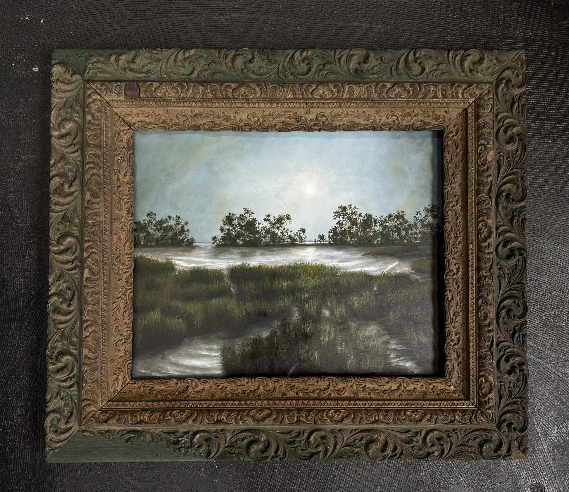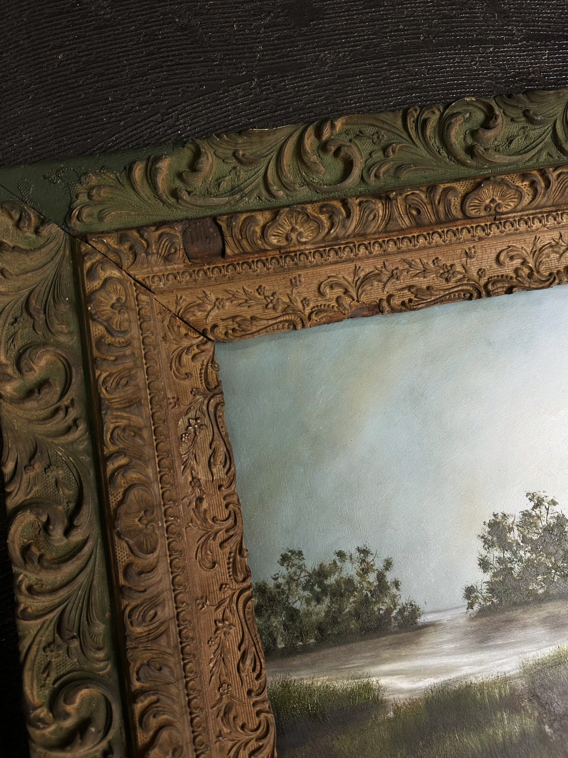 Original oil painting on hardboard panel, nestled in a mid-1800s heartpine frame. The painting is 16" x 20" and the frame measures 25.5" x 29.5". The frame is in original, unrestored condition and areas of missing gesso have been touched up with layers of color-correcting water-based paints. (Please see all photos for accurate representation of frame condition.) The frame boasts unusual, gorgeous original colorings of browns and greens.