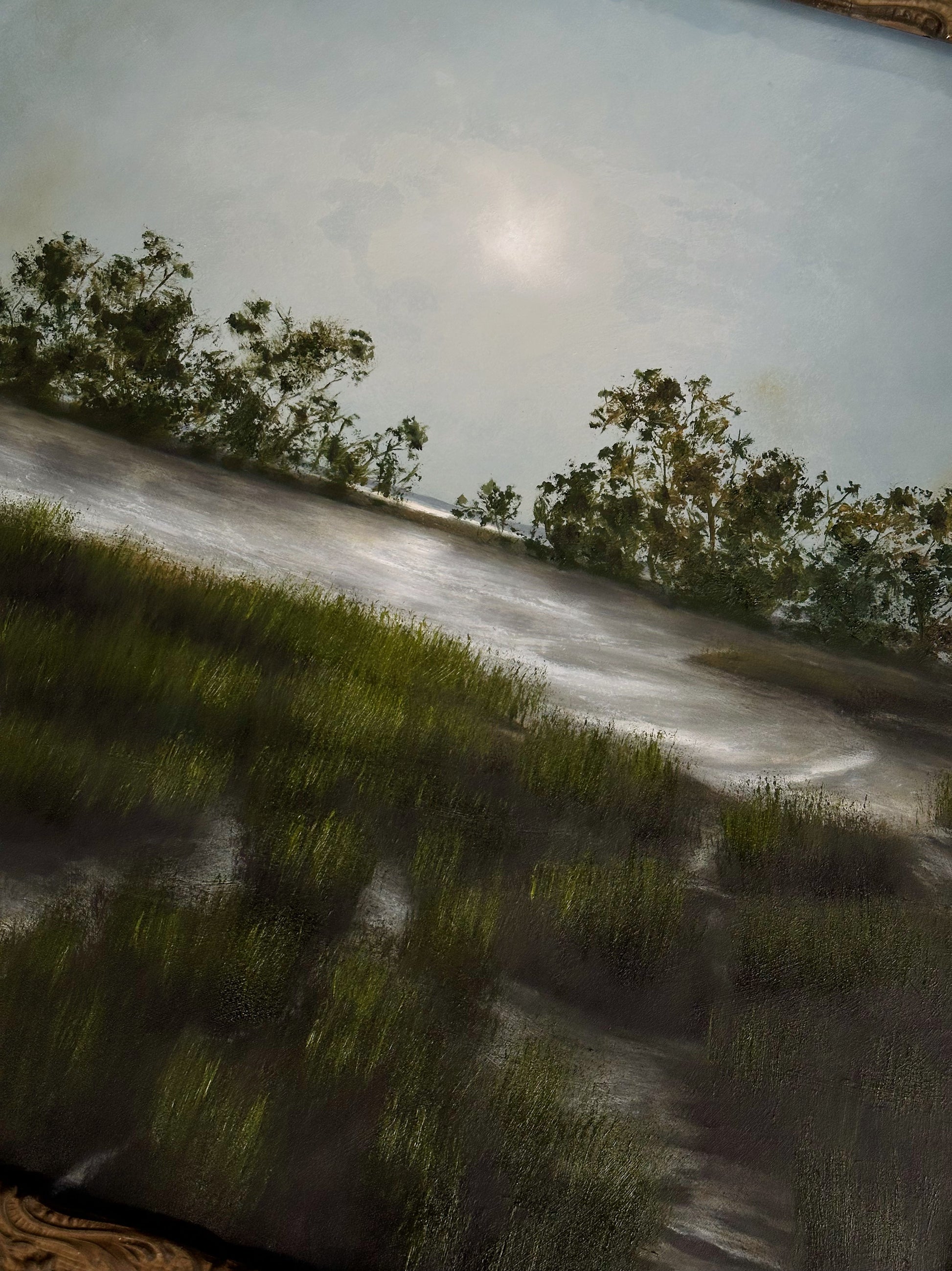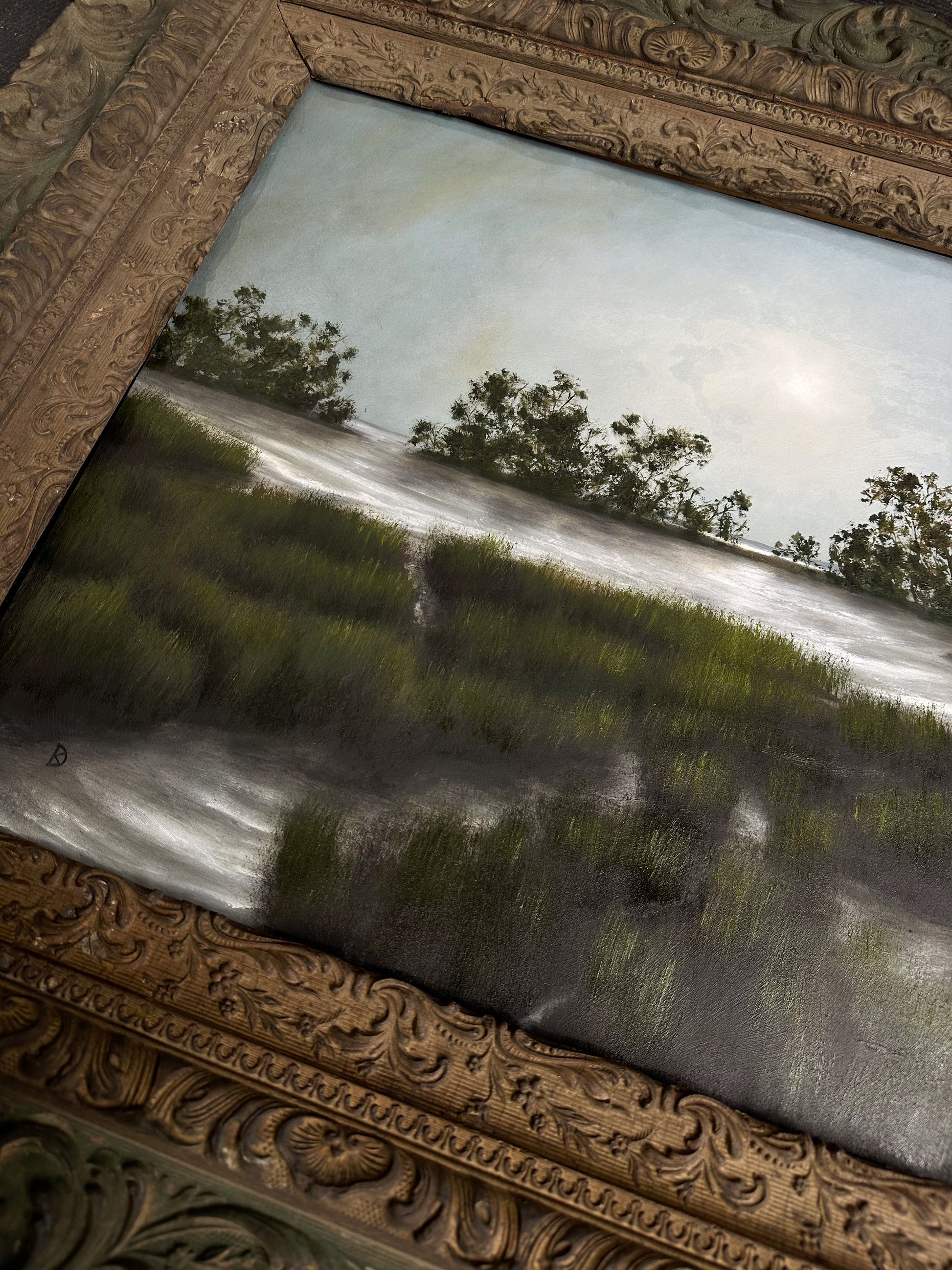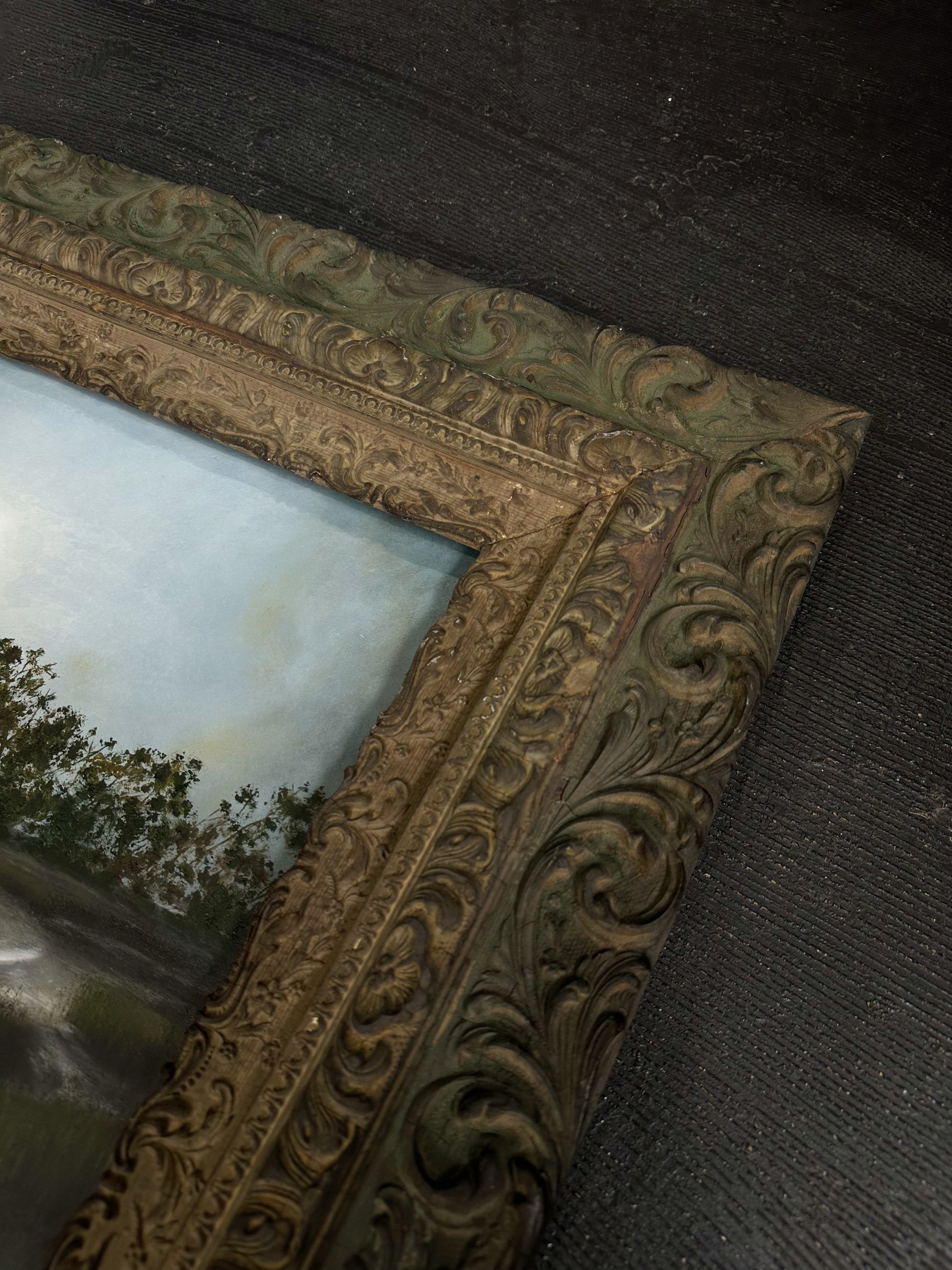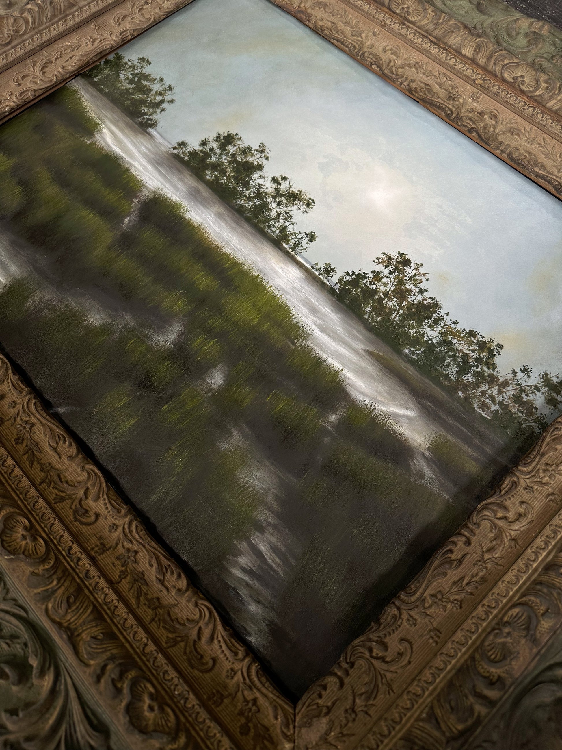 Original oil painting on hardboard panel, nestled in a mid-1800s heartpine frame. The painting is 16" x 20" and the frame measures 25.5" x 29.5". The frame is in original, unrestored condition and areas of missing gesso have been touched up with layers of color-correcting water-based paints. (Please see all photos for accurate representation of frame condition.) The frame boasts unusual, gorgeous original colorings of browns and greens.