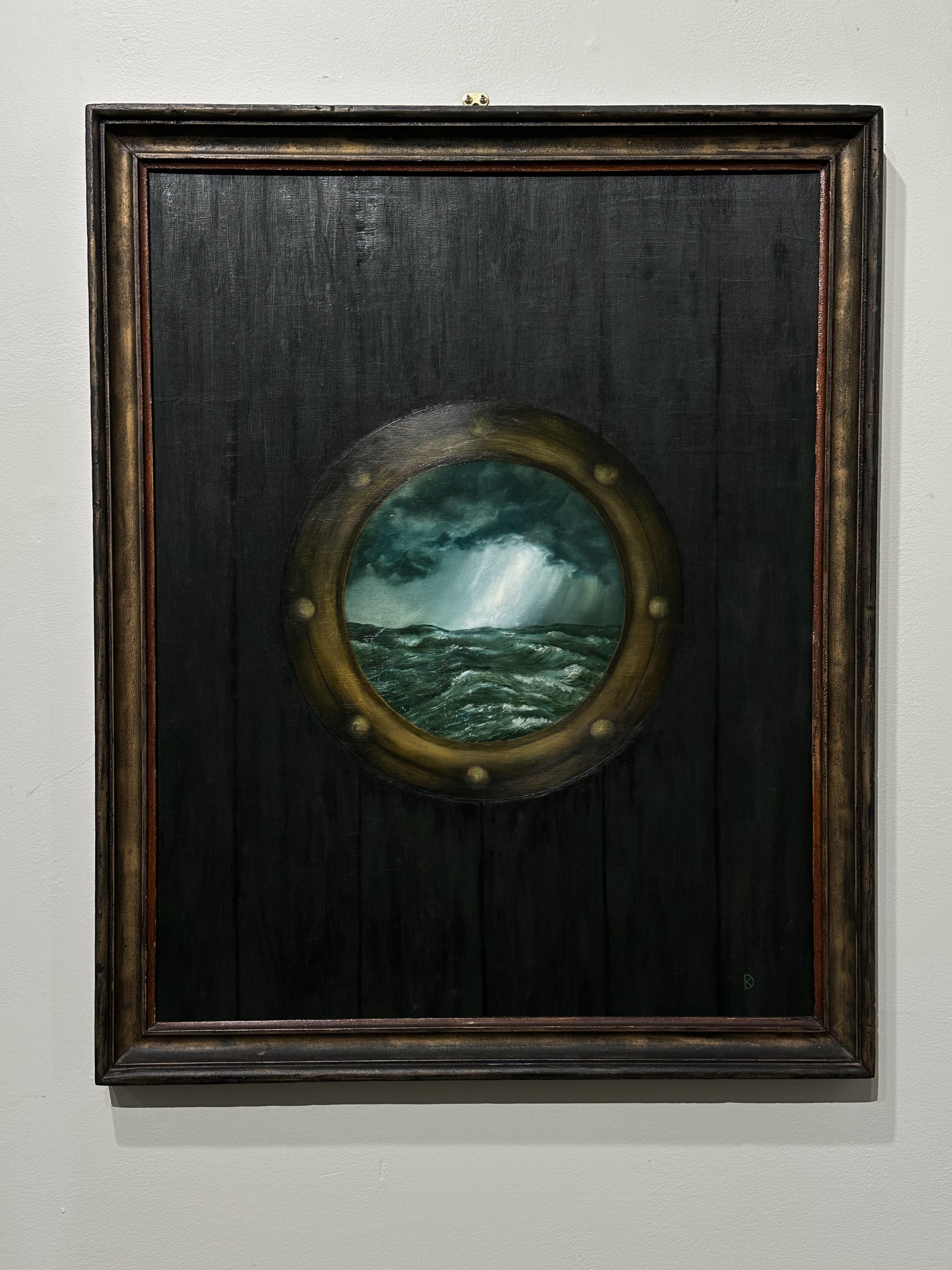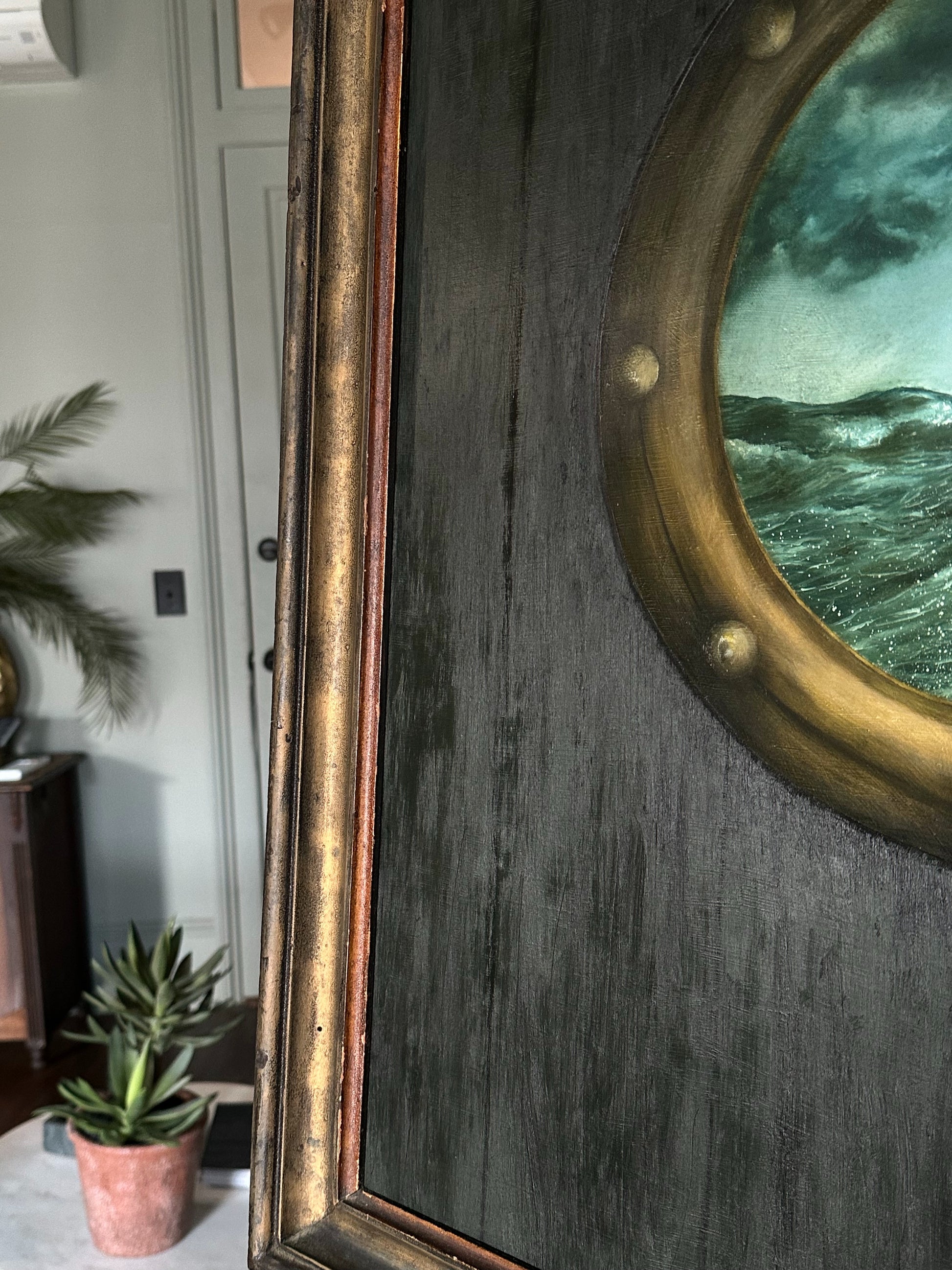 This painting is wildly unique in its charm: I used oil paint to create the ocean and "brass" porthole, and used cold wax mixed with oil paint to create realistic looking wood, reminiscent of looking out an antique sailing ship to a stormy sea and knowing you're safe. My husband and I are sailors, and have a Catalina 36; I wrote this poem about him. Someone reached out and said it could also be used in a religious sense and I thought that was also beautiful. Whatever the poem means to you upon first reading, is how you should interpret it.