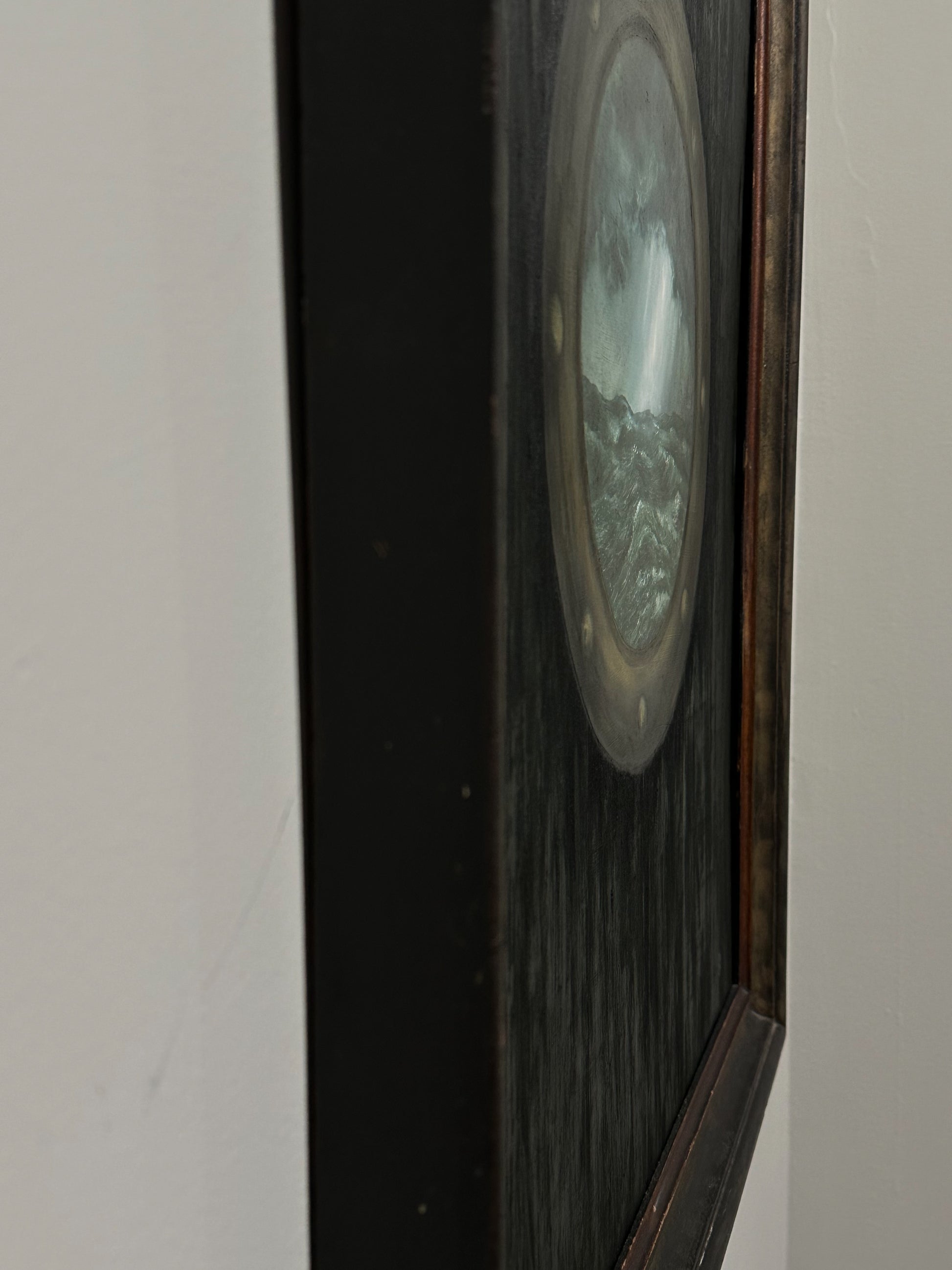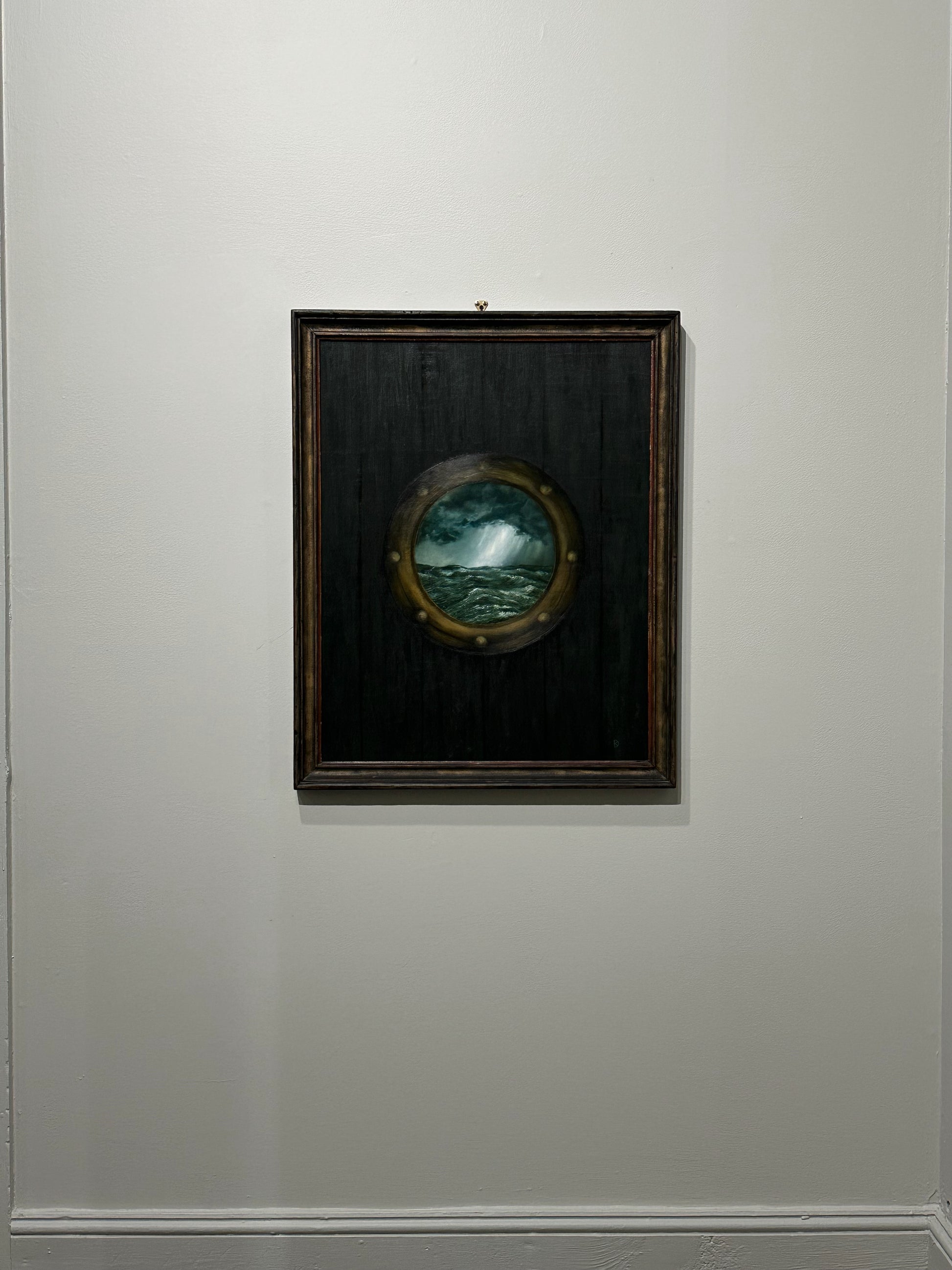 This painting took about 80 hours to create over the course of 4 months. It looks 3D from different angles but is in fact, flat. It does take some convincing to others to prove the porthole is in fact, painted, and not a "frame." I love the conversations it has already sparked. Sure to be a pleasant addition to your home.
