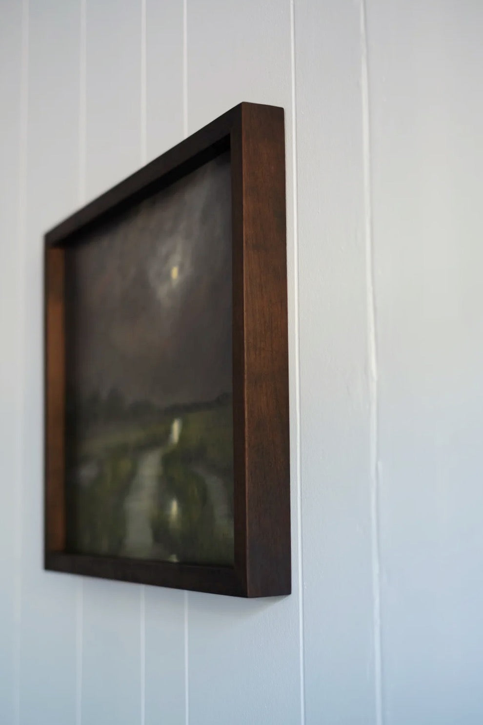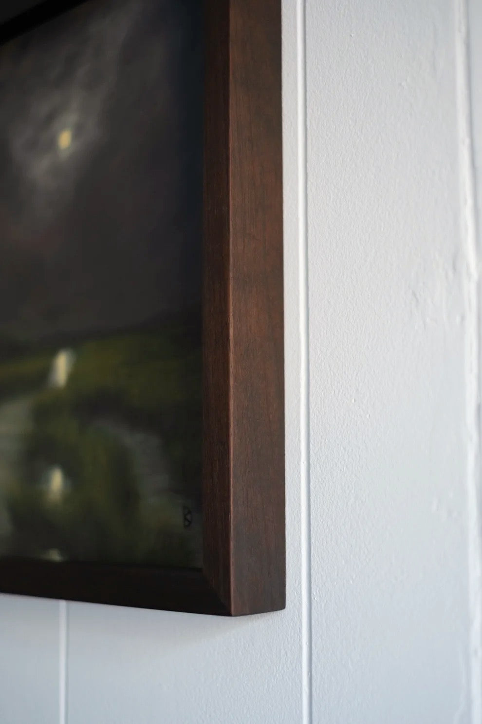 The frame is handcrafted Peruvian walnut chosen and created specifically for this painting by Kayla's husband and fine woodworker, Matt. The density of this exotic hardwood adds a beautiful, quality weight to the overall feel of the art piece.