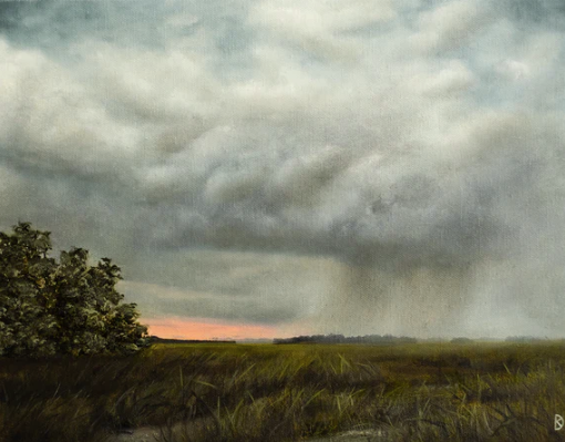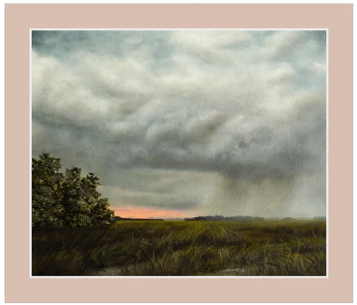Marsh scene with detailed storm clouds and a rain band, with coral-toned sunset light peeking through. The scene is based on a photo taken on Spring Island in Beaufort, SC. Named from the John Greenleaf Whittier poem, "Don't Quit."
