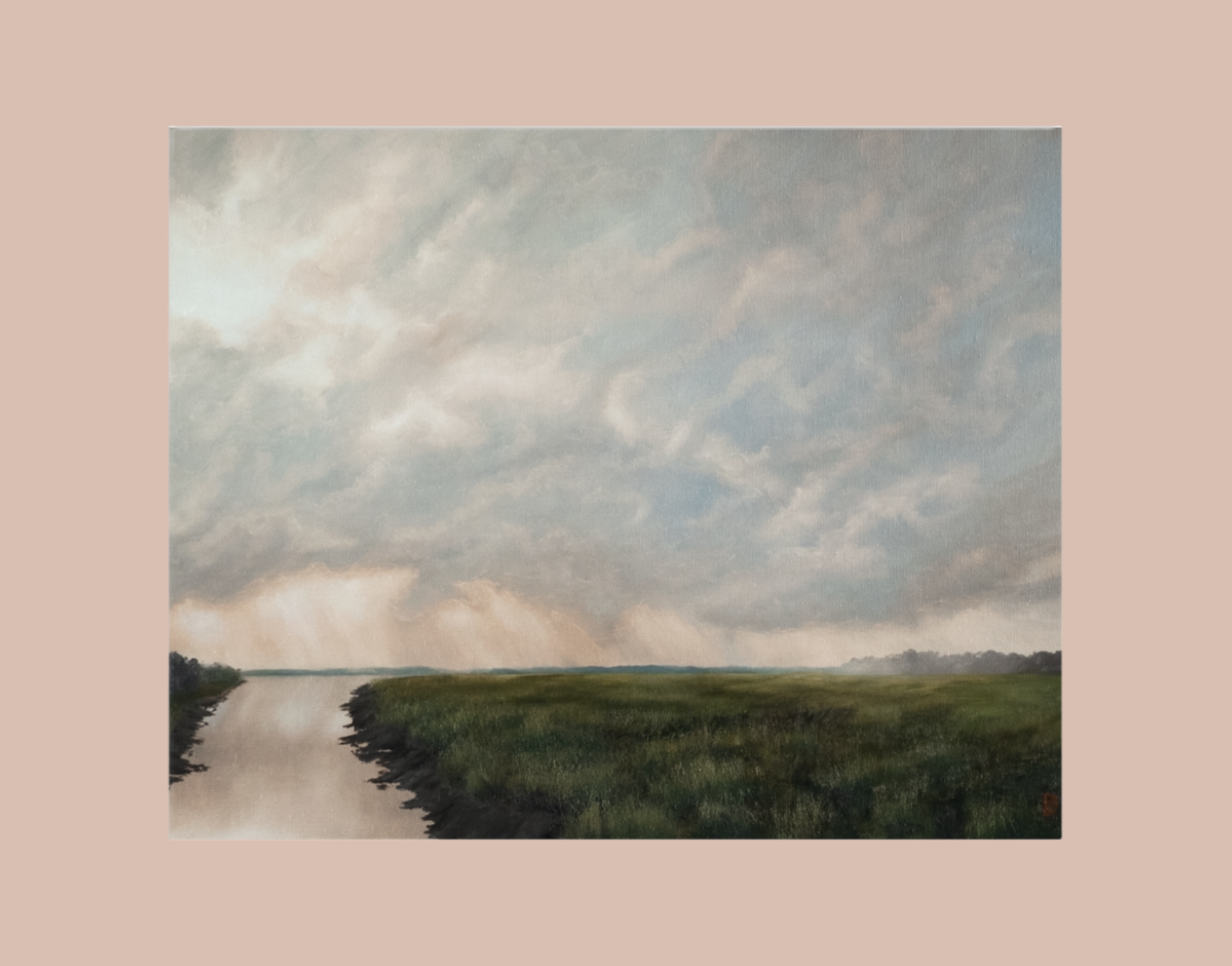 I painted this scene with the marsh grass mostly in mind. I wanted something that represented resilience and growth through adversity. Marsh grass, specifically spartina, is constantly faced with challenges of fluctuating water levels, salinity changes and strong currents. Despite obstacles, it grows strong and green through the muck and mud.