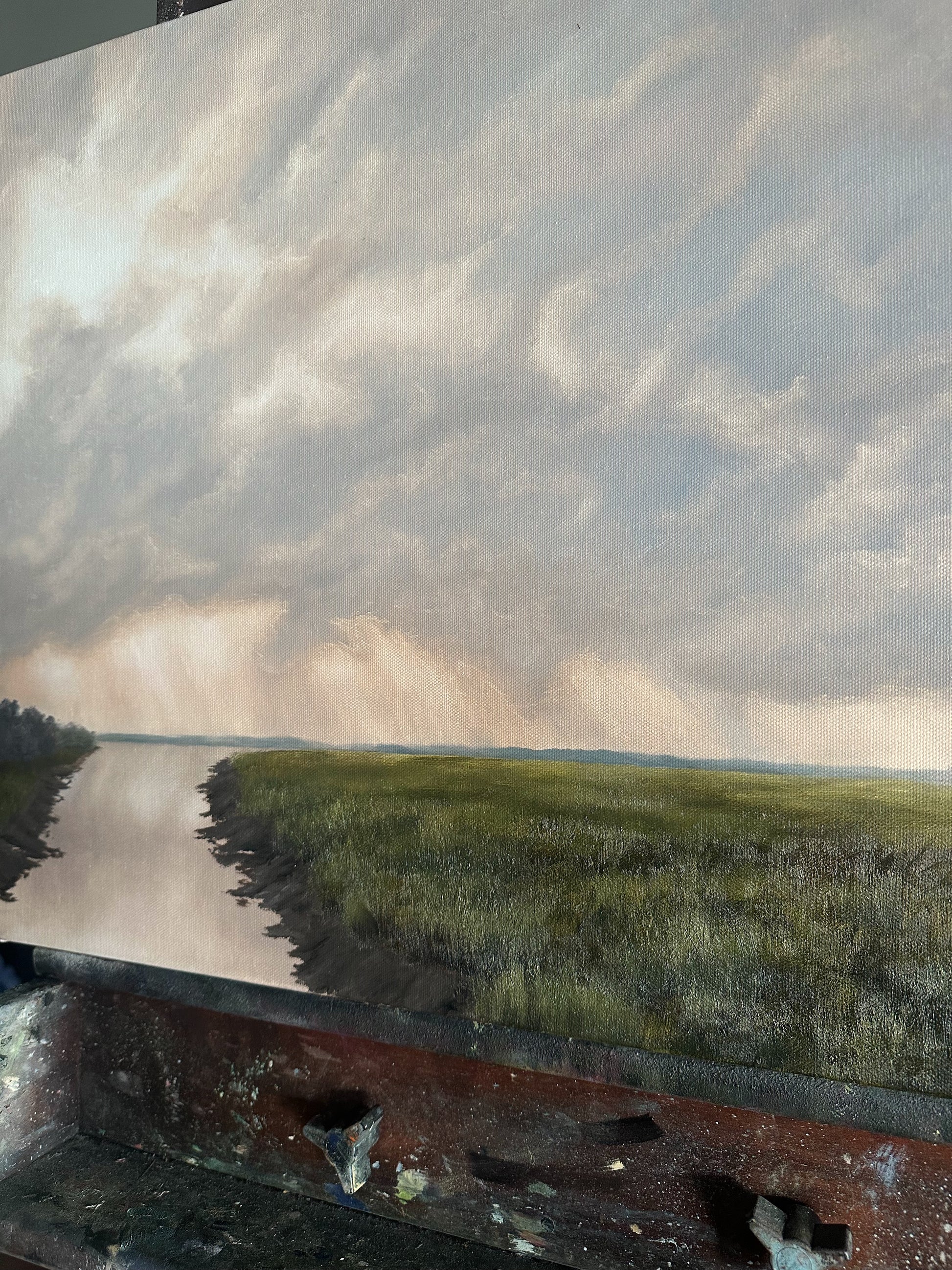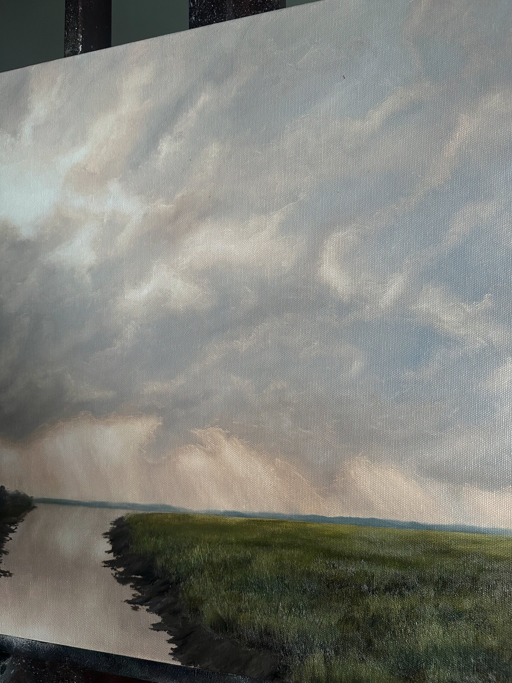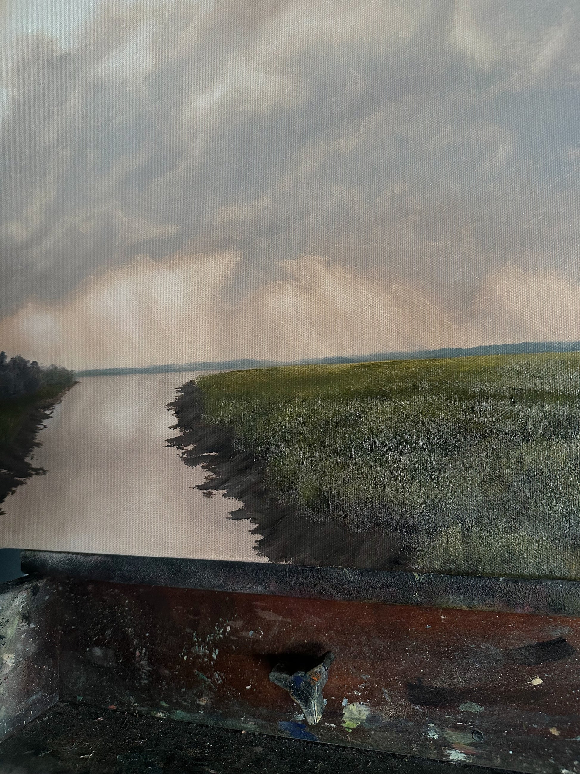 I painted this scene with the marsh grass mostly in mind. I wanted something that represented resilience and growth through adversity. Marsh grass, specifically spartina, is constantly faced with challenges of fluctuating water levels, salinity changes and strong currents. Despite obstacles, it grows strong and green through the muck and mud.