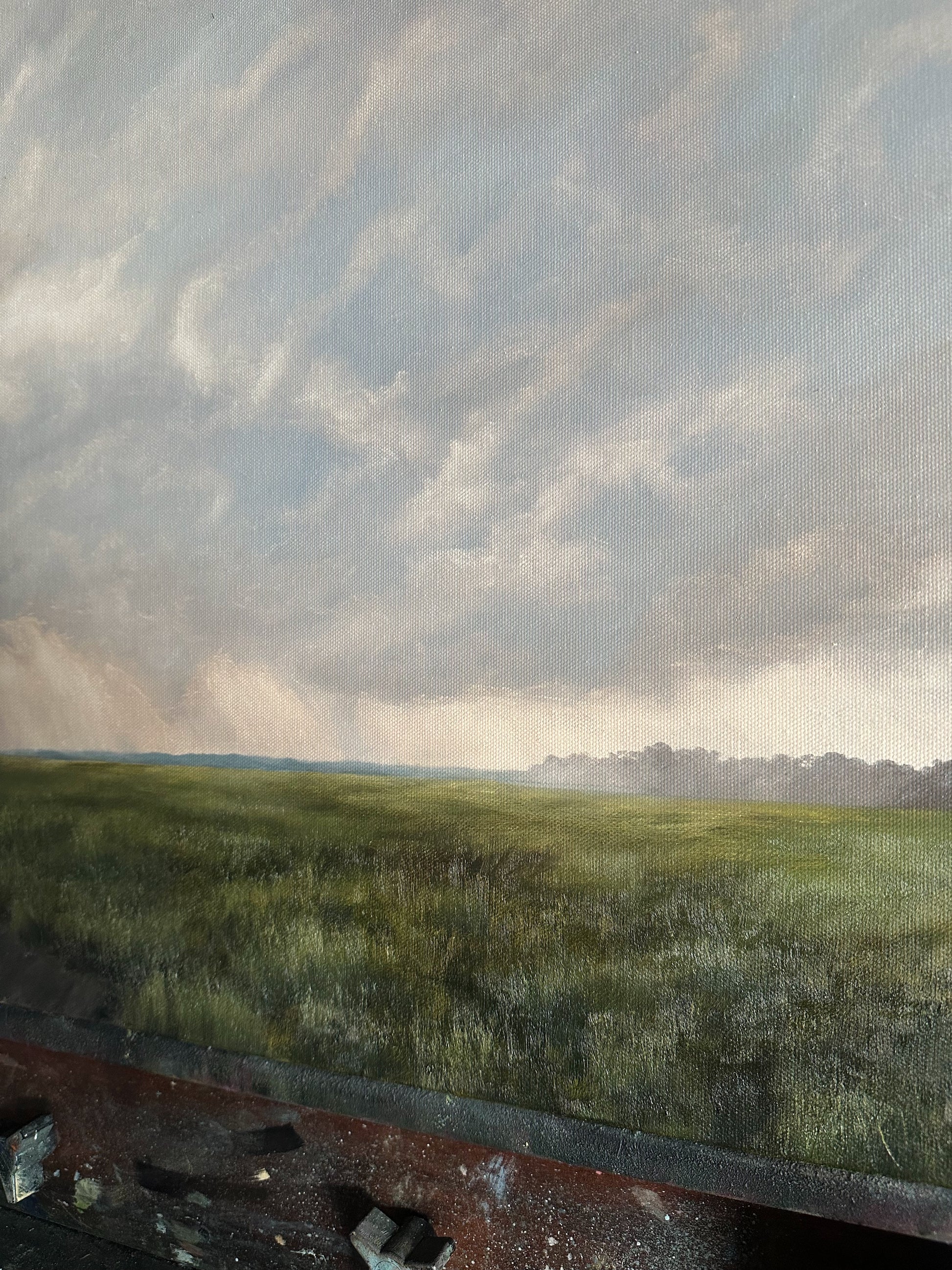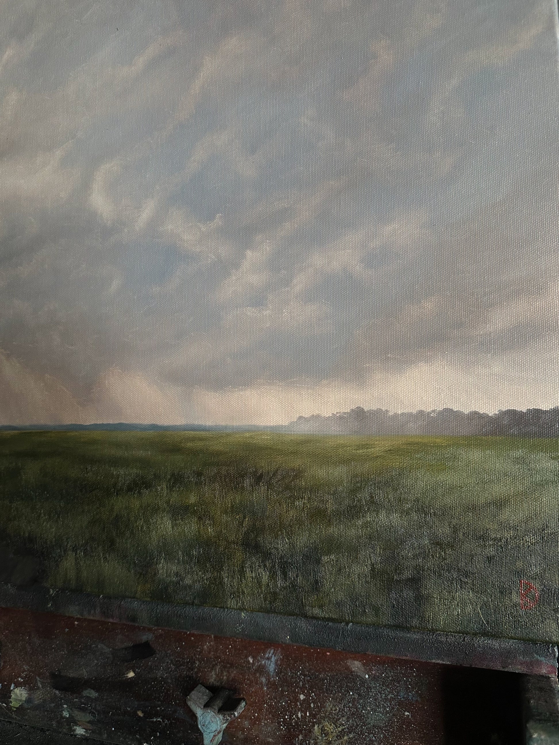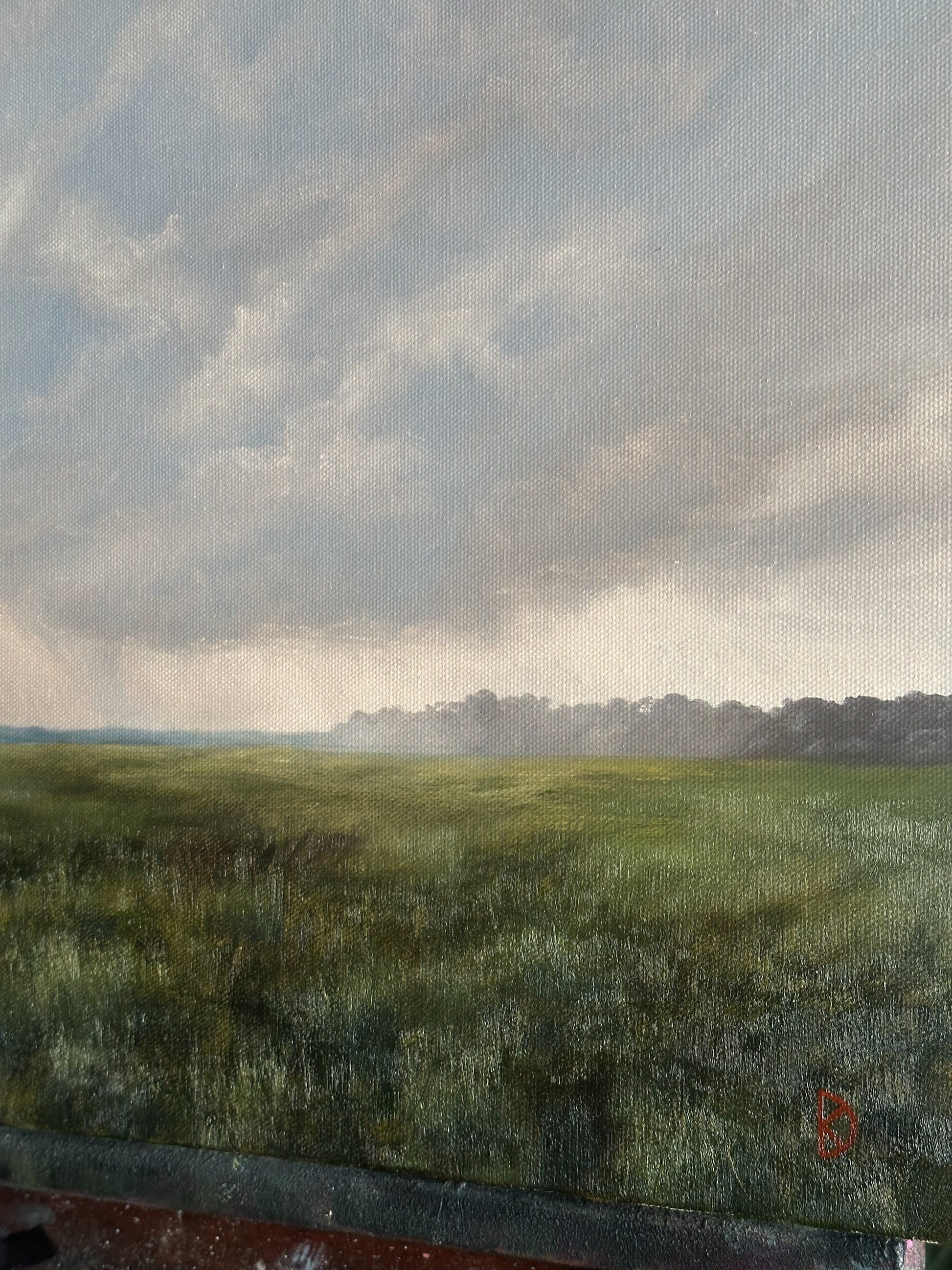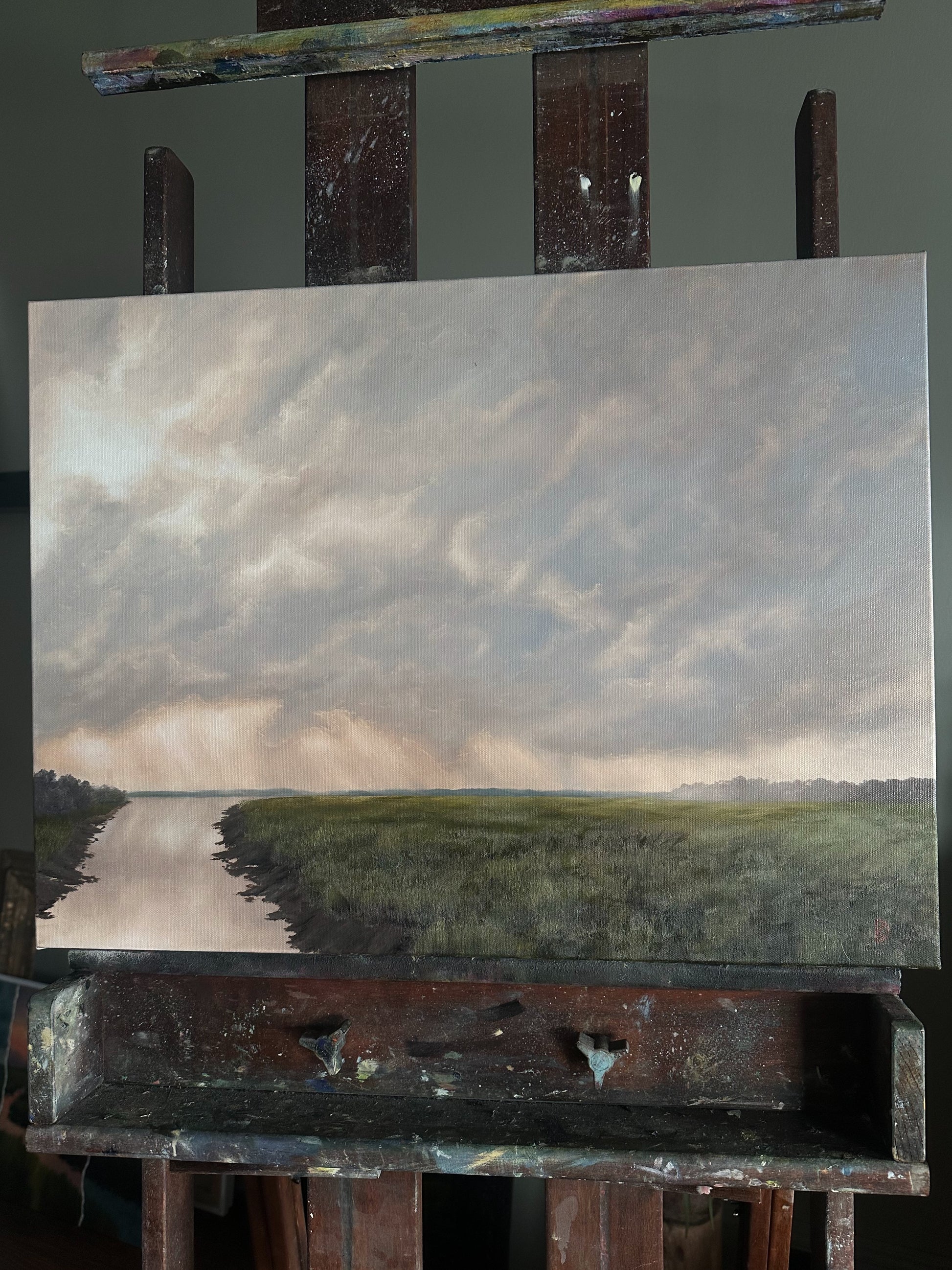 I painted this scene with the marsh grass mostly in mind. I wanted something that represented resilience and growth through adversity. Marsh grass, specifically spartina, is constantly faced with challenges of fluctuating water levels, salinity changes and strong currents. Despite obstacles, it grows strong and green through the muck and mud.