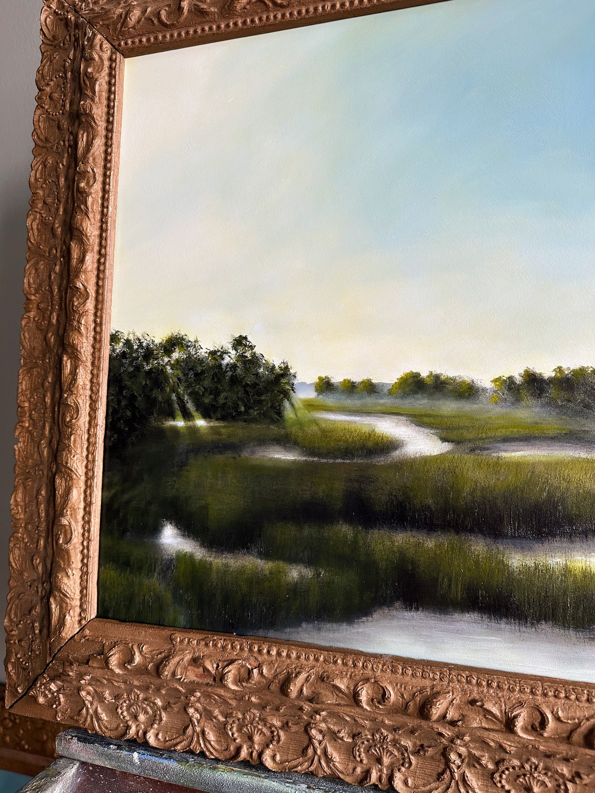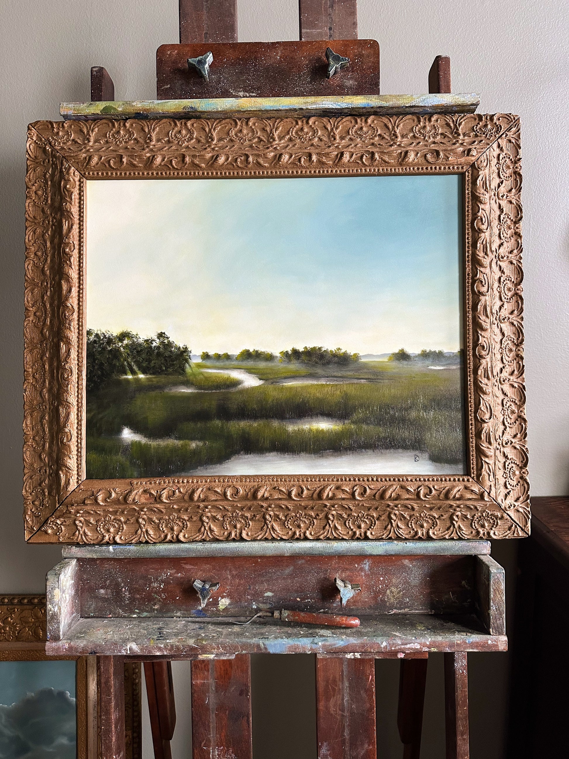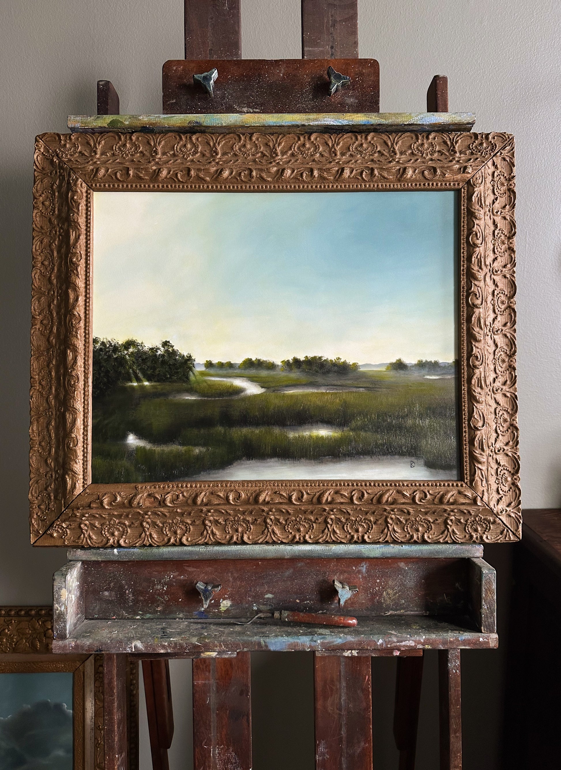 Oil on hardboard, framed in a late 1800s frame. The frame features original, time-won character, adding to the overall charm of this piece. This custom board and scene were created specifically for this frame.