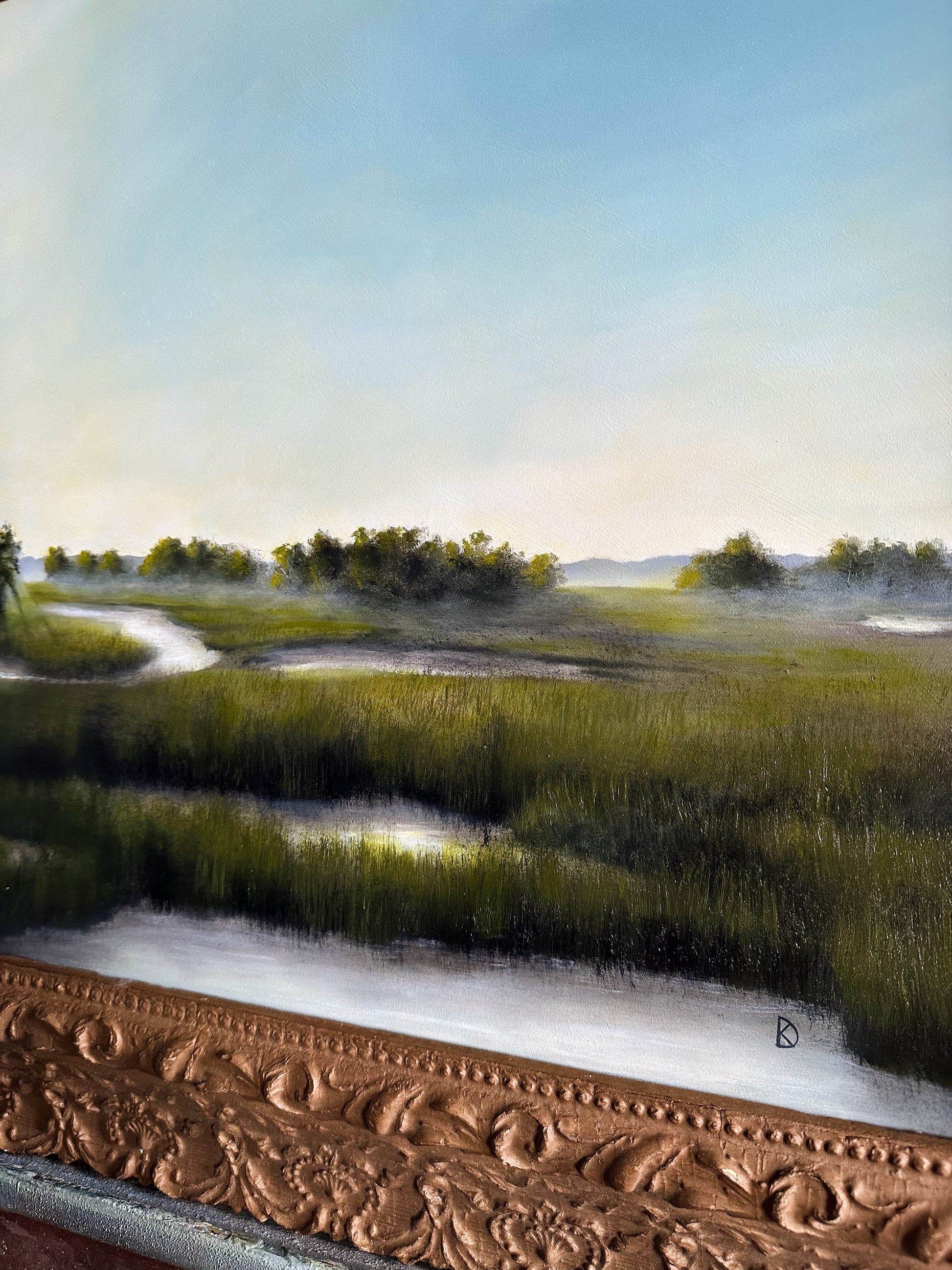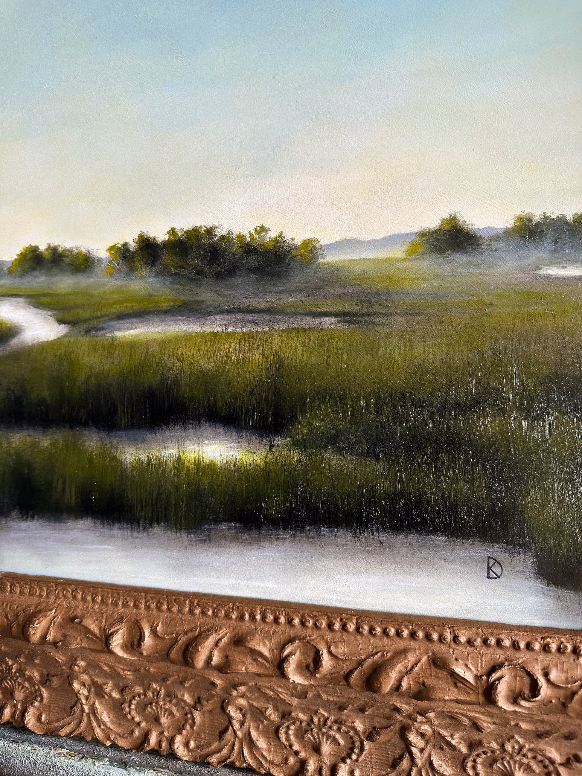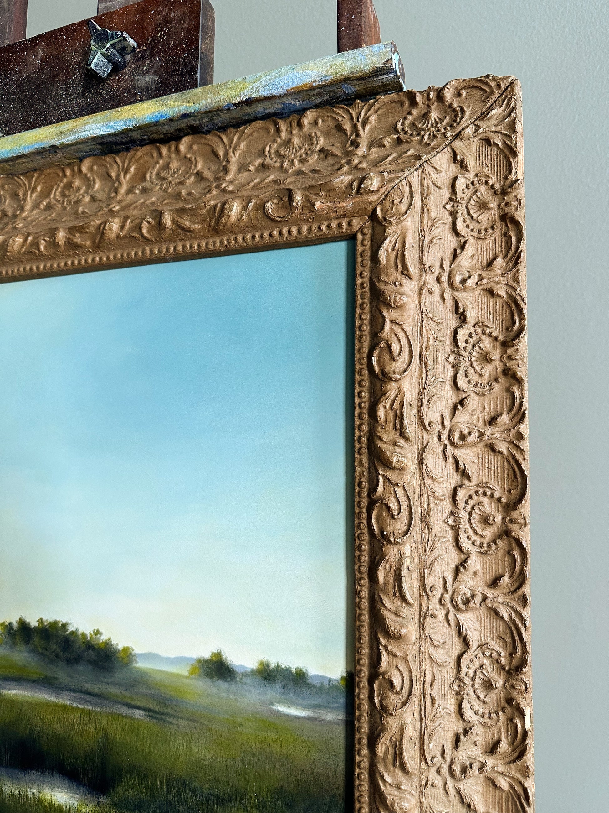 Oil on hardboard, framed in a late 1800s frame. The frame features original, time-won character, adding to the overall charm of this piece. This custom board and scene were created specifically for this frame.
