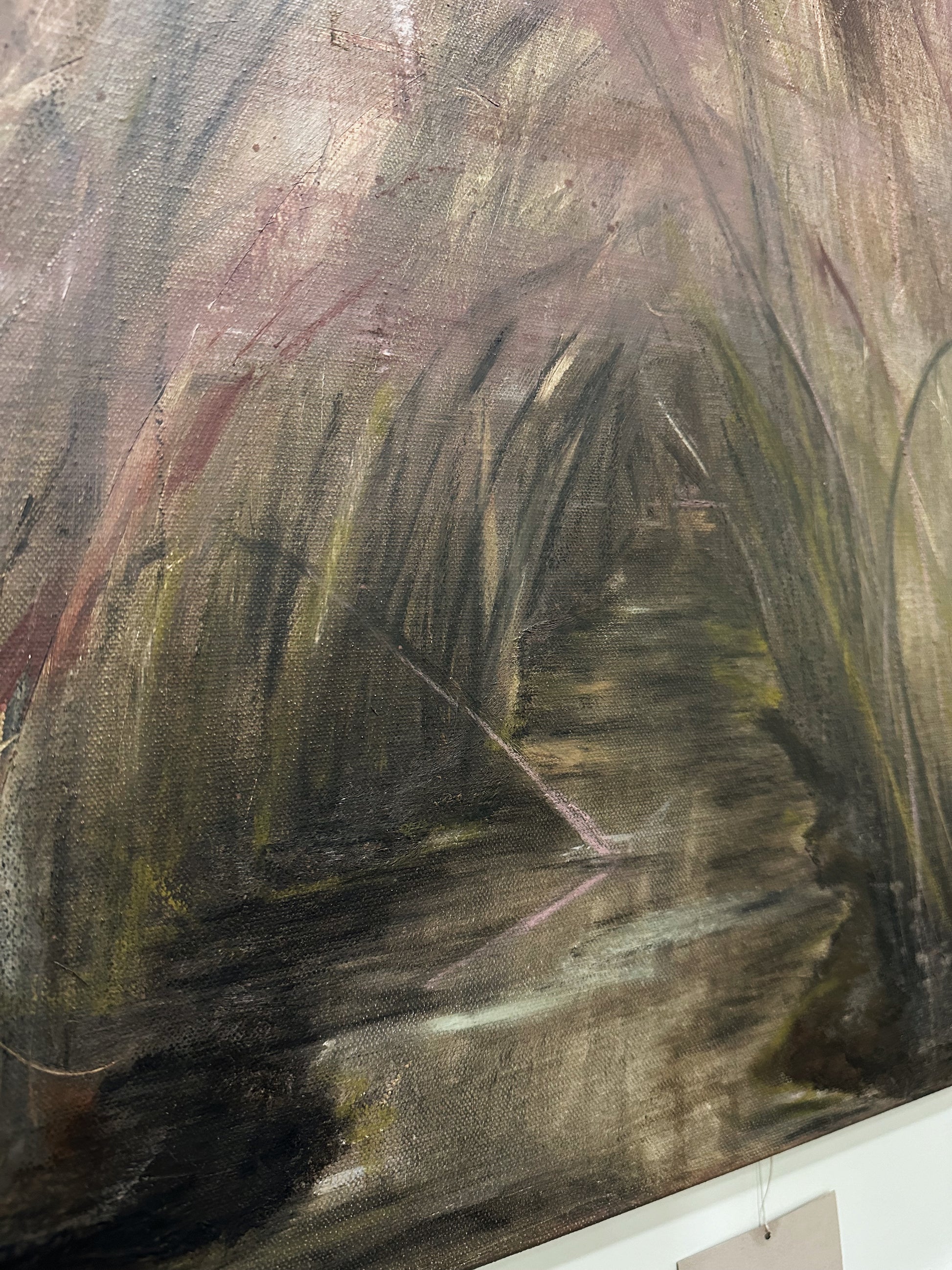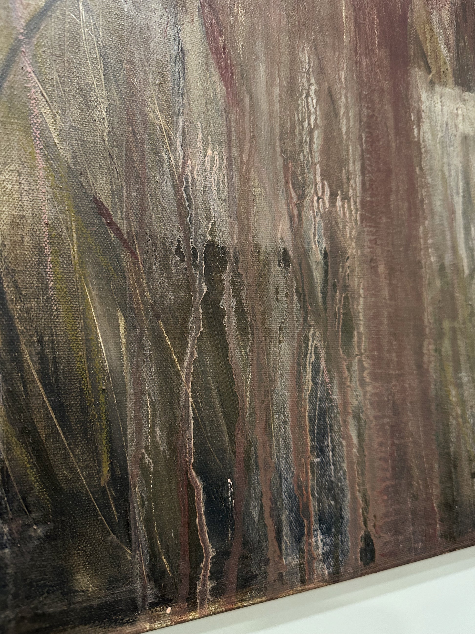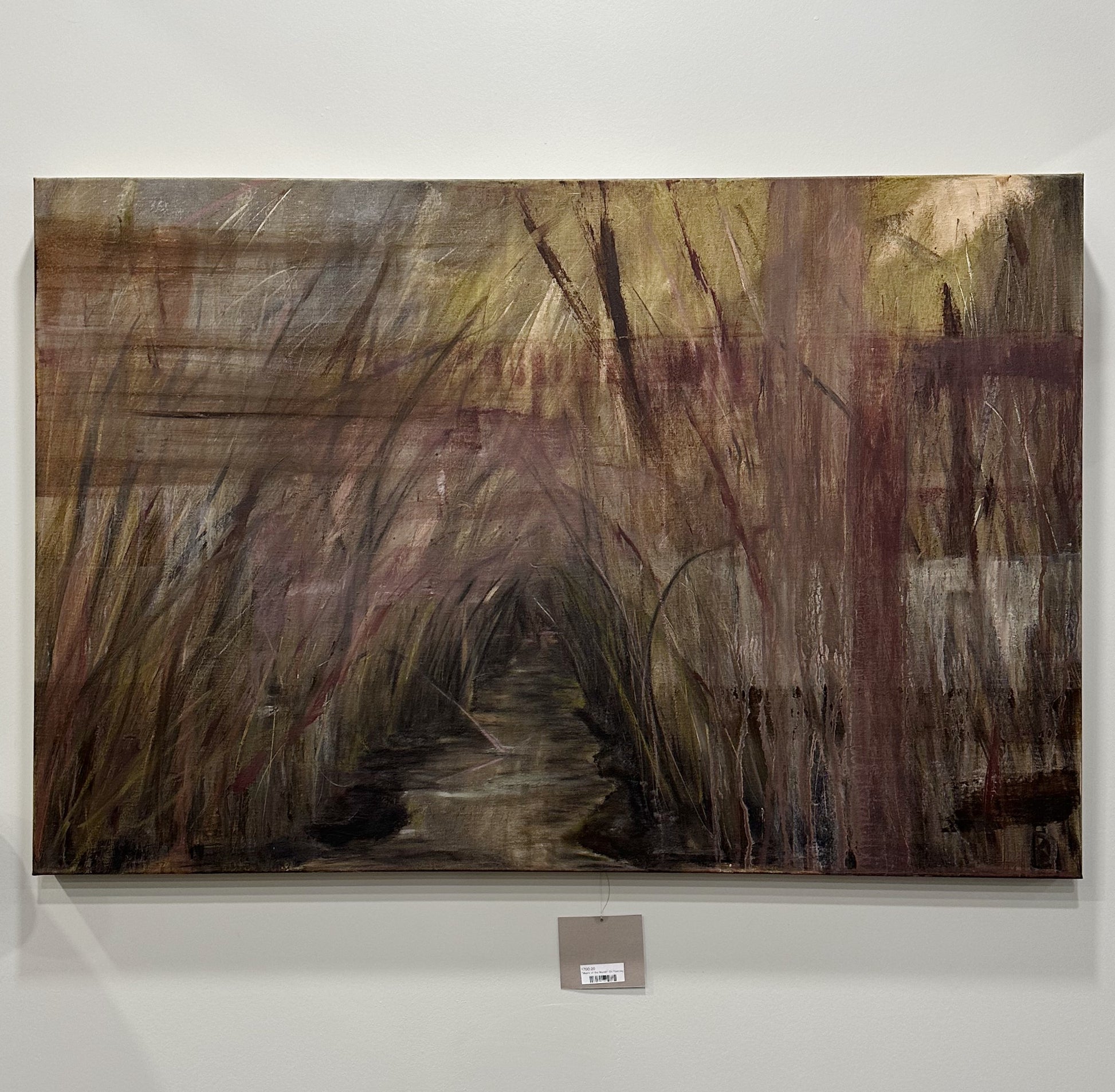 The colors are muted and punchy with deep maroons, pale pinks, khaki greens, neutral browns and hints of pale dusty blues. Drip, runs and mashes of color coupled with the form of grasses, water and mud make this a playful and intriguing piece.