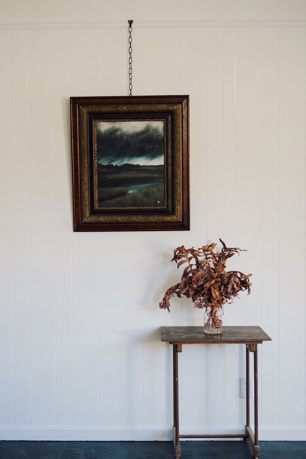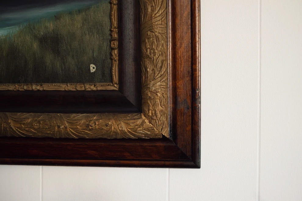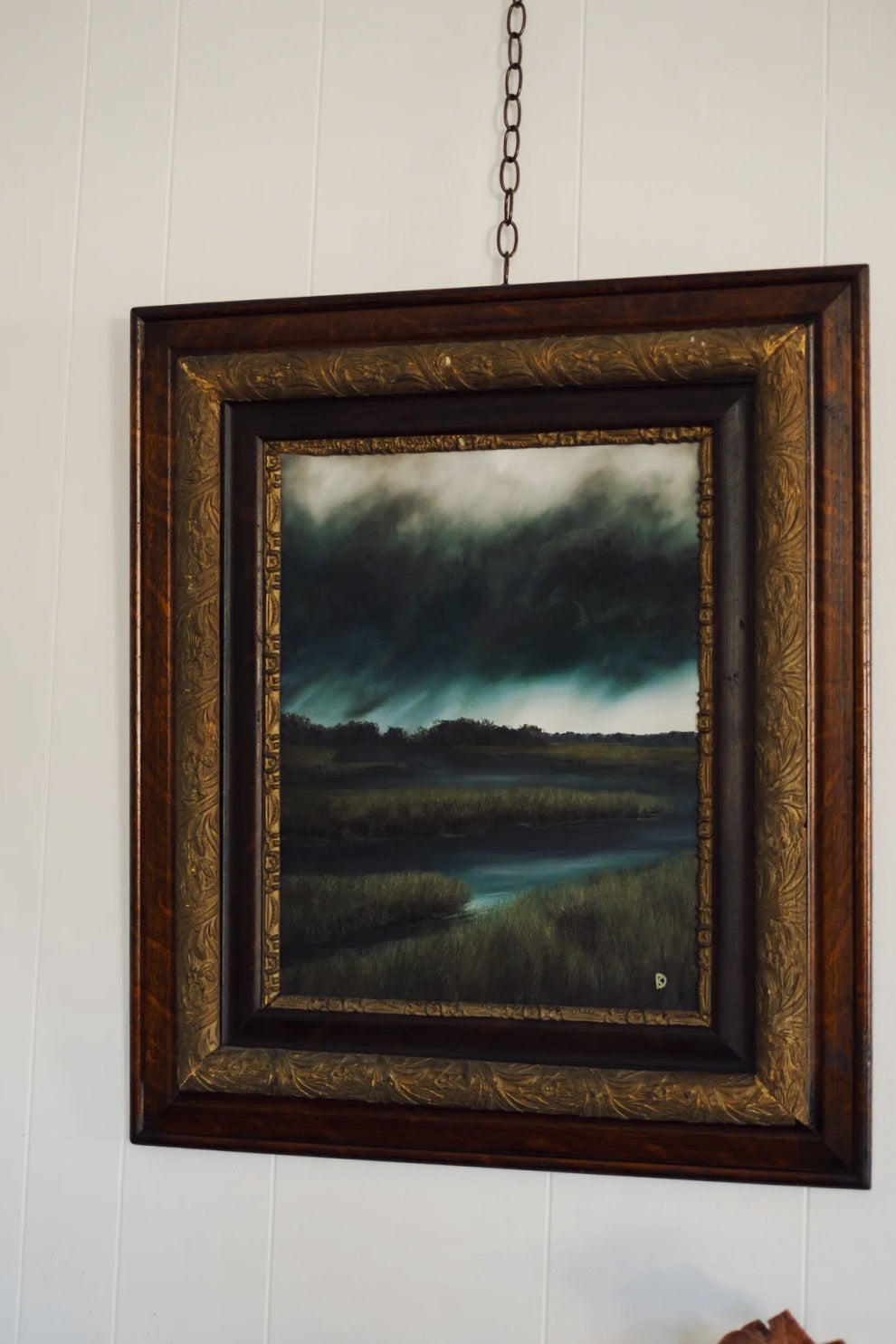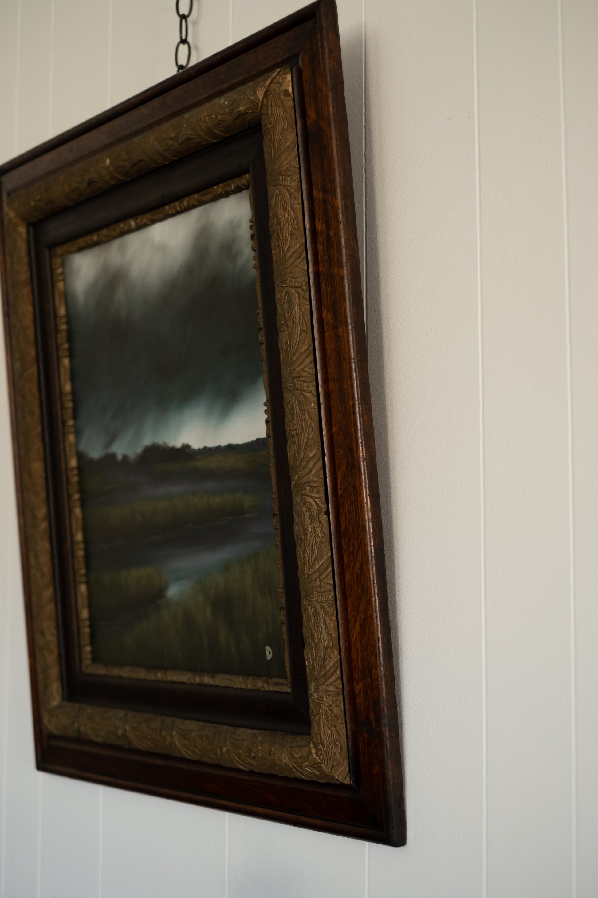Original oil painting on canvas panel, nestled in a late 1800s tiger oak frame. The painting is 16" x 20" and the frame measures 31" x 27.25".