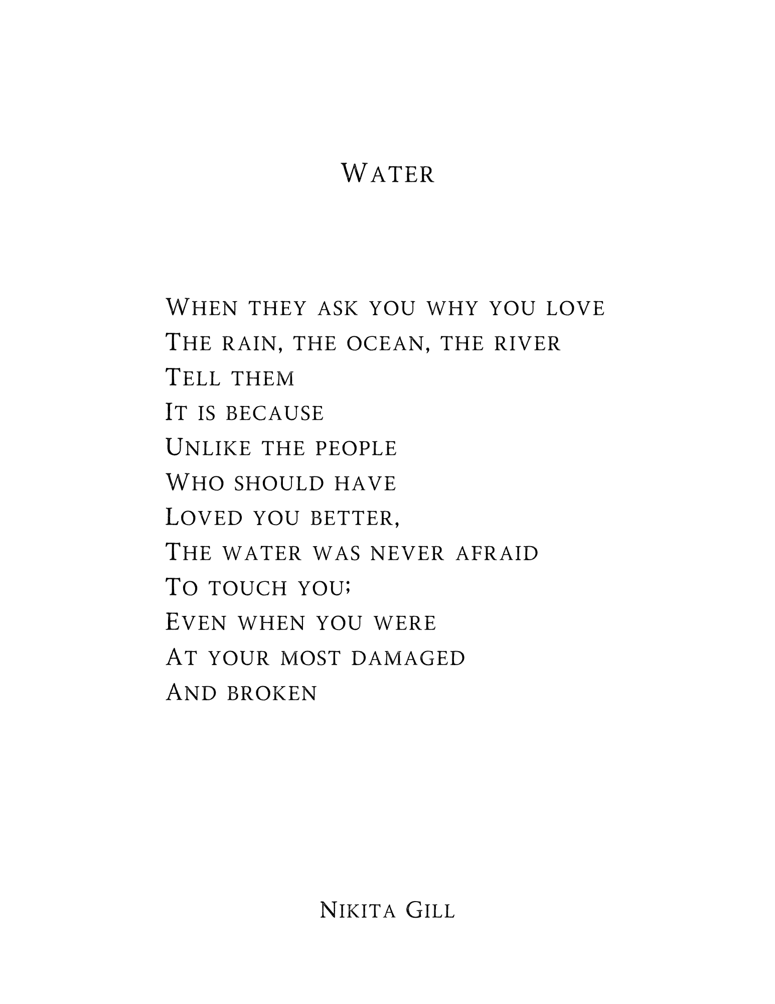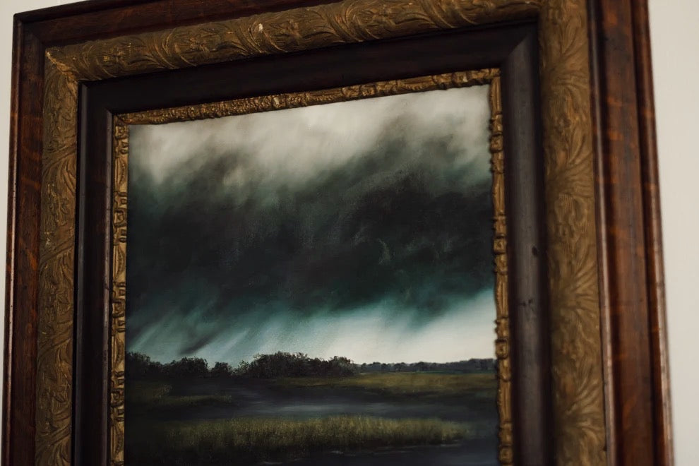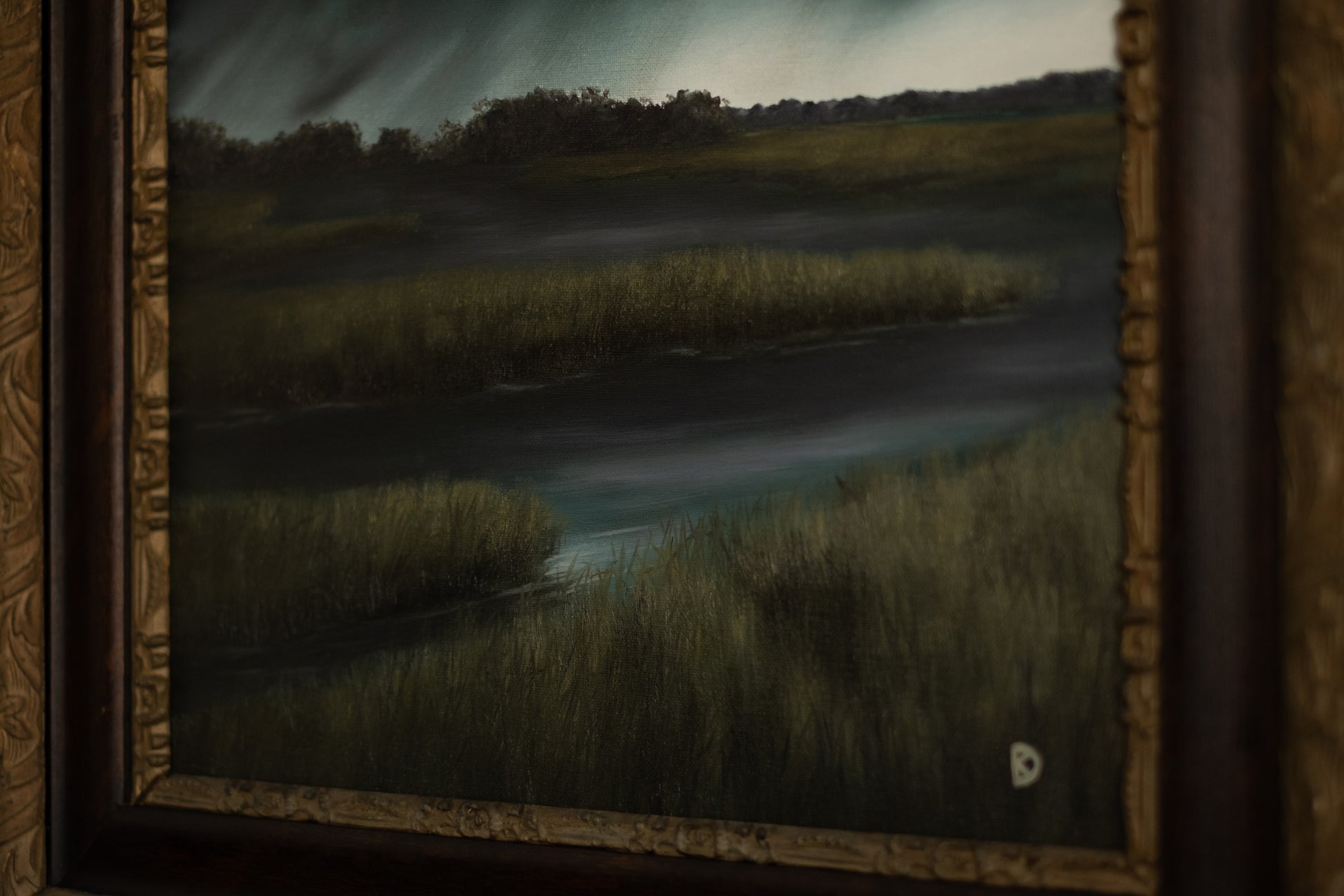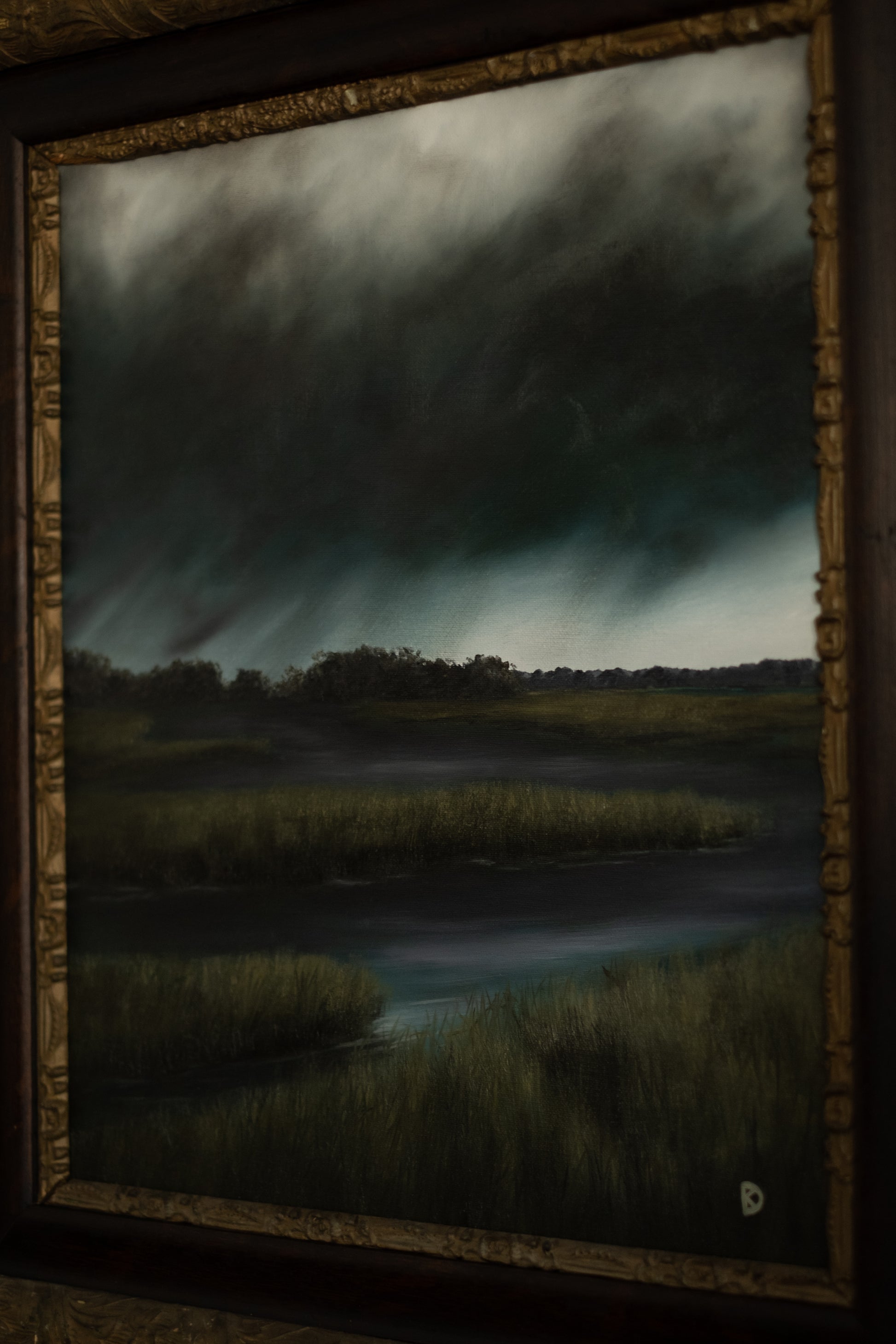 A storm of navy and dark teal encroaches on a marsh but despite the haze, the light remains bright off to the right. Named from the poem, "Water" by Nikita Gill.