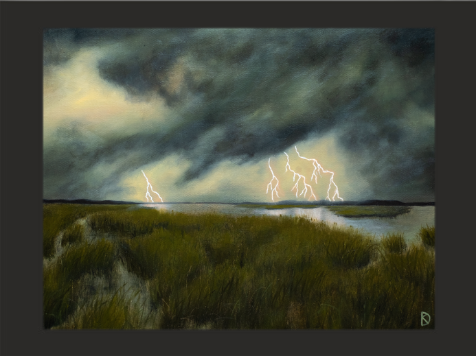 Muted peaches and navy blues make up this stormy marsh scene with bold lightning strikes on the horizon. Original oil painting on canvas by Kayla DeVito. Named from the poem, "Healing is a Process" by Whitney Hanson.