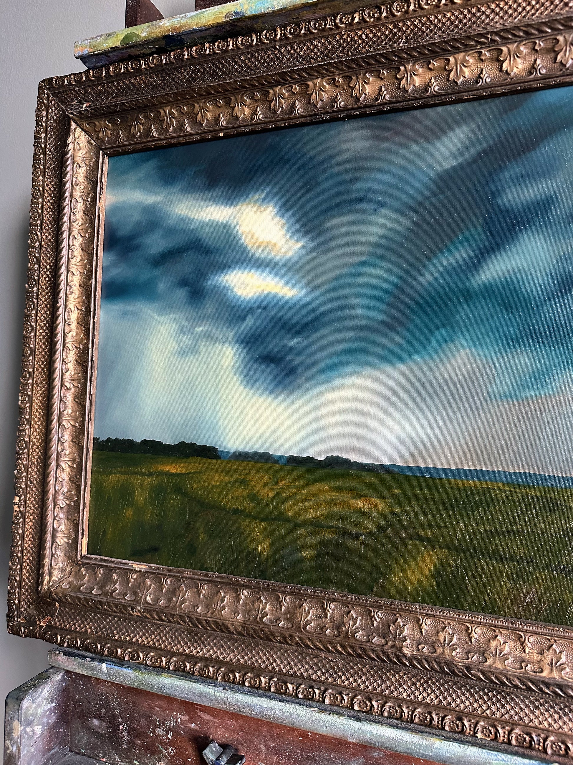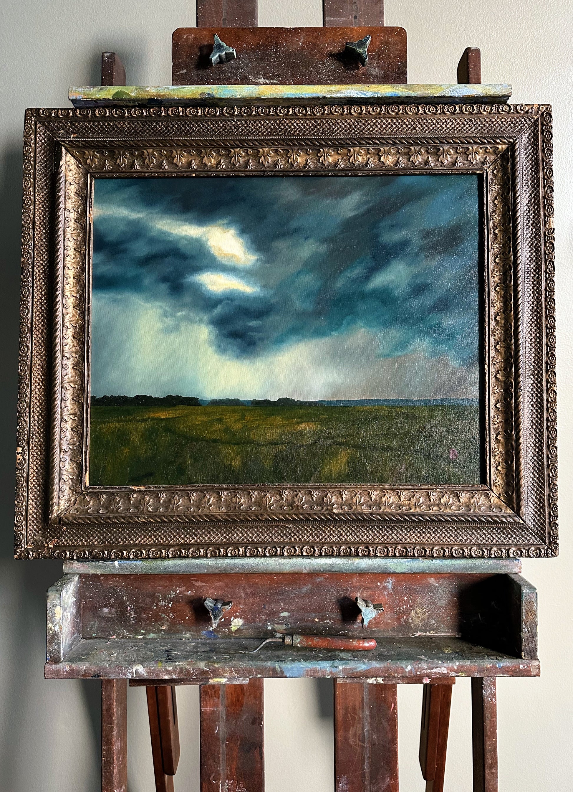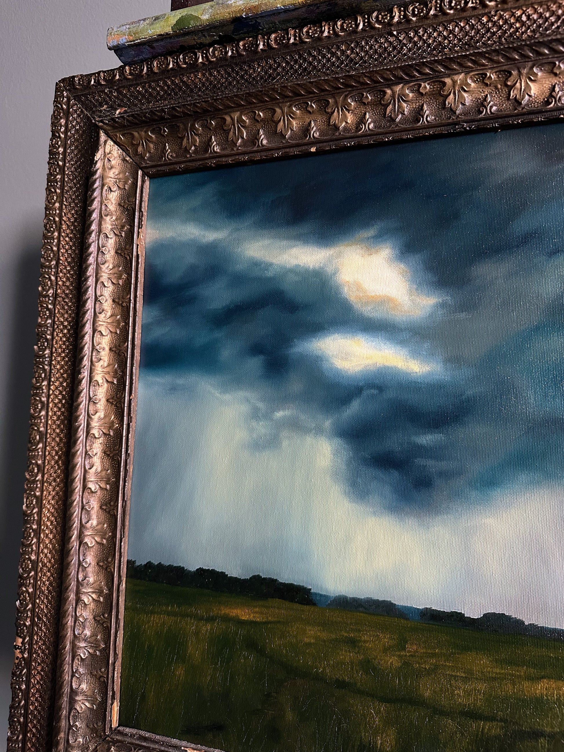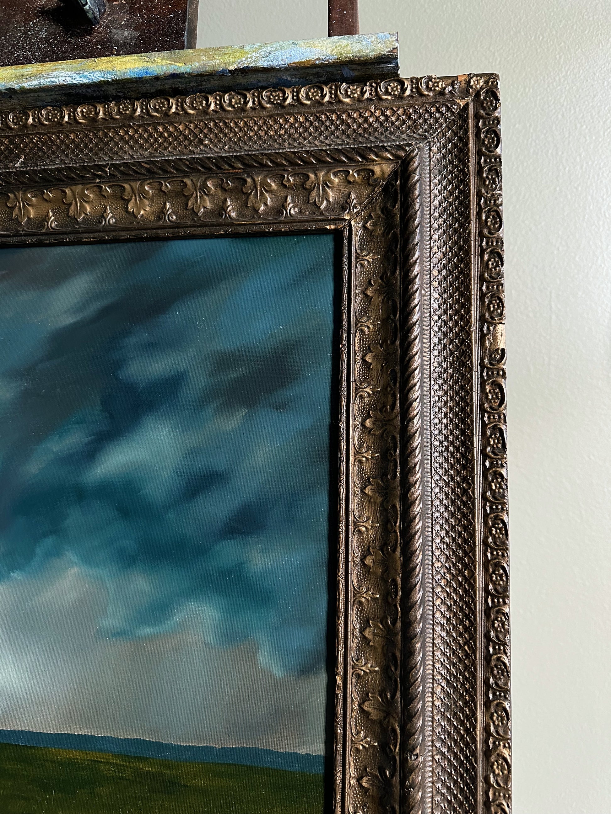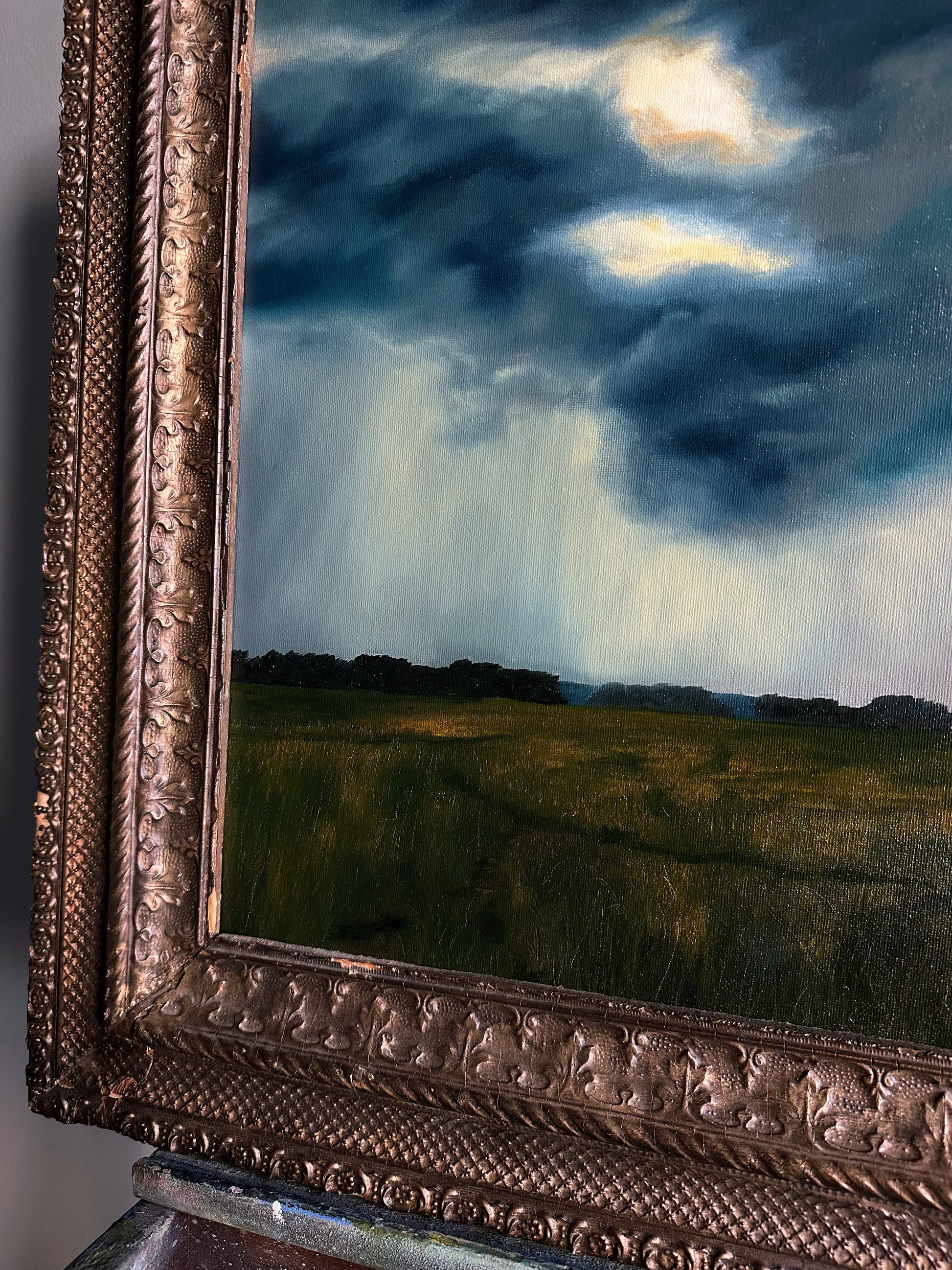 Oil on canvas panel, framed in a late 1800s frame. The frame features original, time-won character, adding to the overall charm of this piece. This scene was created specifically for this frame.