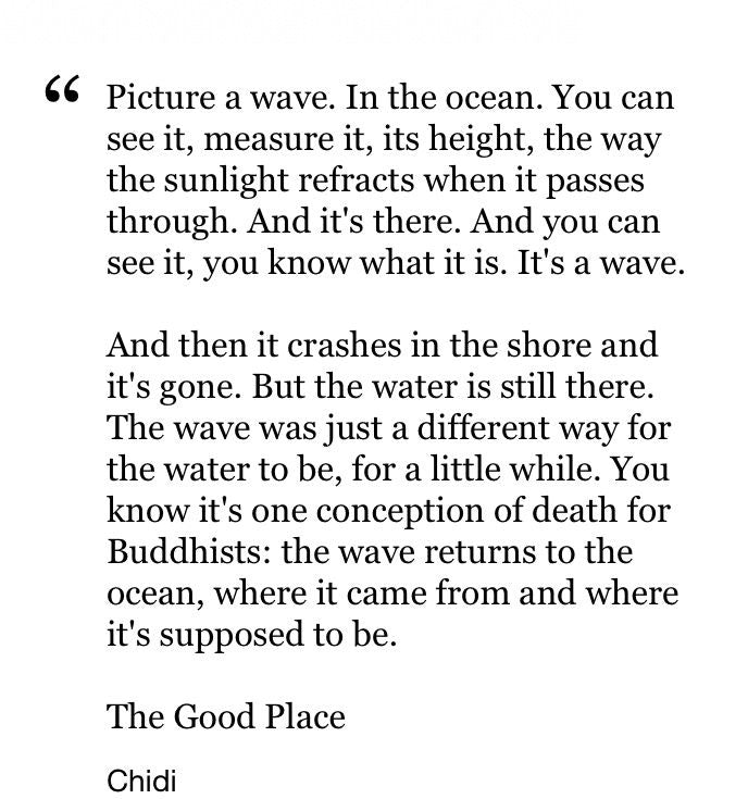 Painted/named from a quote by Chidi on The Good Place that outlines the Buddhist's view on death and life. It has become my favorite and most peaceful way of thinking about grief. This painting was sculpted first, then painted in oil paints, so there is much texture built up.