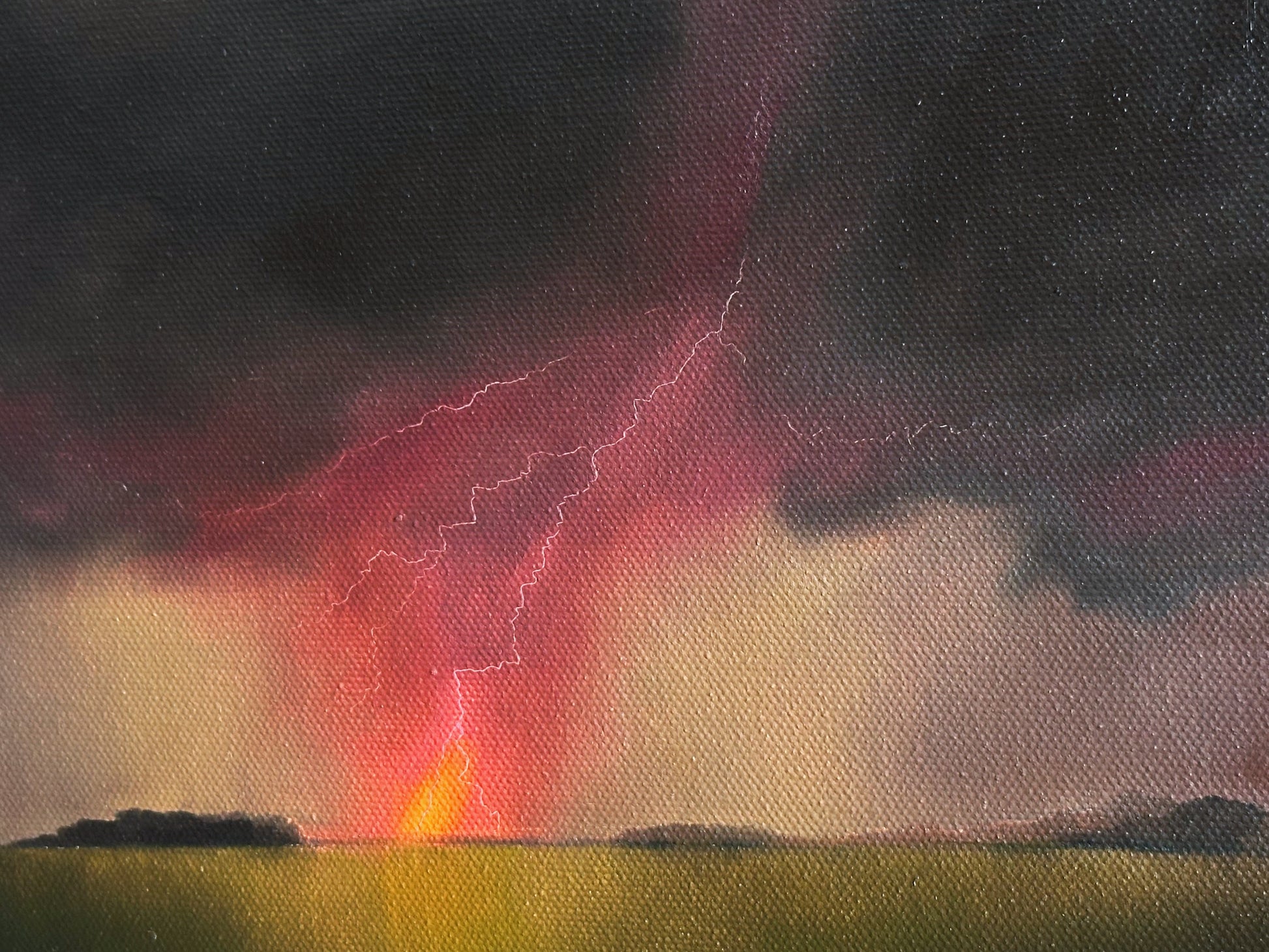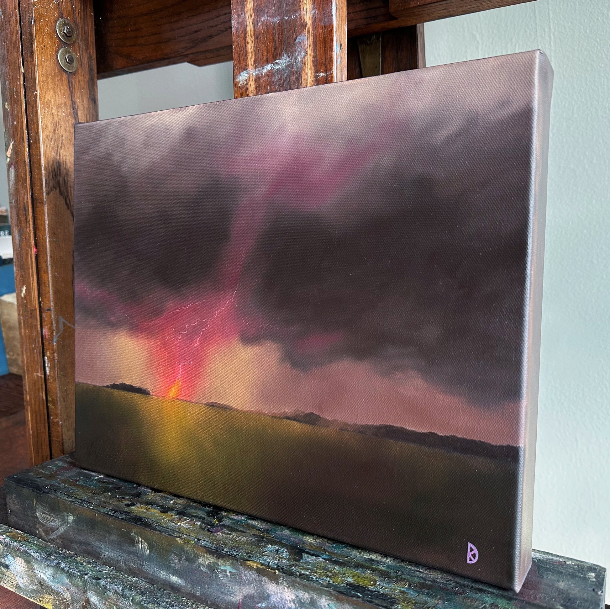 I don't usually create multiples of one image, as I think it can water-down the sentiment, but it felt pertinent that I create multiples of these; I just couldn't stop painting them. It felt like they were flowing out of my fingertips. While I've attempted, and failed, to portray lightning dozens of times, I feel I got it right with these: white hot strikes. And pink! Making the storms in dusty purples and magenta pink was symbolic, and very intentional. I want my collectors to see this image and feel the connection to other like-minded women. We're all on the same side, after all- the right one.