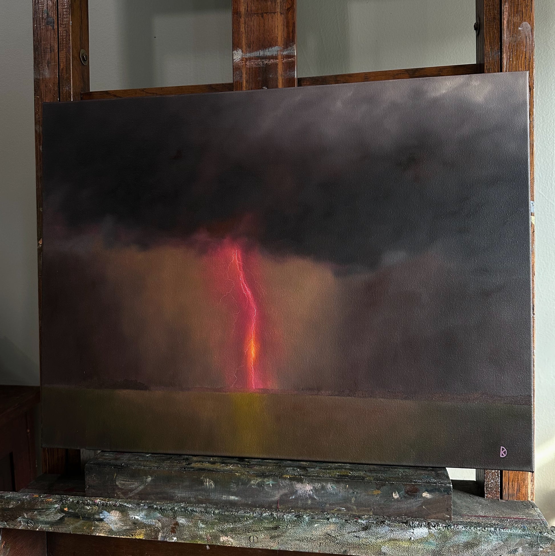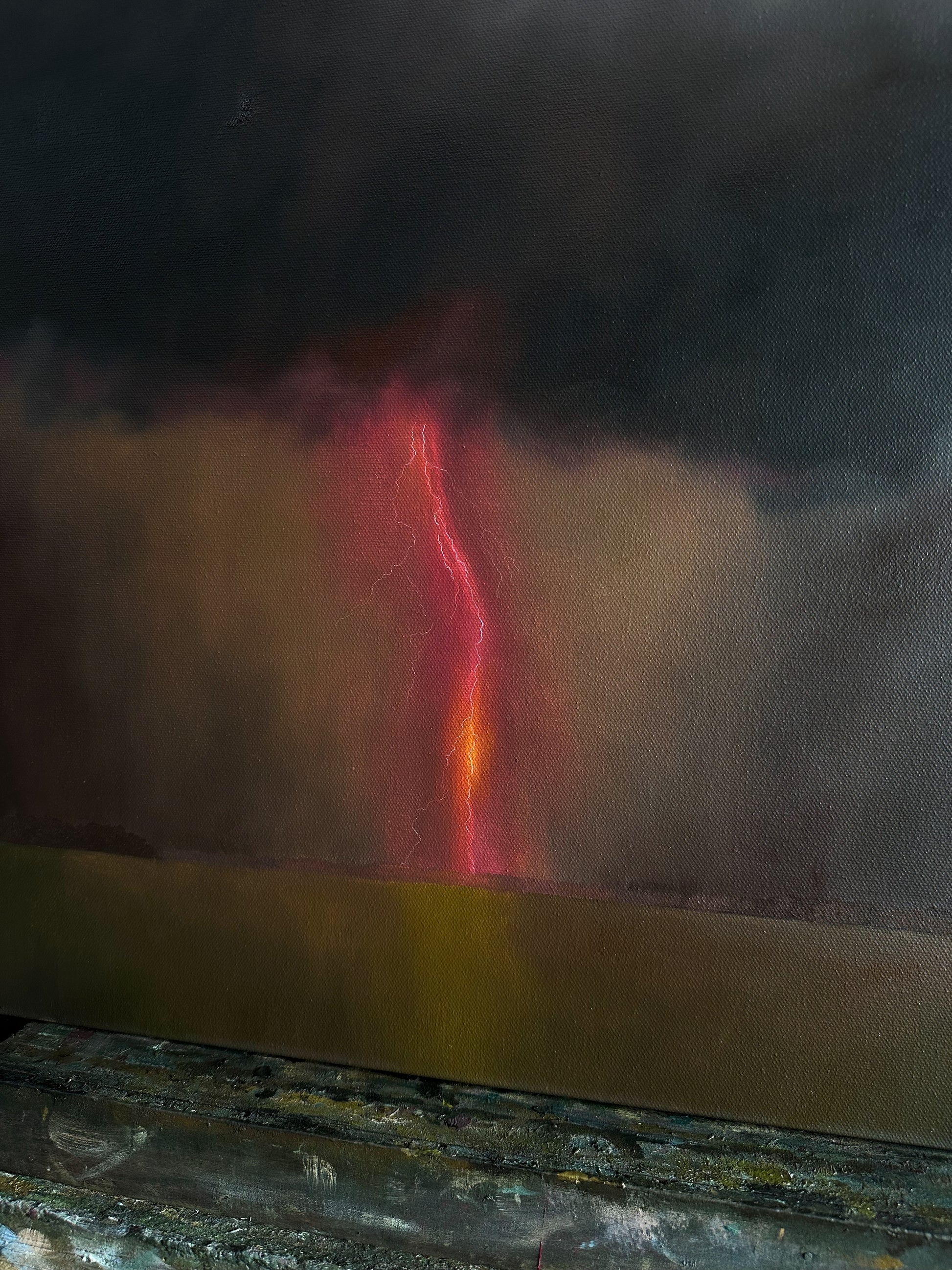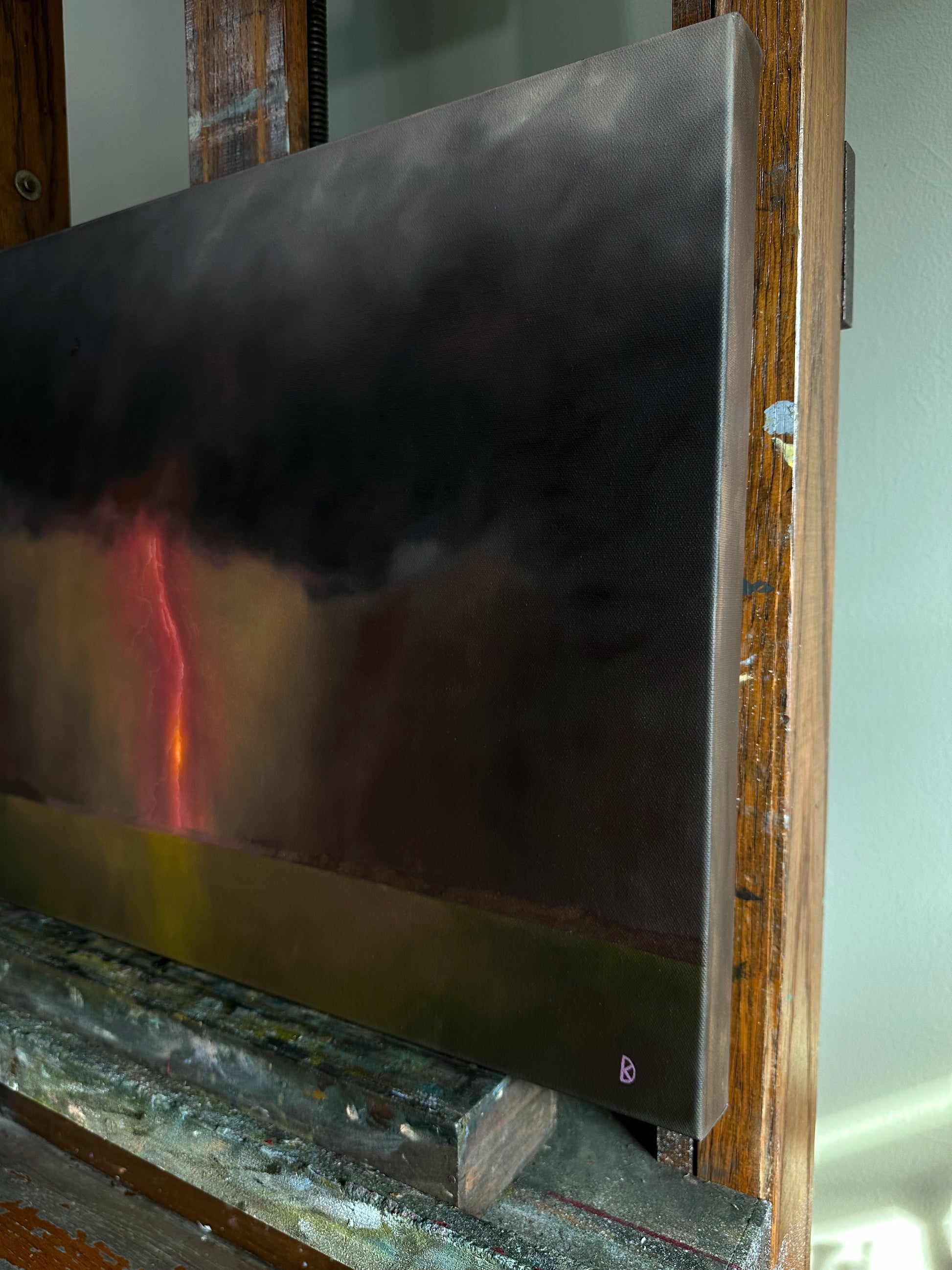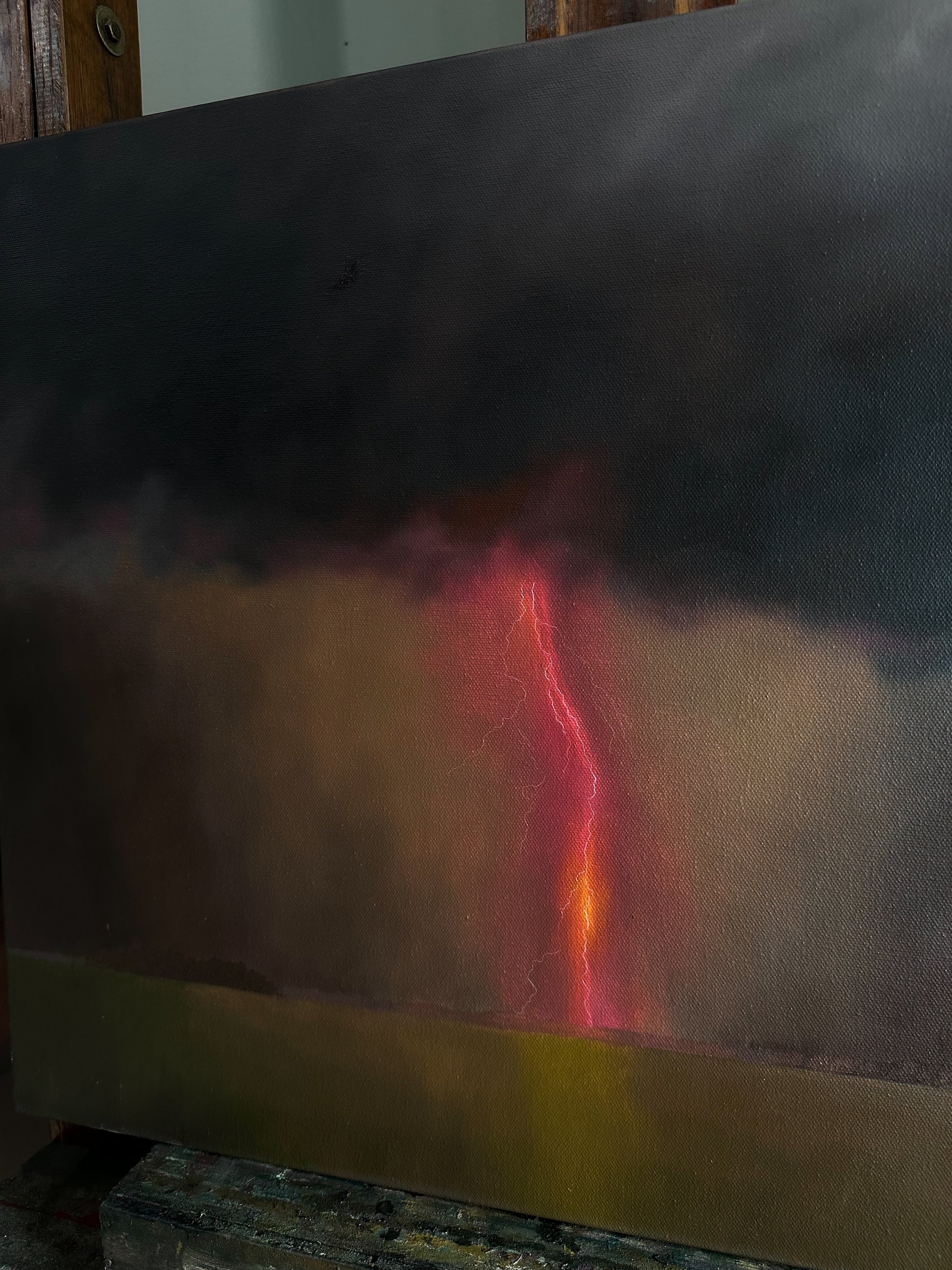 I don't usually create multiples of one image, as I think it can water-down the sentiment, but it felt pertinent that I create multiples of these; I just couldn't stop painting them. It felt like they were flowing out of my fingertips. While I've attempted, and failed, to portray lightning dozens of times, I feel I got it right with these: white hot strikes. And pink! Making the storms in dusty purples and magenta pink was symbolic, and very intentional. I want my collectors to see this image and feel the connection to other like-minded women. We're all on the same side, after all- the right one.