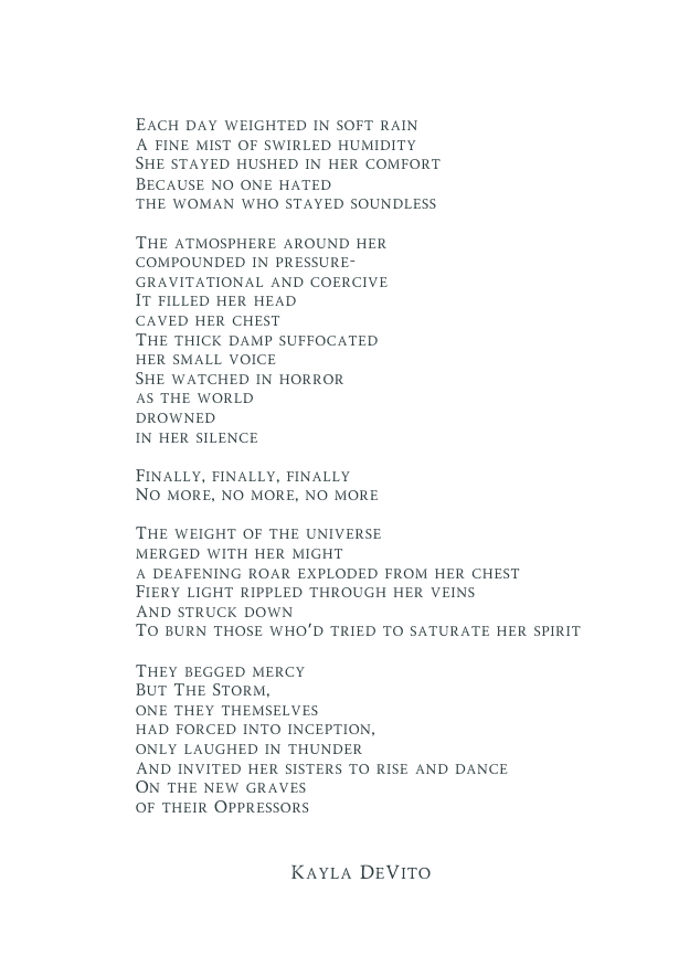 These lightning scenes were created, more or less, from the notion of female rage against society: beauty standards, sexist comments, inequality, harassment, the pressures young women face of having/not having families and other injustices we women deal with on a daily basis that aren't talked about enough. I searched for hours and couldn't find a poem that represented what I wanted these images to silently strike in one's mind, so I wrote one.
