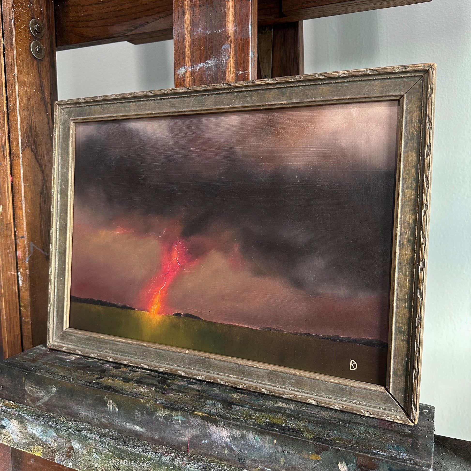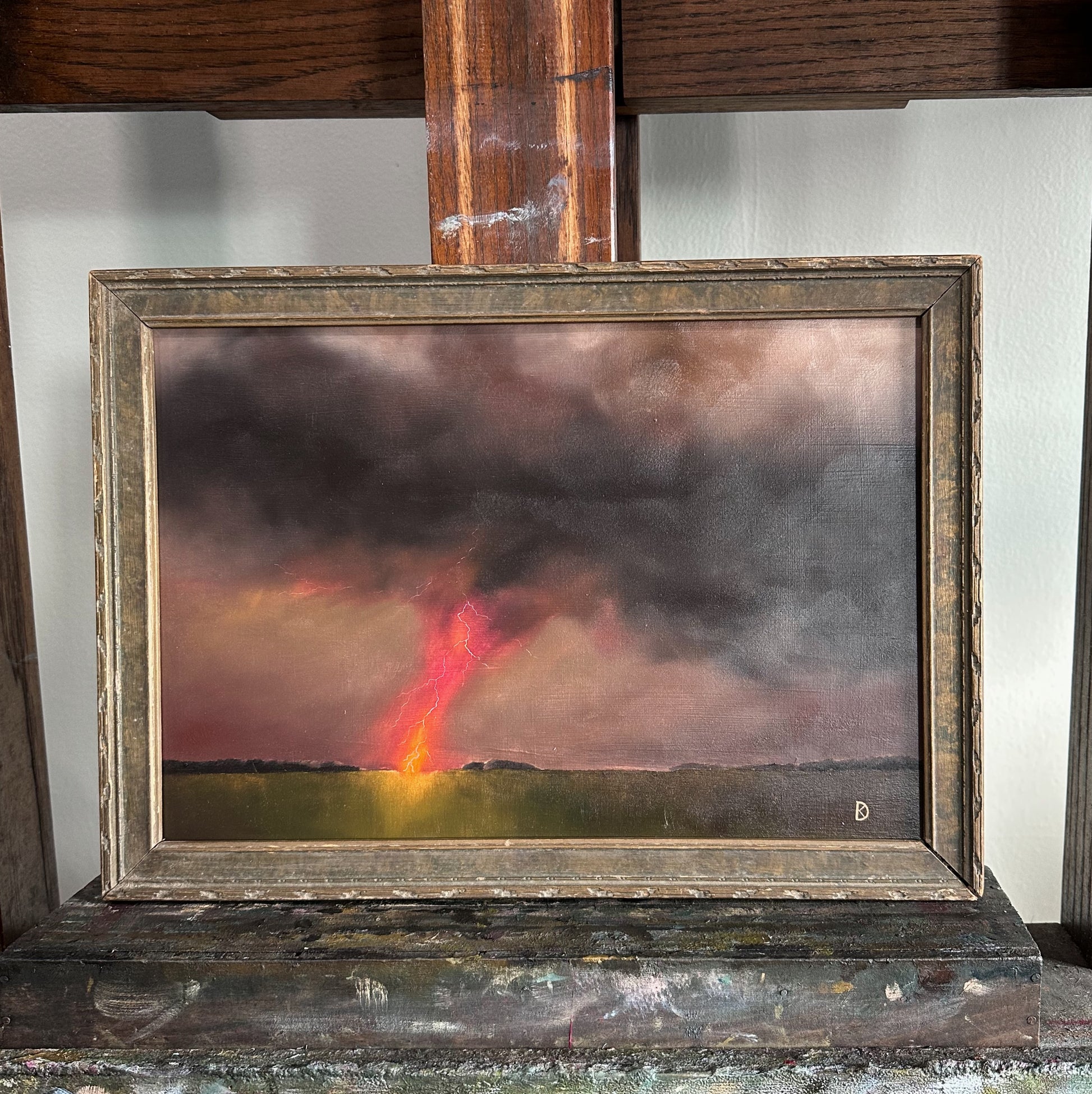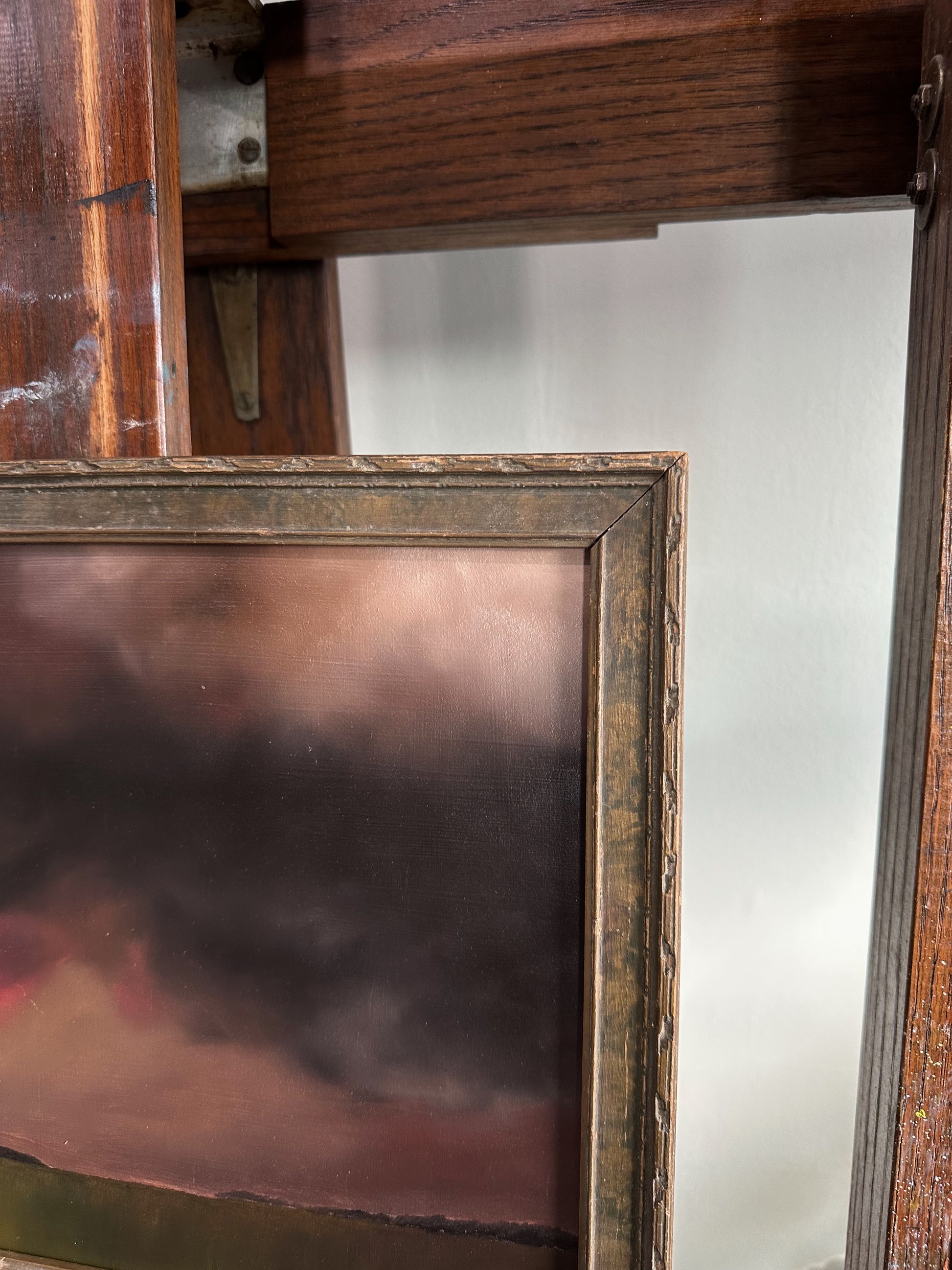Oil on custom hardboard, framed in an 1890s frame. The frame features original, time-won character, adding to the overall charm of this piece. This scene was created specifically for this frame.