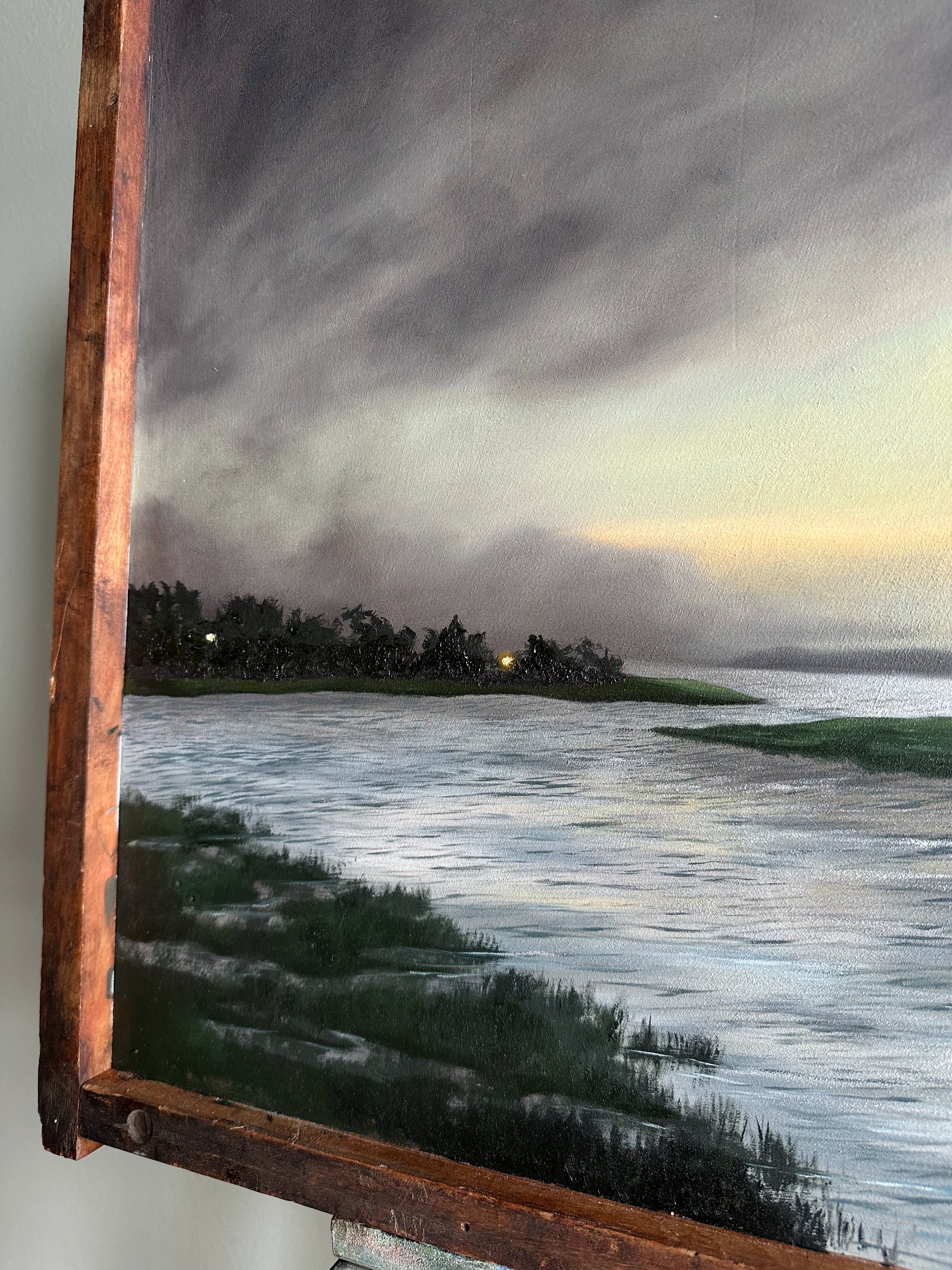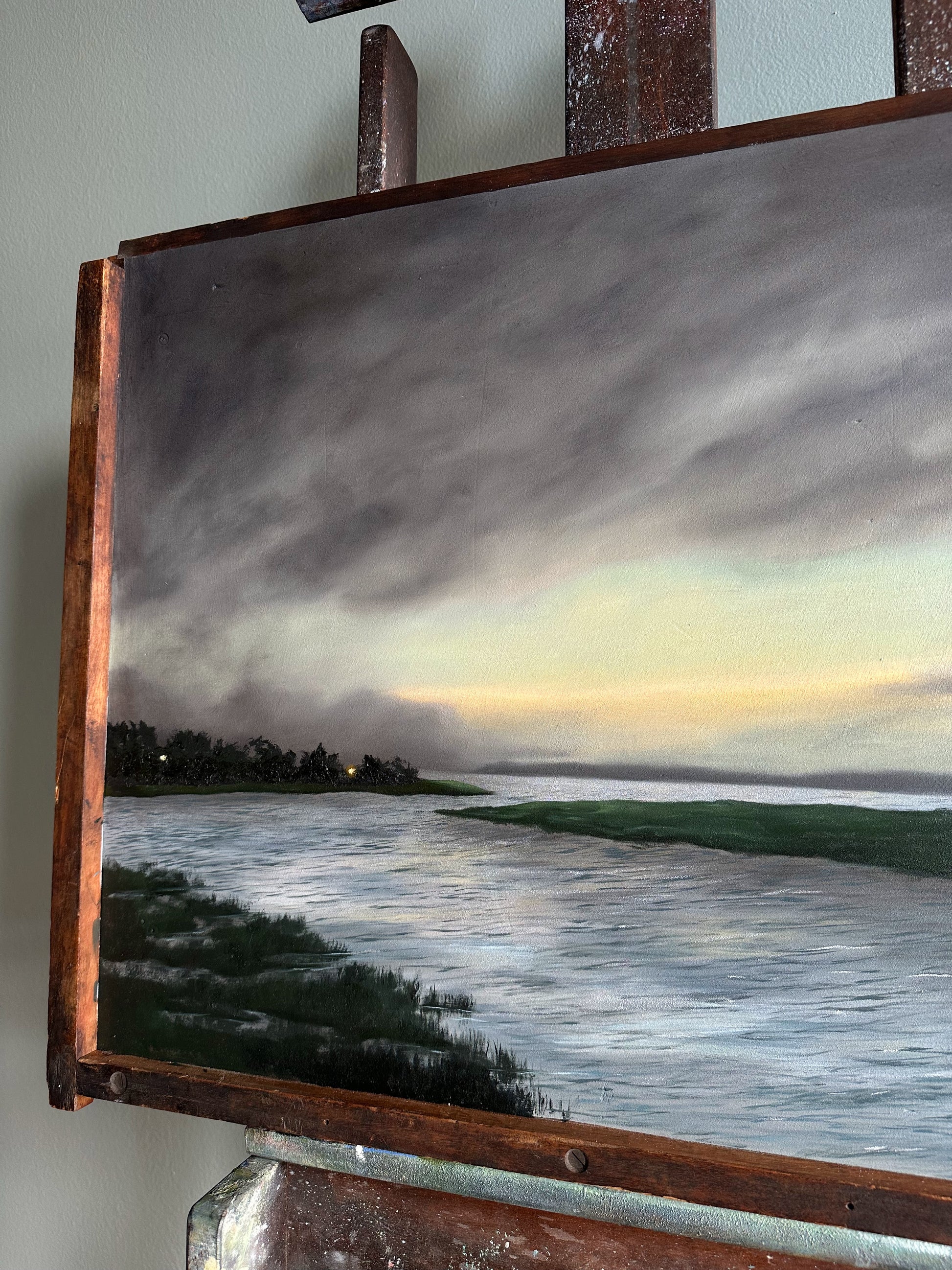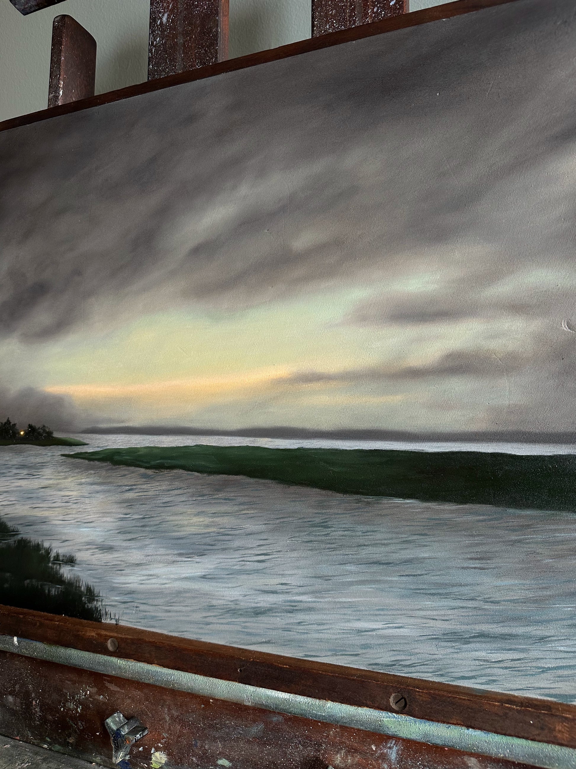 This painting is meant to represent platonic love from family and friends, and its steady rhythm, despite the unexpected twists and turns of life. This scene is one I see daily, and reaches out from a bridge over brackish water towards the open ocean. The lands beside a river are always fixed and ever-present, like walking through a line of loved ones cheering you on in slow motion as you embark on new journeys, tough life decisions and/or decide to take on difficult waters.