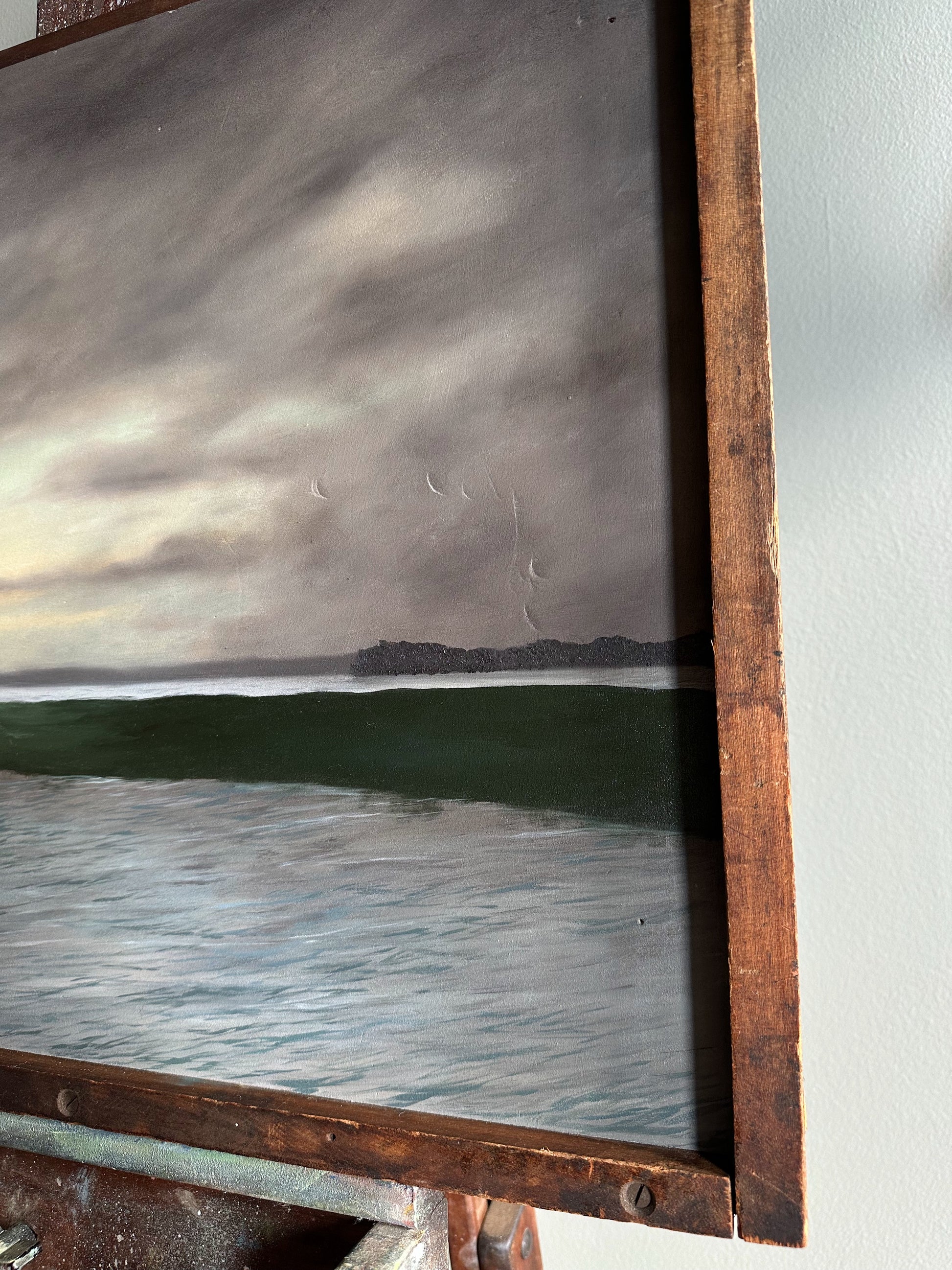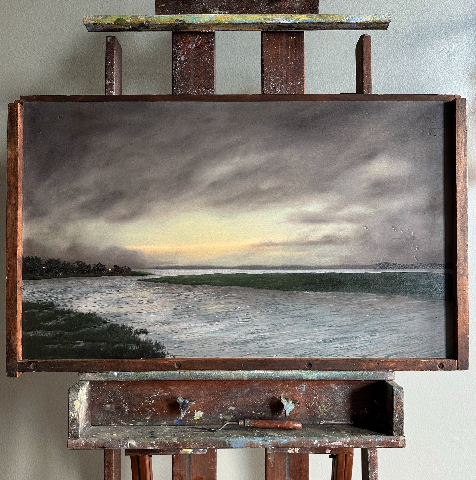 “River Finds the Sea” Oil Painting on Antique French Printers Tray - 32.3” x 19.75”