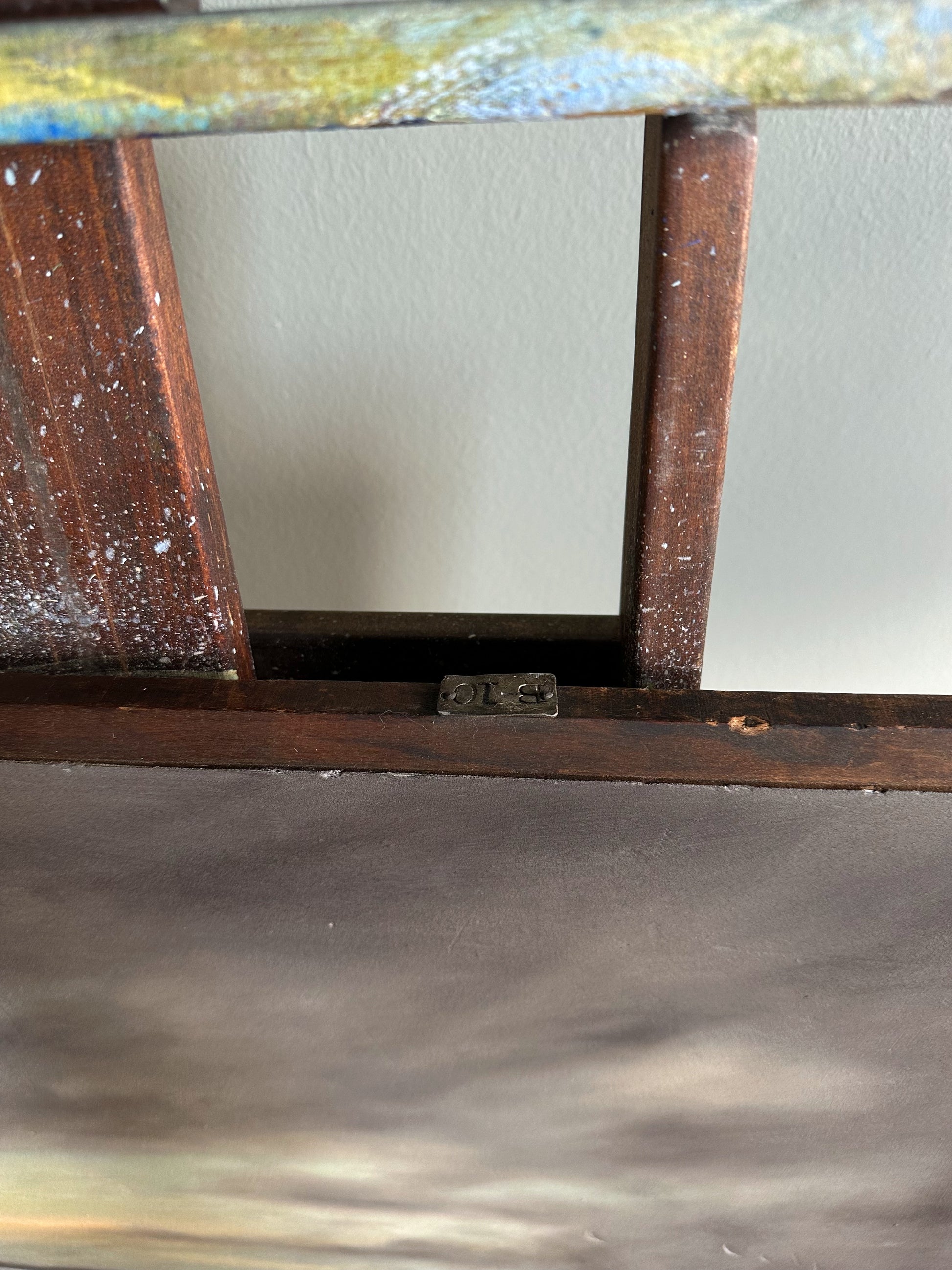 Oil on a solid heavy oak antique printers tray from France. The tray features the original small numbered tag on the top. Please note that this tray is a true antique, and as such, features marks and dings underneath the paint instead of a super smooth surface. I feel this adds character to the overall piece.