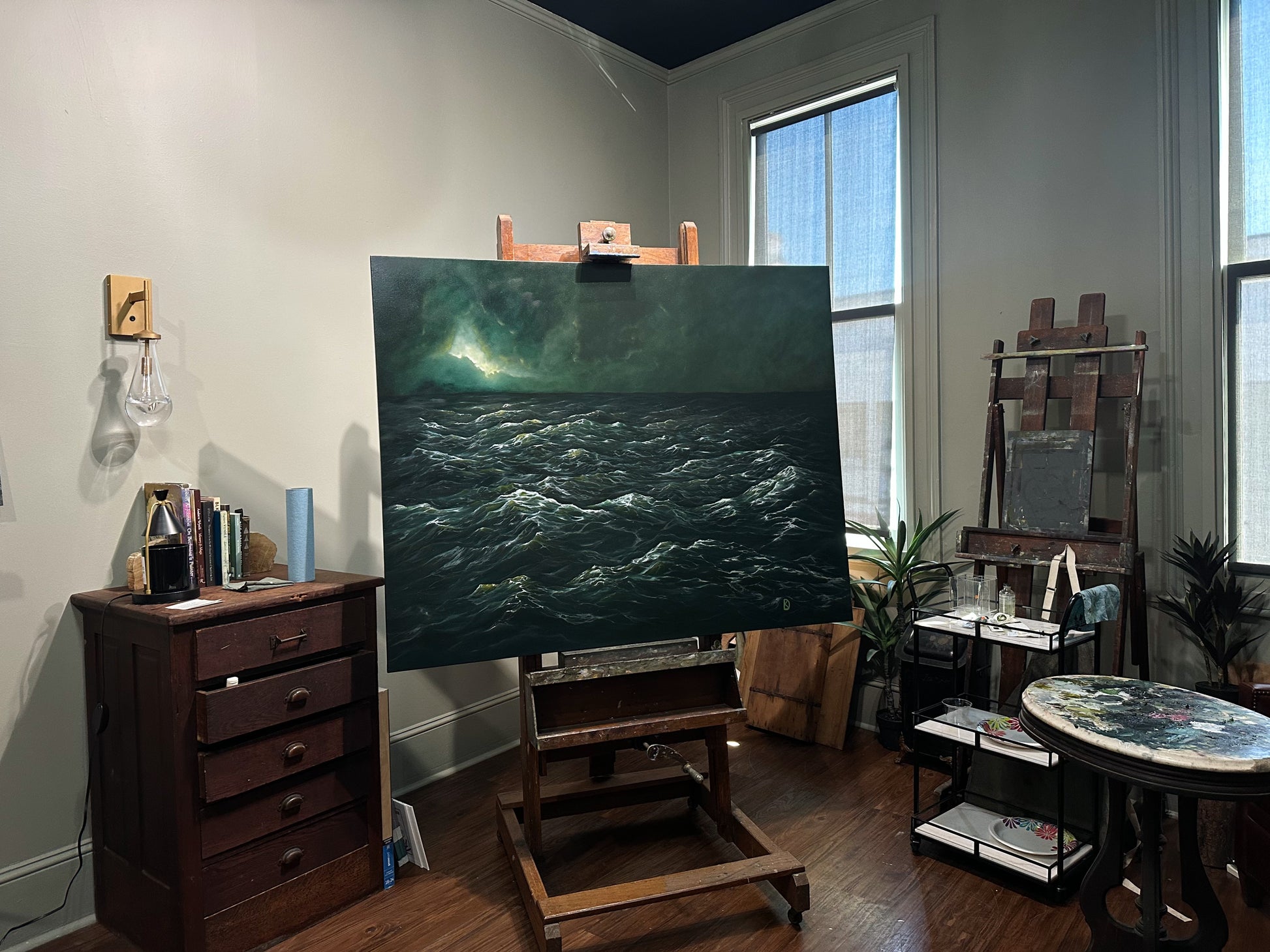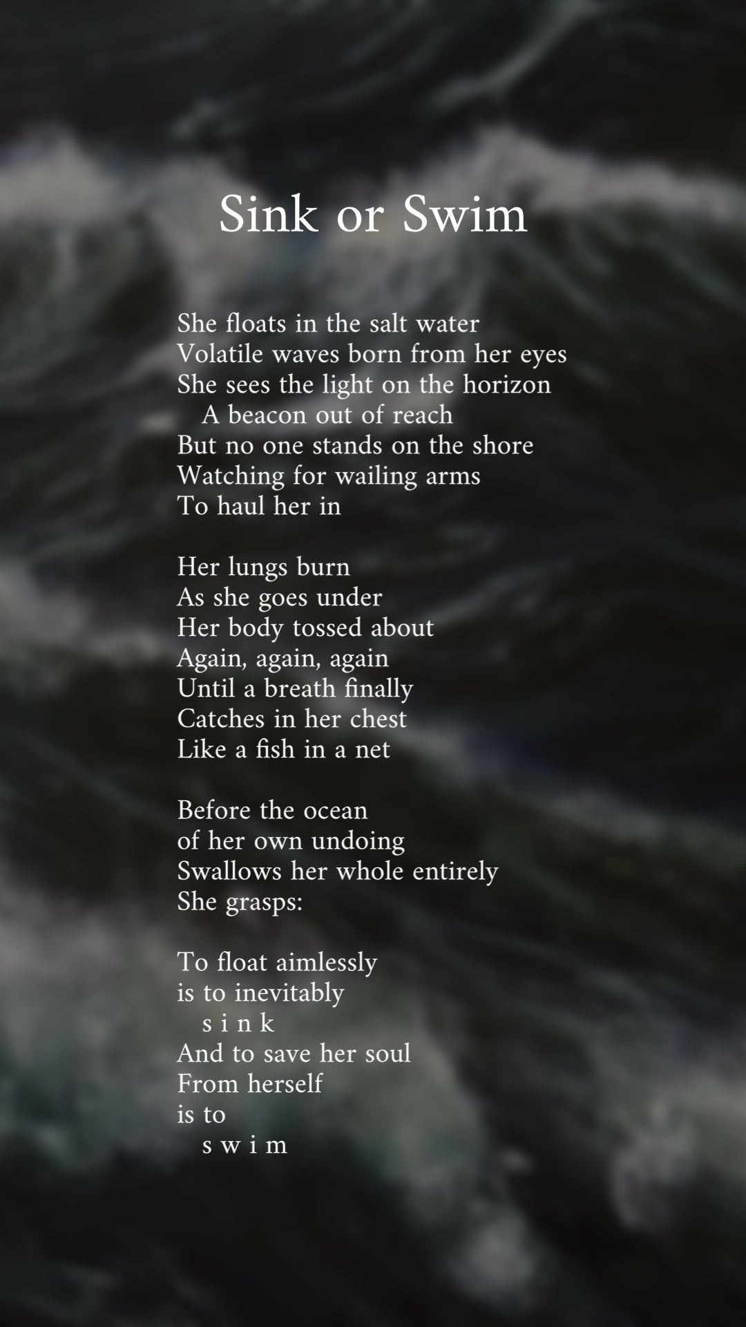 This is a special seascape scene that I painted to represent feeling hopeless and lost, and the importance- and strength- of saving yourself during times likes these. It also includes maybe finding no footing with those around you but finding strength through whatever empowers you: religion, giving back, therapy, etc. We often hear of how others played a part in being our saving grace, but it's also understated how powerful it is when you're forced to pick yourself up time and time again. This is to represent all those who've been forced to be strong, been forced to choose between sink or swim, and chose to swim like hell to save themselves. I see you and your quiet strength.