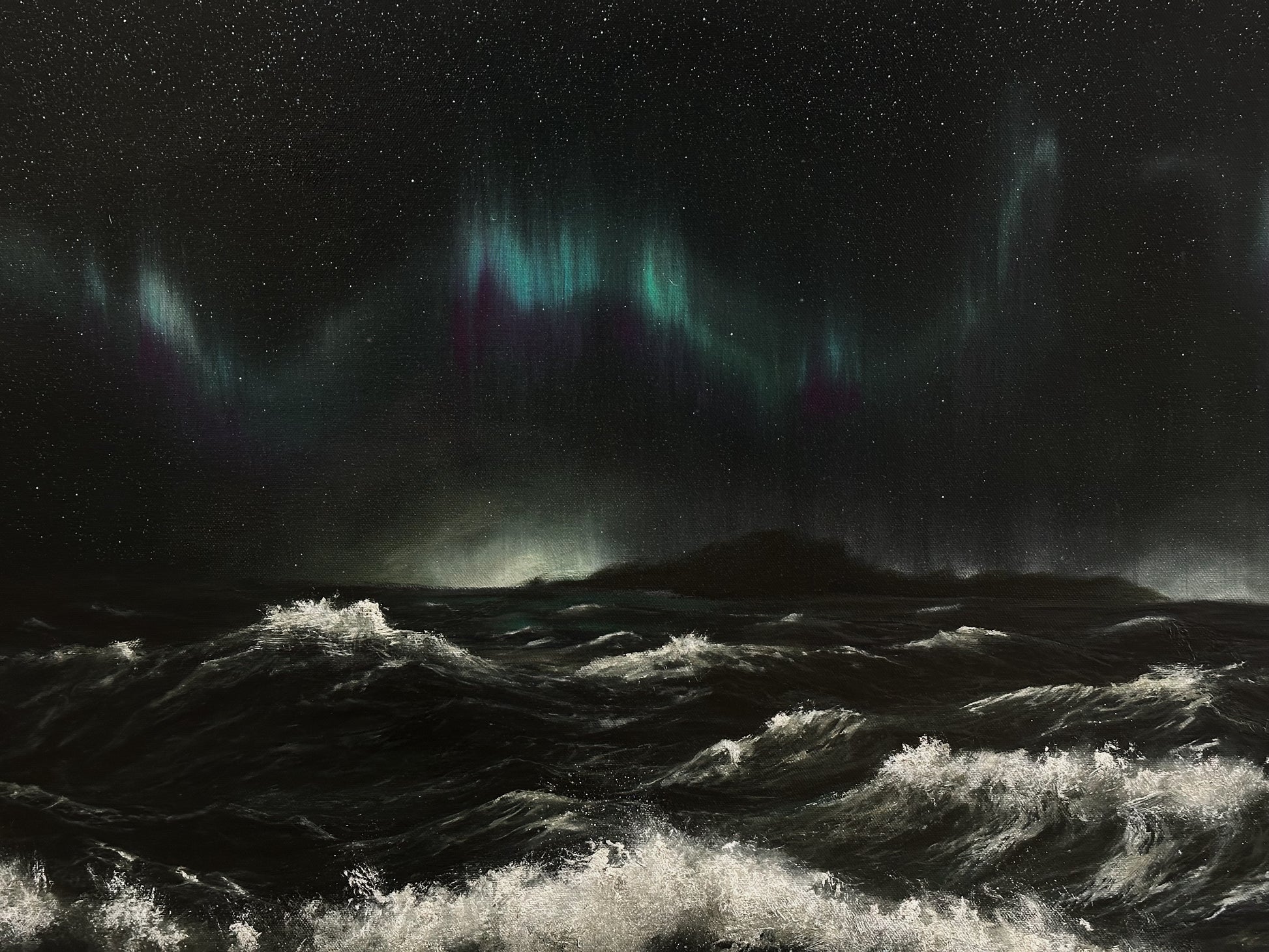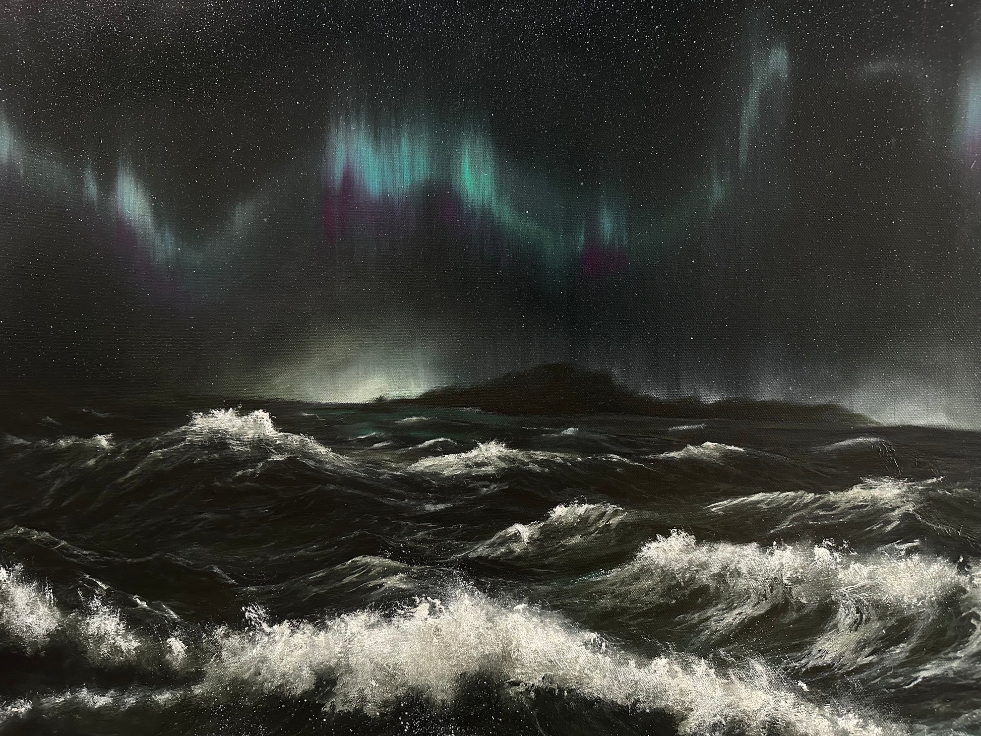 This is a special seascape scene that I painted to represent feeling hopeless and lost, and the importance- and strength- of saving yourself during times likes these. It also includes maybe finding no footing with those around you but finding strength through whatever empowers you: religion, giving back, therapy, etc. We often hear of how others played a part in being our saving grace, but it's also understated how powerful it is when you're forced to pick yourself up time and time again. This is to represent all those who've been forced to be strong, been forced to choose between sink or swim, and chose to swim like hell to save themselves. I see you and your quiet strength. I added the aurora borealis to this painting to add a symbol of loved ones who've passed on that may also aid as a "guiding light," even if we no longer have help earthside. They're always watching over us and cheering us on. I added thousands of teeny stars behind the lights, and an island illuminated from behind, representing guidance and safety just up ahead. These lights can also symbolize holding onto hope brought in by religion, through dark times.