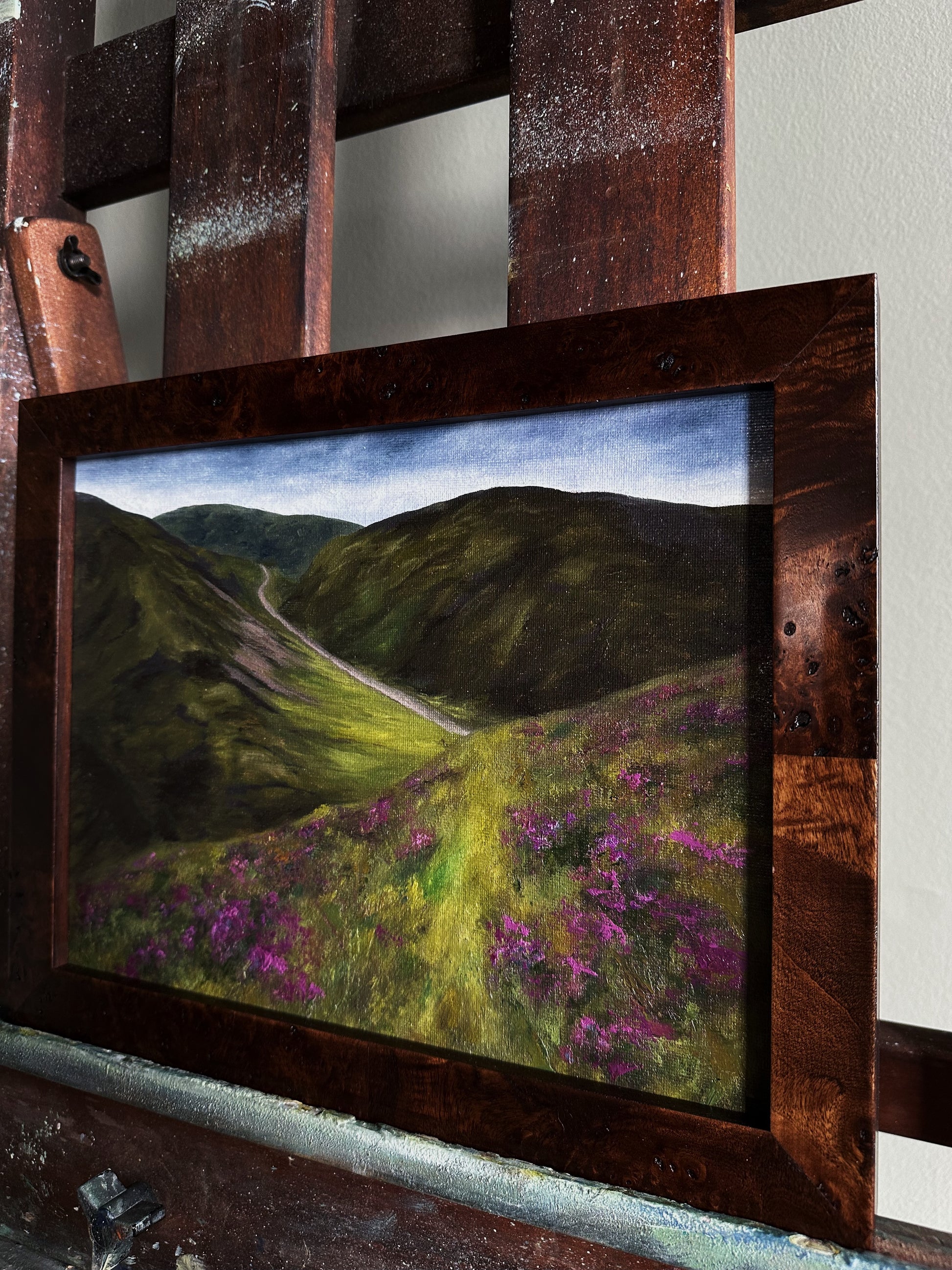 Oil on canvas panel, framed in a handmade burlwood frame.