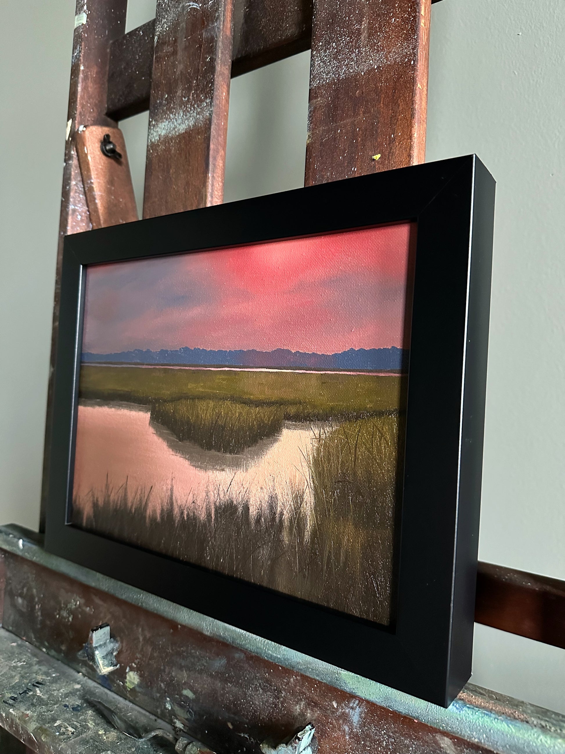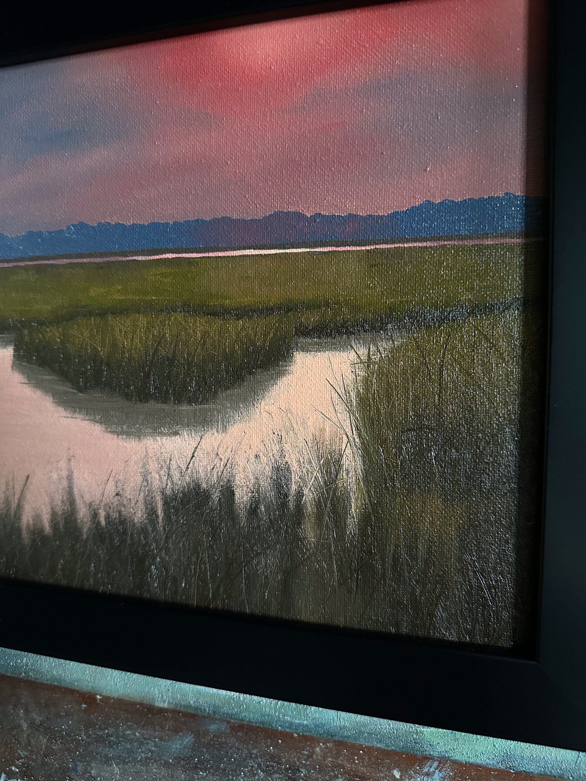 Oil on canvas, framed in a modern black frame.