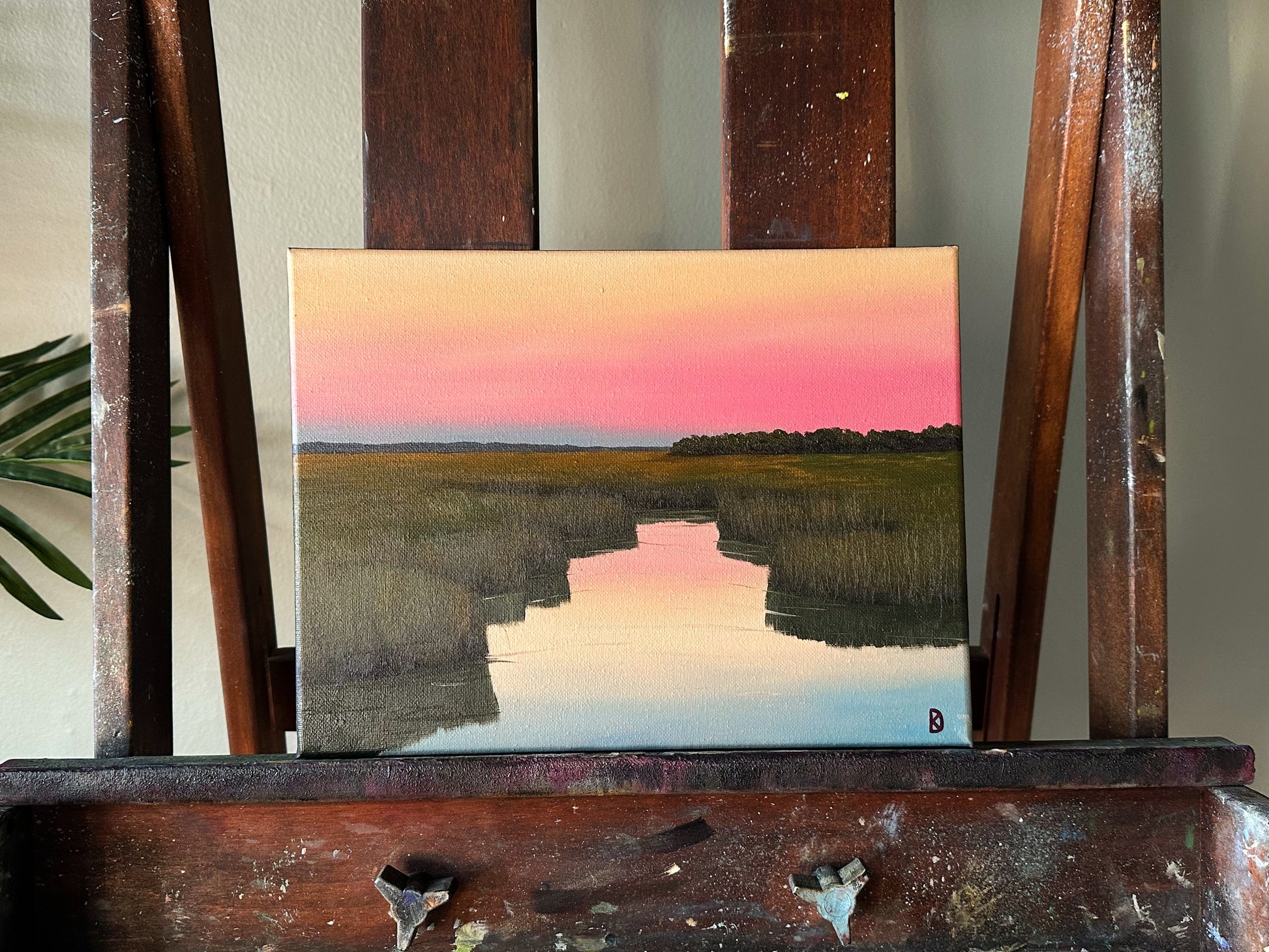 Painting size is 9” x 12”. Unframed, with painted sides. Can be hung as-is.
