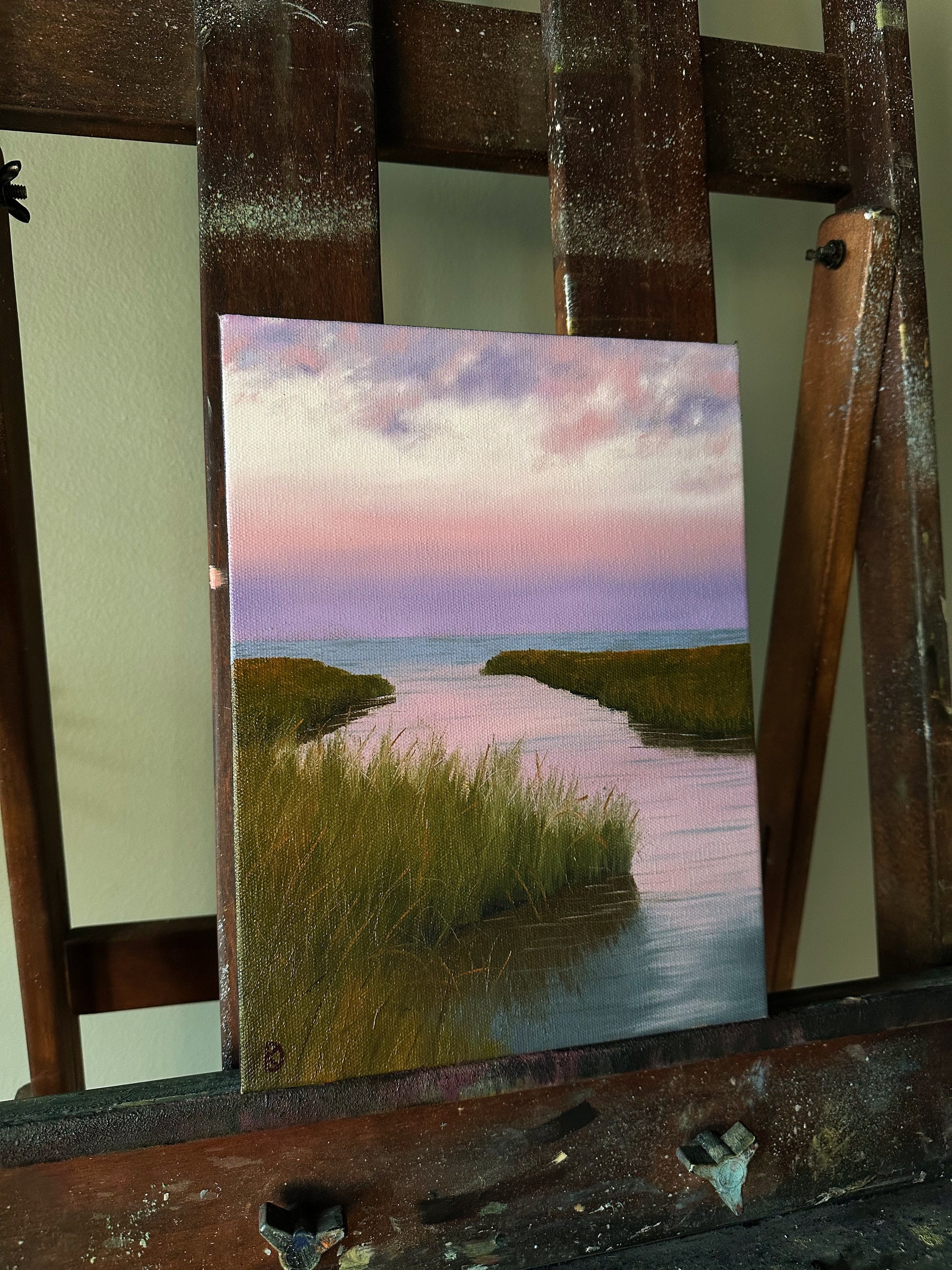 Painting size is 9” x 12”. Unframed, with painted sides. Can be hung as-is.
