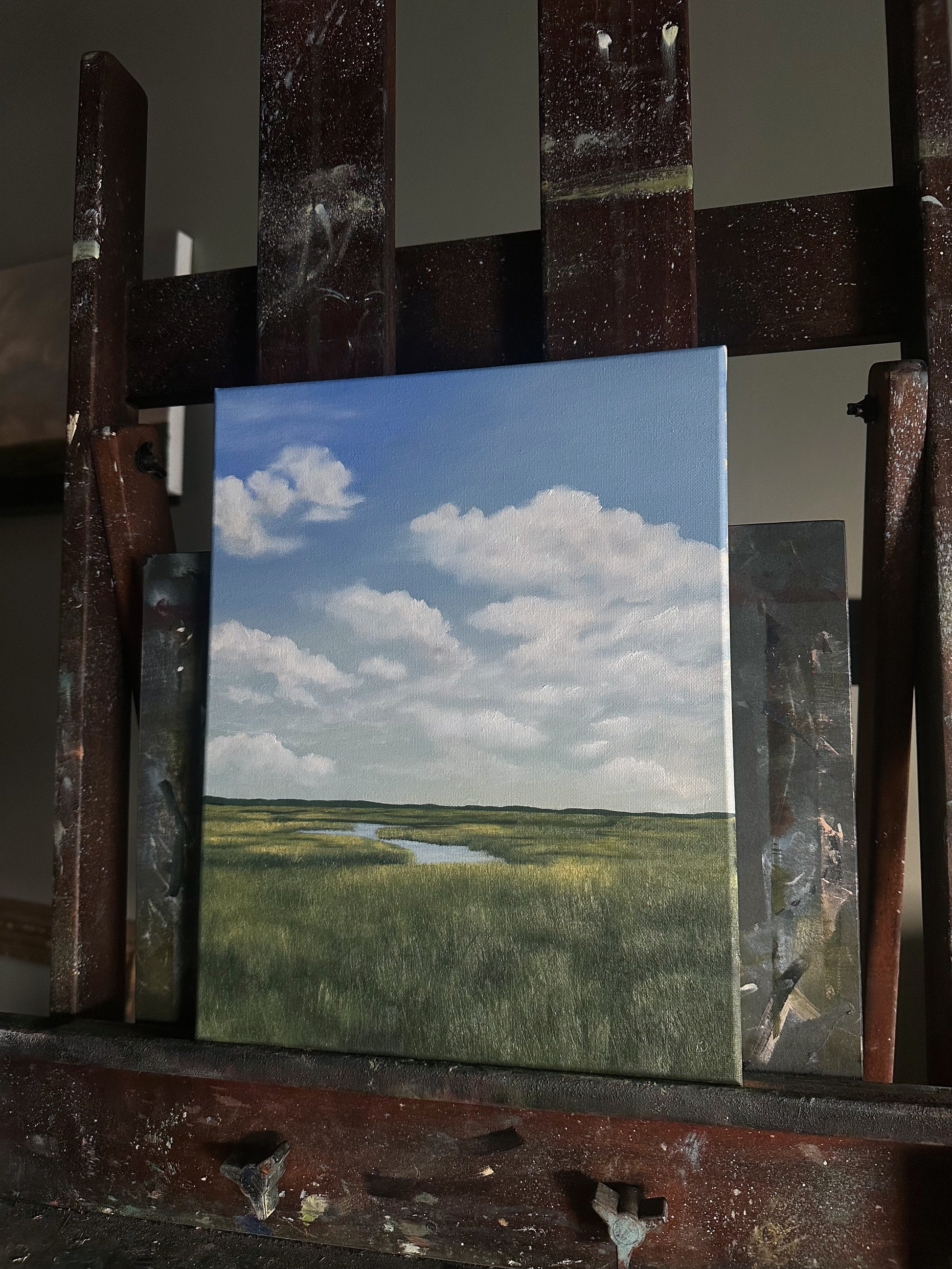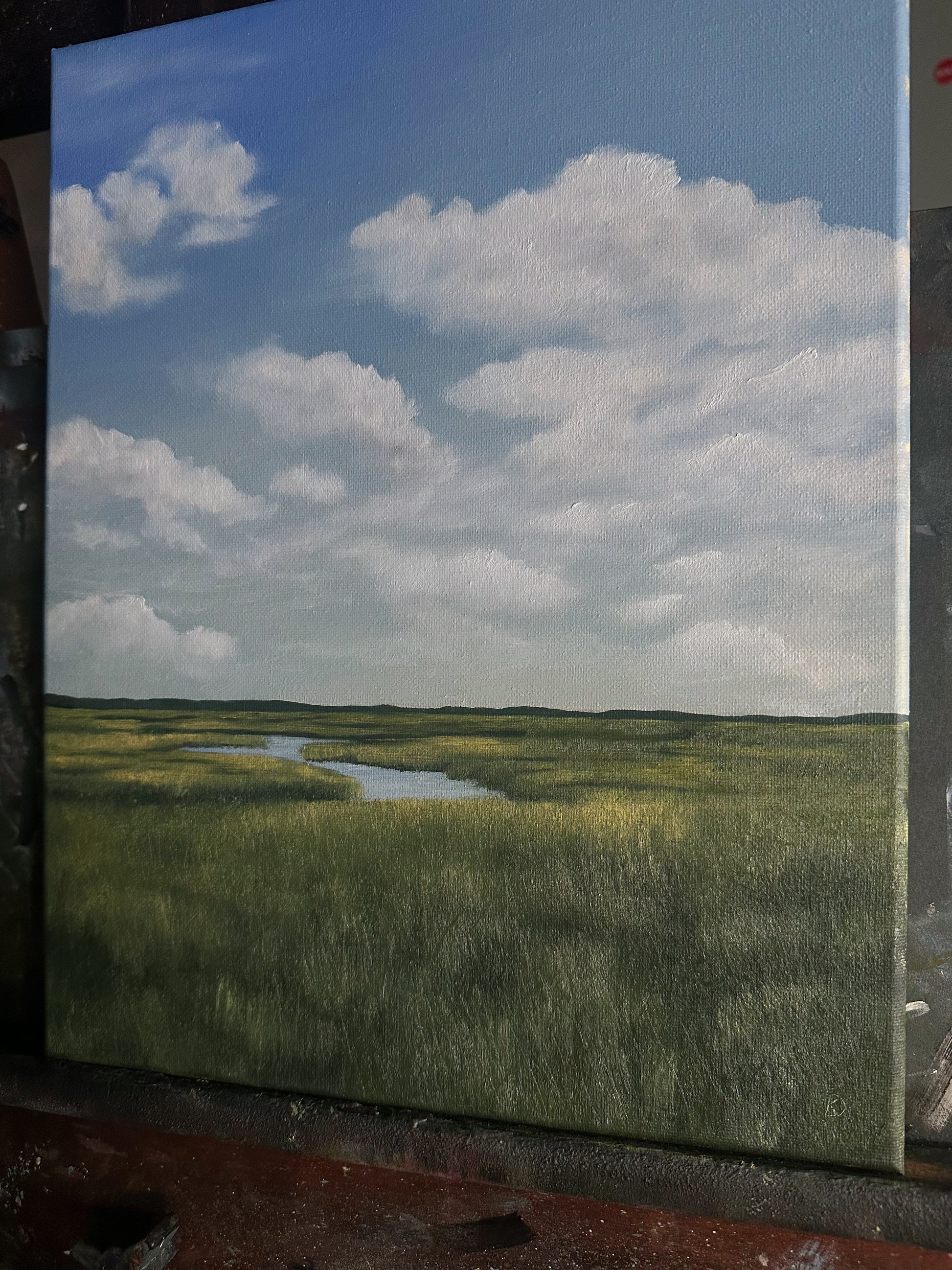 Study of the marsh grass with a blue sky. Oil on canvas with painted sides.