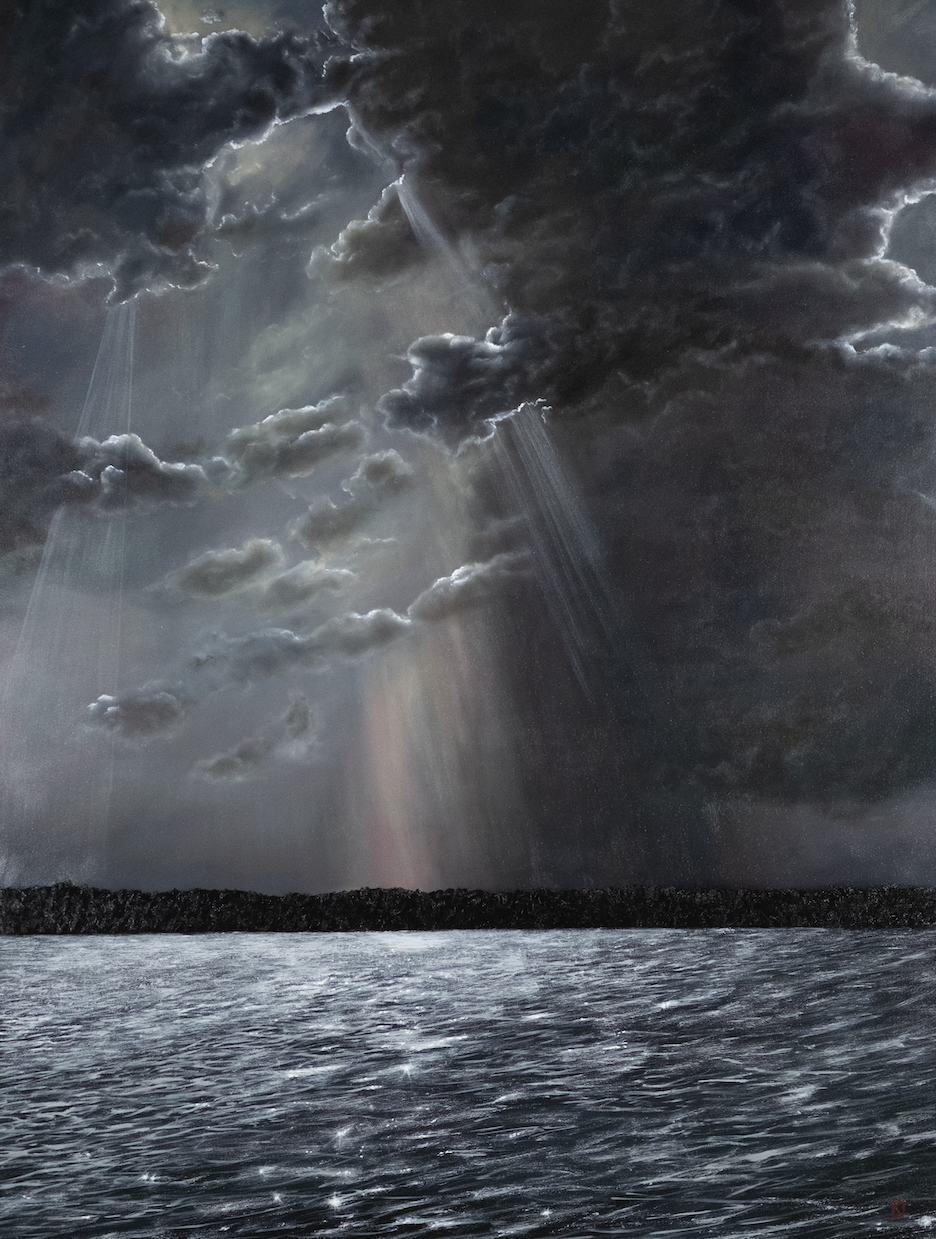A daytime storm scene moving quickly across a body of salt water, representing grief that pops up seemingly out of nowhere and lingers for a bit before moving on. This painting was created to represent the aftershocks of grief- whether it be weeks, months or years later- and the swiftness of its efficiency. While I often depict deep emotions in my works, I never paint a dark scene without a light source, signifying hope in even the darkest of times. I like to think this one in particular has strong visible rays reaching down from the Heavens- our loved ones reaching out when we miss them the most, as if to say, “Look up. I’m still here.”