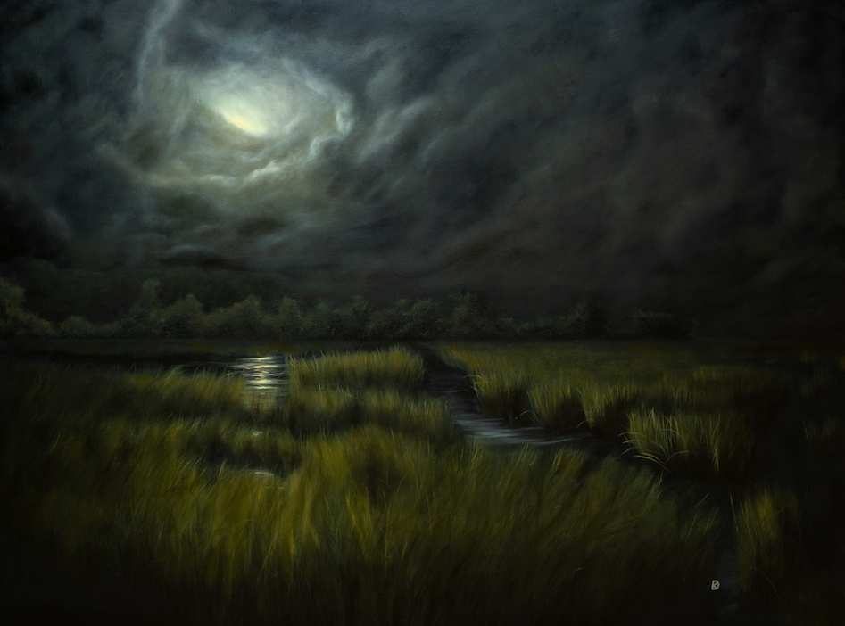 The essence of a bright moon lights up a calm, salt marsh from behind a tunnel of clouds. Original oil painting by Kayla DeVito on deep canvas, named from an excerpt by Xan Oku.