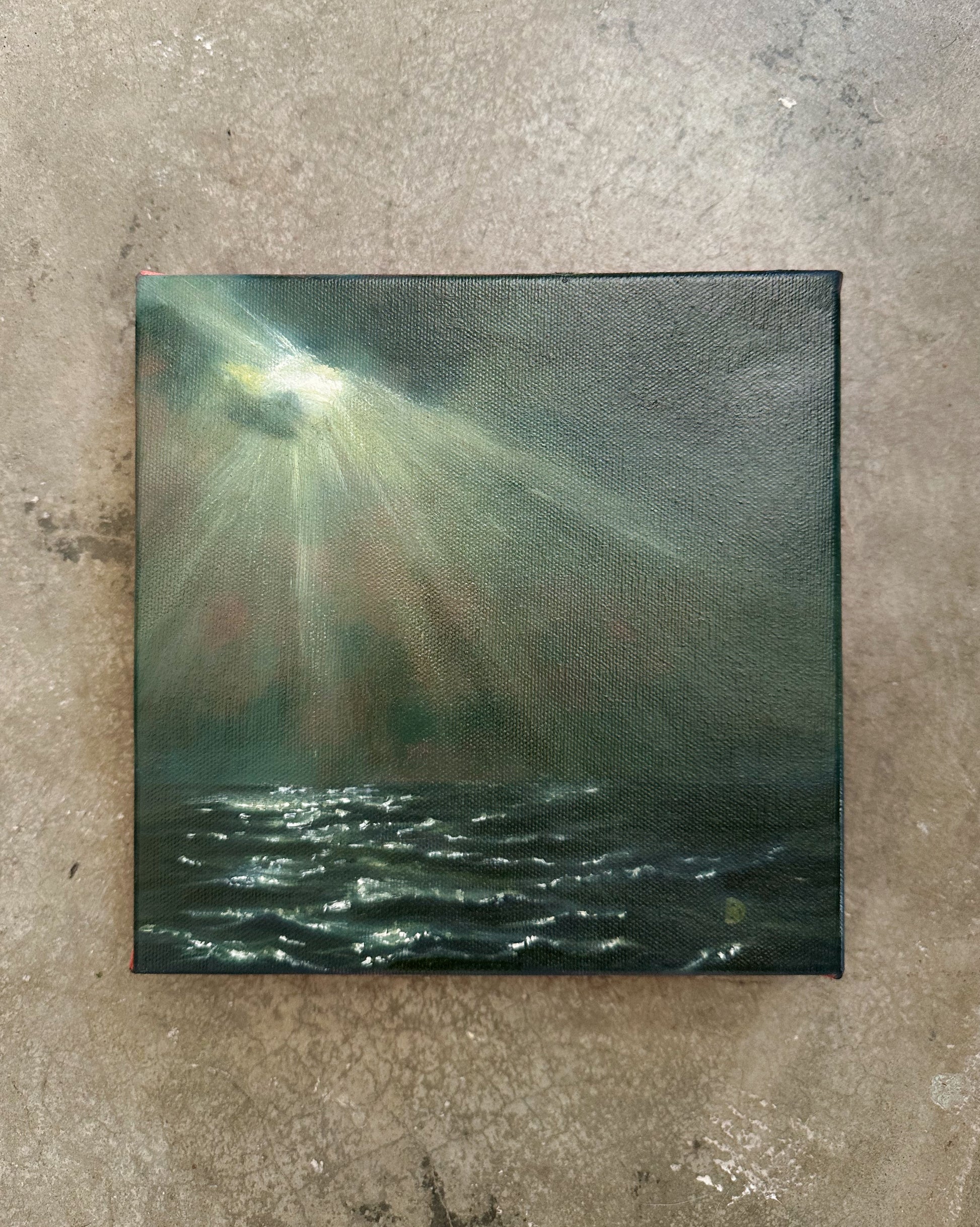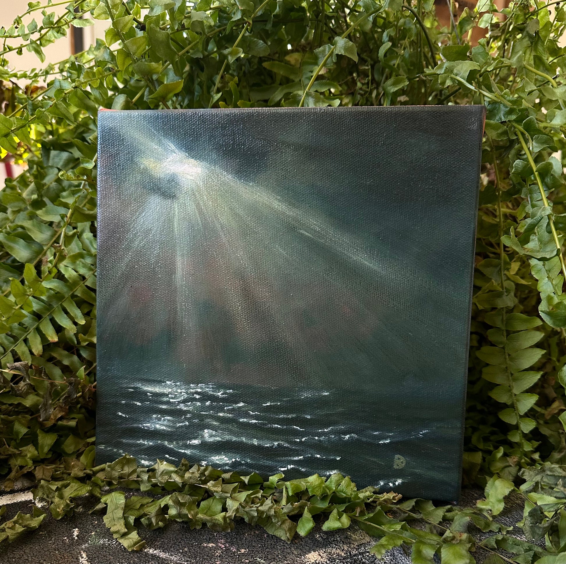 A classic of mine: a stormy seascape with bright light. A symbol of hope through heartache I've painted hundreds of times in different forms at this point, but I won't apologize; they never become any less meaningful. This one features a sparkling sea, and the bright fuchsia underpainting peeks through. I sometimes use this bright pink underpainting because it represents joyful remembrance in the realm of grief.