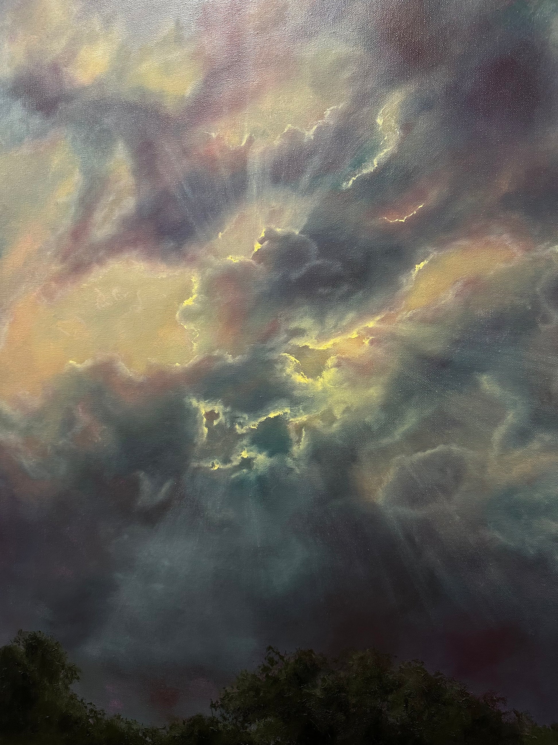 Oil on deep canvas. Large at 4ft x 3ft, unframed with painted sides. Can be hung as-is.